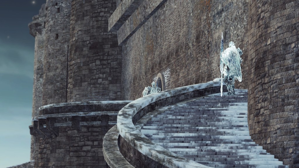 Outfitted with full suits of armor worthy of knights along with shields and lances, the wall defenders were prepared to hunker down against any adversary. They also weren’t restricted to the castle ramparts, with defenders also stationed at certain towers connected to the Knight and Church Towns. Given the similarity to the spires in Church Town, these buildings may have been some kind of shrine or tower of prayer, their isolation allowing for quiet meditation. And because Loyce knights currently occupy those towers, it is reasonable for the city’s living ramparts to safeguard their contemplation. This betrays the hierarchy still in place. Whether or not the defenders can be considered knights, they were definitely subordinate to the Loyce knights serving more closely to their Ivory King.
