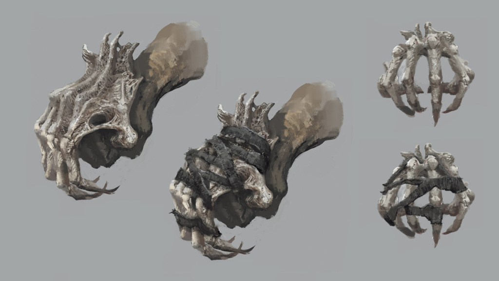 We can also obtain the Bone Fist from the area, the claw bones held together by cloth wrappings. The English description says that it was salvaged from a malformed creature, but the Japanese terminology is more accurately a “grotesque”, (異形) entities who possess a form different from the norm and typically repulsive. Fans of DS1 may recall that life influenced by Chaos were also described as “grotesque”, and these bones allow the wearer to fight with superhuman strength akin to the heftier chaos demons from that game. What local beast would possess that kind of power if not thanks to the Flame twisting life? Indeed, descriptions to various weapons reference “grotesques” generating from Chaos, so there is no doubt that the bones belong to a demon born of anarchic fire. Likewise, ice horses in the snowfields outside Eleum Loyce possess the Bone Fist, insinuating just how widespread these demons once were.