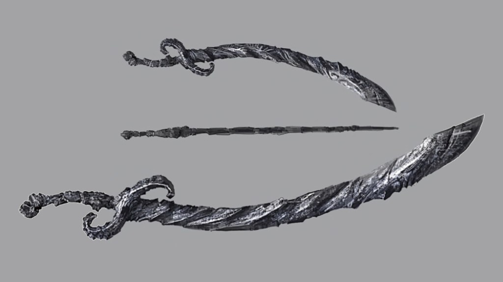 Curved sword created from the soul of Alshunna. Possesses two strange blades and restores an ally’s HP in situations where the strong attack hits an ally.