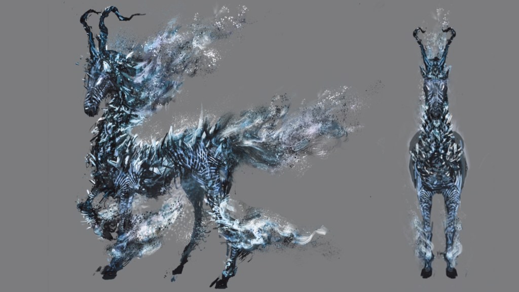 We can be certain that this power of cold derived from her Dark nature. Out of the snow emerge ice golems. Because the humanoids are formed from the frost draping the land, they carry flora like wilted dusk herbs. But they are nonetheless artificial bodies, able to manipulate the cold to reform their arms into various deadly shapes. And if they are golems, they must be animated by souls that existed within the ice crystals. The underlying nature of these souls is evident from the ice horses. Formed in the constant tundra sweeping over the Frigid Outskirts in regular rhythm, the more animal-like form with horns and hooves plus generation of lightning may be due to the demon and dragon bones picked up with the ice — the horse-like kirin is occasionally depicted as a dragon in Japanese mythology and often associated with lightning in popular media. Nevertheless, the ice horse emanates a dark aura. What could be causing this except being steeped in more of those icy winds than the golems in the city? Even Lud and Zallen have garnered this shadowy aura as a result of remaining in the snowfield.