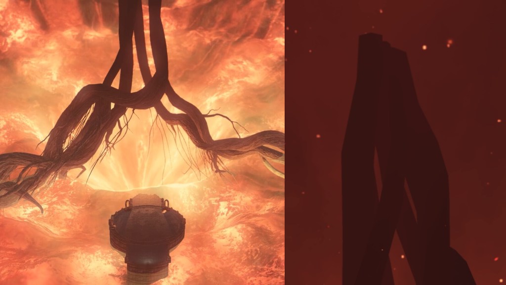 The land seems to be called the northern limit because it is situated at the limits of human civilization, similar to the area of the same name in Demon’s Souls. It is a no man’s land, far north of where people historically settled in Drangleic. And even if there were frontiersmen who would explore that far into the mountains, Alsanna affirms that they were immediately kept away by the “Old Chaos” cursing the land. Hiding beneath the earth, this ancient fire is evidently the same Flame of Chaos from the original Dark Souls. (DS1) The subterranean cavern is a sea of lava endlessly flowing down into a “drain” at the center. Giant tree roots stretch out from the ground on either side of this lava pit, converging at the center to shoot straight up — just like how the roots forming the Bed of Chaos did to eventually grow a massive tree. Moreover, we fight on surviving Izalithian architecture, the ruins somehow still afloat on the cascading lava. Without a doubt, this is where parts of the ruined capital of Chaos ended up.