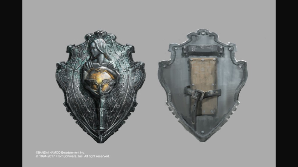 Like the Sunken King, this priest king of Eleum Loyce had a number of priestesses under him. Their dedication to suppressing the Flame of Chaos is reflected in the Vessel Shield, which depicts a priestess cradling a fiery orb contained in a chalice. From the slight heat the shield emanates, that glowing orb embedded in the metal may be an actual fragment of Chaos, which fits with where we find the shield inside a chest within the Grand Cathedral. If they were investigating the means to bottle up the great flame beneath their feet, that might explain some of its powers. Regardless, the shield empowers various physical and mental stats conducive to combat, dramatically enhancing the wielder’s strength and dexterity in particular. The meaning behind the shield is thereby obvious: they were core to the defense against the Old Chaos, both as its primary sealers and the knights’ support.