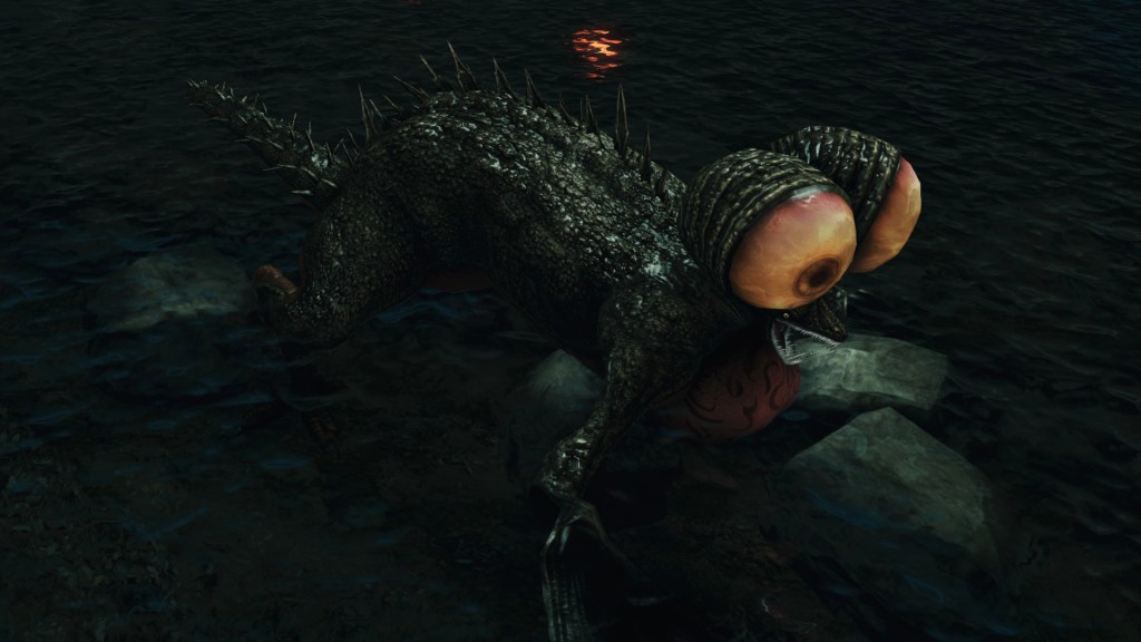 The same holds true for animal life. The petrifying basilisks make an unwelcome return, generally appearing in humid locations as was their preference in DS1. Some of the lizards have grown far larger than any encountered in the prior game, but this can be attributed to their longevity, as was seen with the great grey wolf Sif in DS1. Less reconcilable are the basilisks encountered in dry areas, namely Tseldora. Unlike their counterparts in wetland, this variant lacks the comically large vestigial eyes for disarming prey. Instead, the bulbous ornaments have shrunk to accommodate the creatures’ attempt to ambush prey after burying their bodies in the sand. Clearly, the basilisks’ freedom to spread across Drangleic begot a new species, beasts changing with the time and place. Who knows how many organisms caught up in the Great Shift have since evolved into forms unrecognizable or gone extinct.