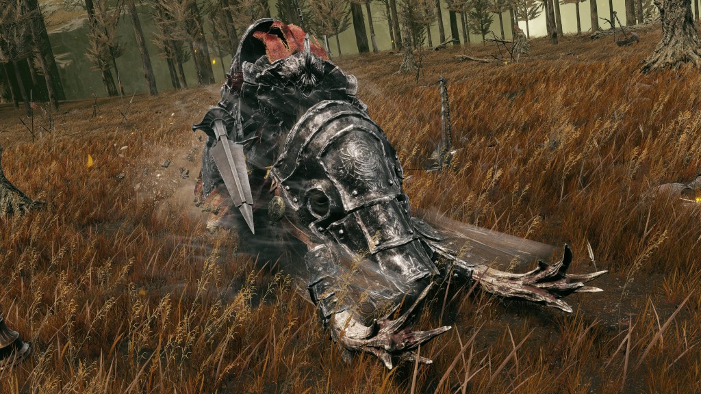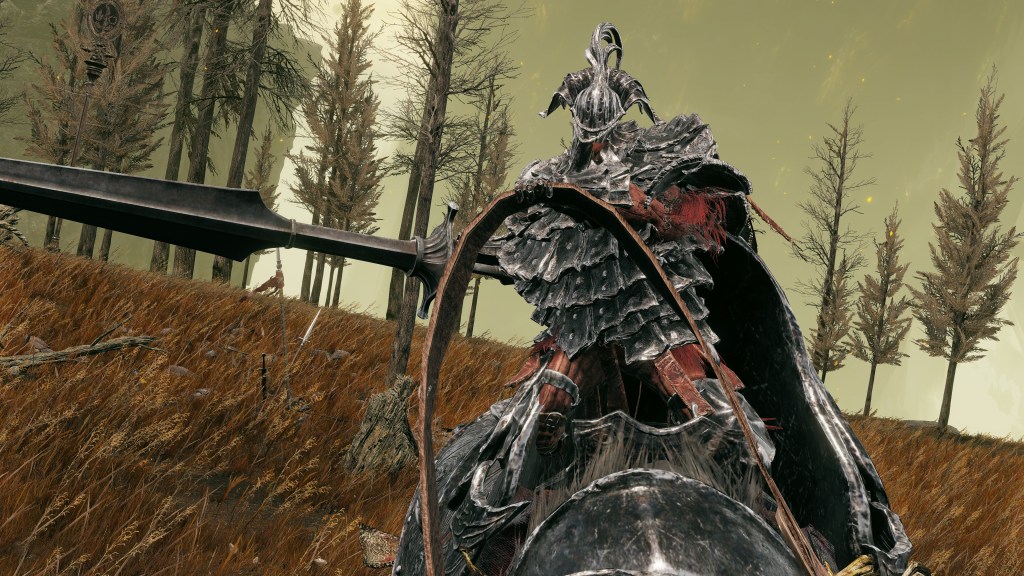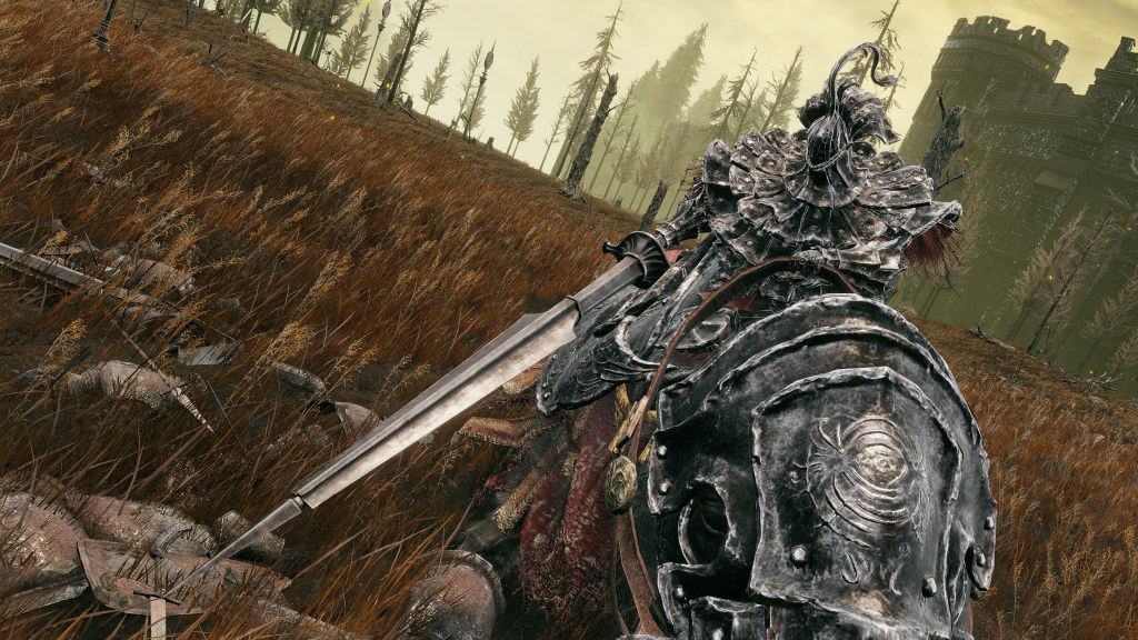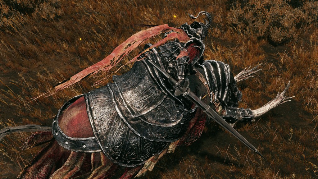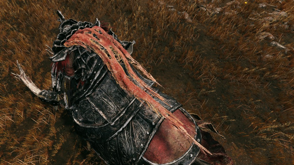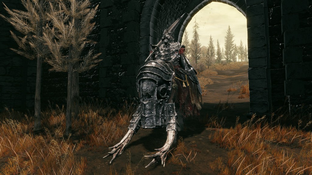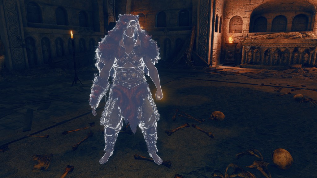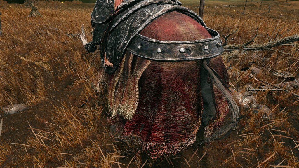 Indeed, Radahn appears to have not been too concerned with seeing the whole inspection team again. The one royal guard knight stayed until perishing out in the field, leaving only ashes of war. Red Bear similarly forgot his name, lost to the madness of bear communion. As a red lion, the surveyor evidently decided to measure himself against an actual wild animal, specifically the red bears. And after killing his first in a brutal life-or-death battle, the bloodied warrior became so enthralled with their naked power that he wants to become a bear. To that end, he has stripped down to simple iron-riveted armor to cover himself in bear skin; even his new helmet, bearing the last remnants of his Redmane past, has since been replaced with a pelt. Such devotion has rewarded the man a red bear’s roar, but at the cost of becoming a thoughtless berserker. Others in the inspection team may have returned with a report, but clearly, they were all free to linger at their leisure. The general was thus probably satisfied if Gaius found happiness in shadow.