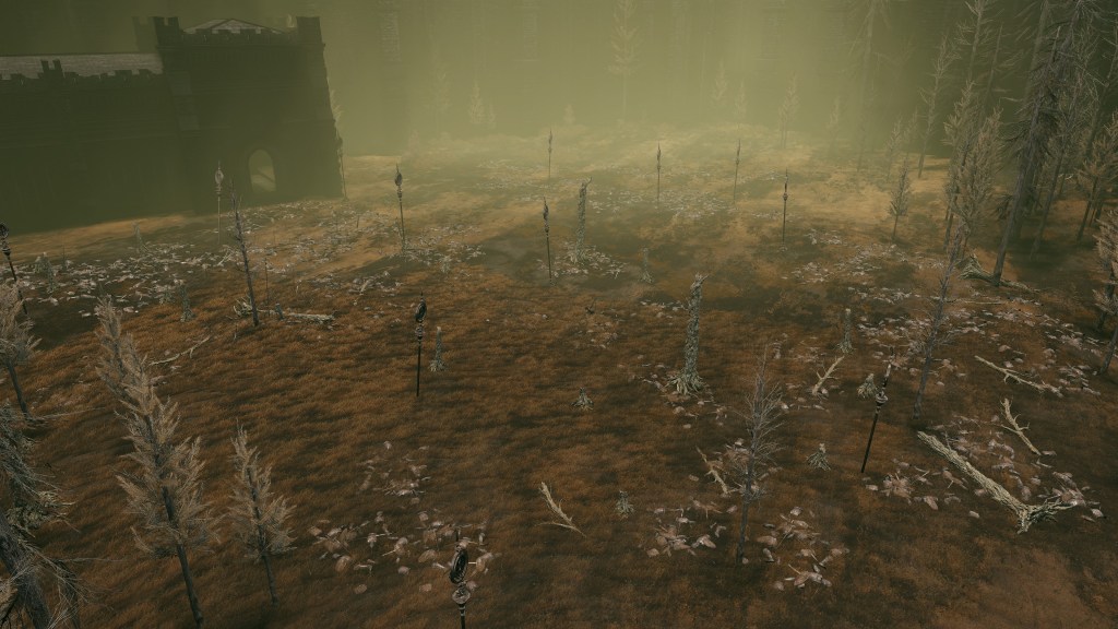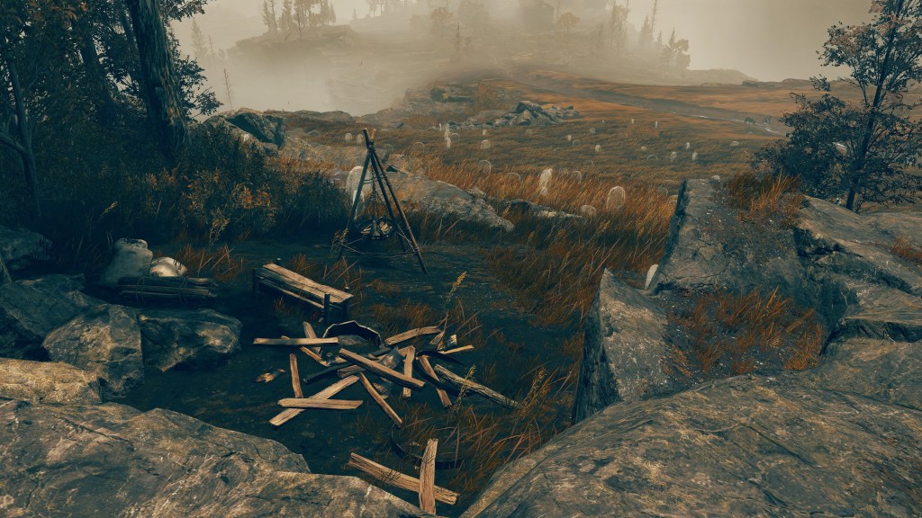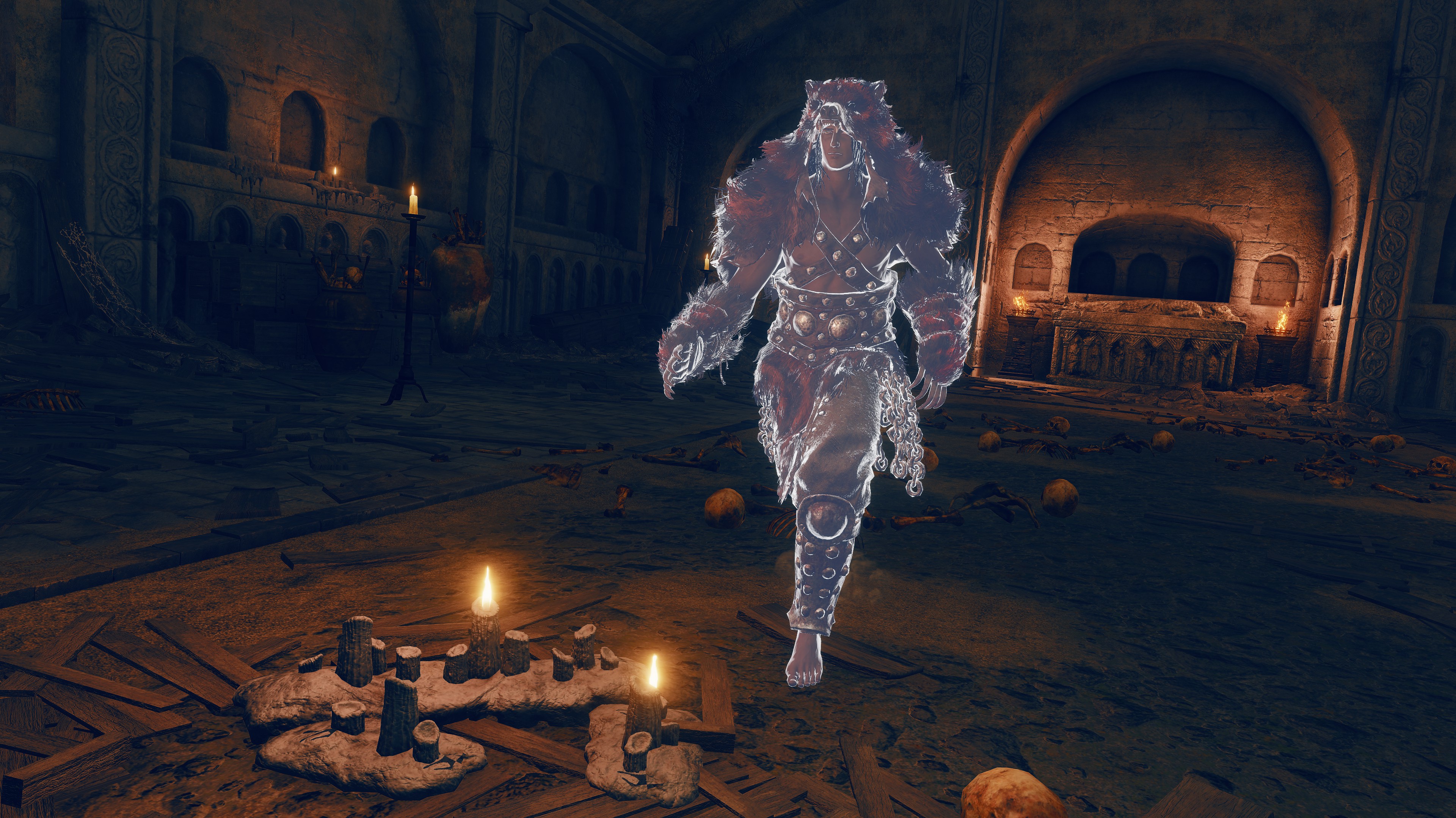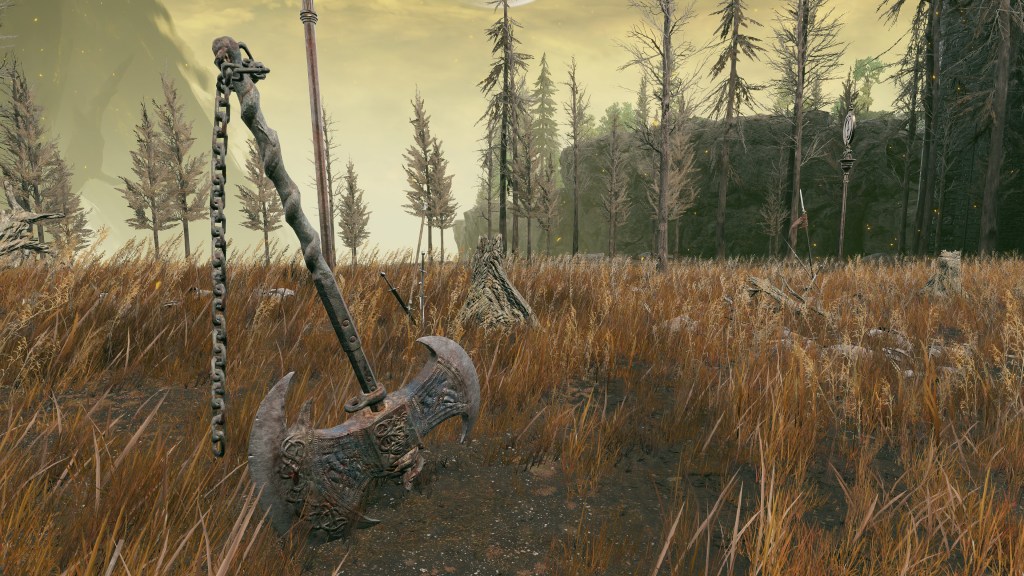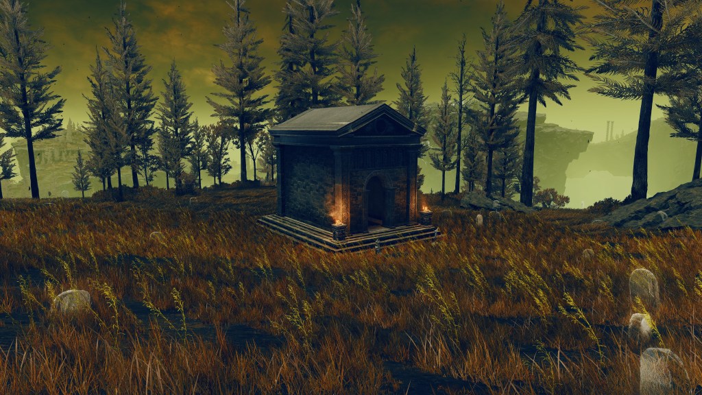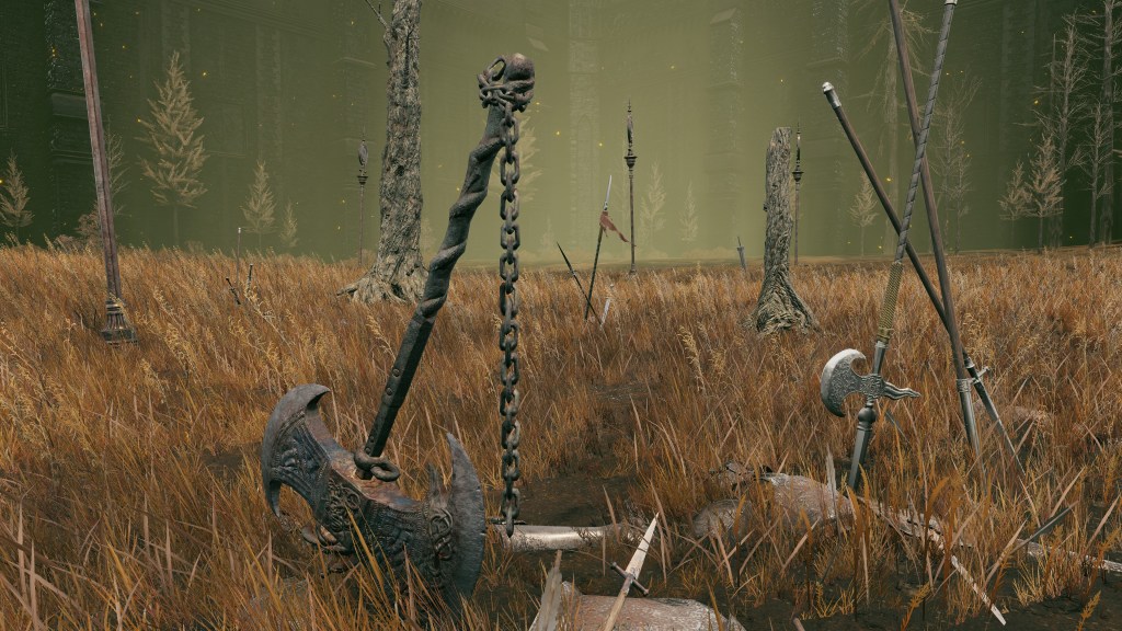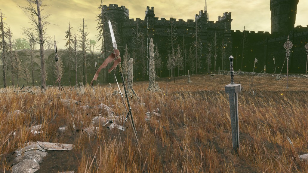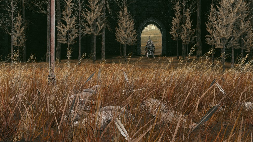 Indeed, Radahn appears to have not been too concerned with seeing the whole inspection team again. The one royal guard knight stayed until perishing out in the field, leaving only ashes of war. Red Bear similarly forgot his name, lost to the madness of bear communion. As a red lion, the surveyor evidently decided to measure himself against an actual wild animal, specifically the red bears. And after killing his first in a brutal life-or-death battle, the bloodied warrior became so enthralled with their naked power that he wants to become a bear. To that end, he has stripped down to simple iron-riveted armor to cover himself in bear skin; even his new helmet, bearing the last remnants of his Redmane past, has since been replaced with a pelt. Such devotion has rewarded the man a red bear’s roar, but at the cost of becoming a thoughtless berserker. Others in the inspection team may have returned with a report, but clearly, they were all free to linger at their leisure. The general was thus probably satisfied if Gaius found happiness in shadow.