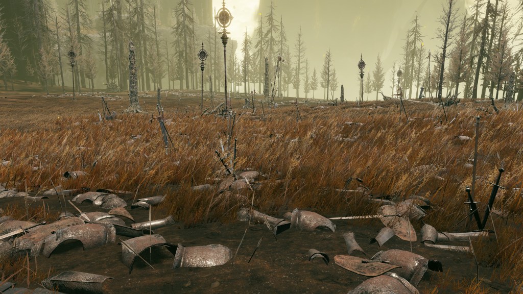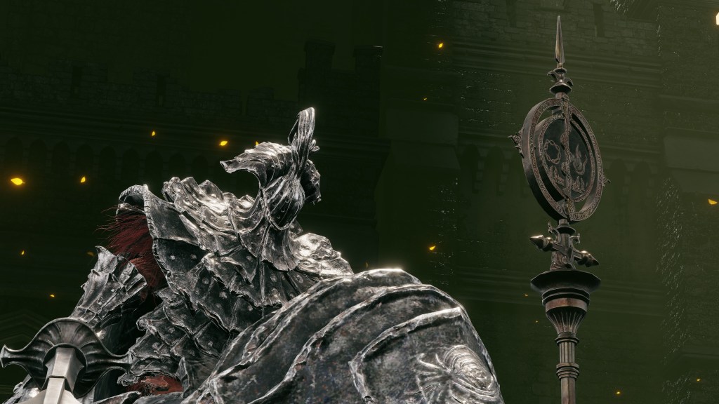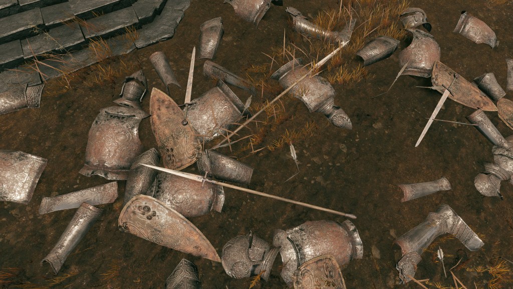 Of course, the cursed prince still needed to play politics. When we enter Gaius’ boss room, we find it filled with the arms and armor of Banished Knights, exile soldiers, arena duelists, and more under Messmer’s sign poles. A commander requires an army, and the circumstances suggest that this was the sorcerer lancer’s army. Since his regular forces were no keener to follow the orders of an Albinauric, Messmer placed Radahn’s knight-in-everything-but-name in charge of the fellow misfits drafted into service, creating a new unit of slave troops to command. These janissaries might have been regarded as a lower caste by the main army, but Gaius was still supplied the opportunity to showcase his skills at the lead of a whole battalion, just like his former master. He definitely has some battlefield experience since he is specifically referenced as a “veteran” commander like Niall and O’Neil. By all indications, he was happy to receive even this much acknowledgement for all his efforts. In fact, Radahn might have always intended his servant to retire as this warrior free to seek fame in anonymity.