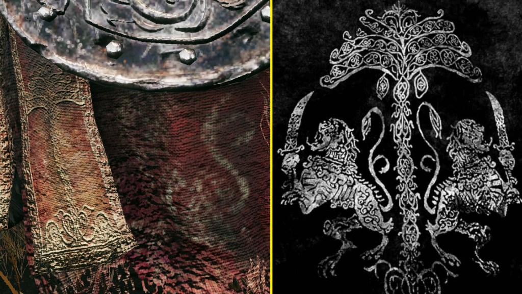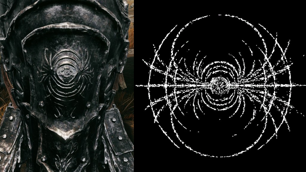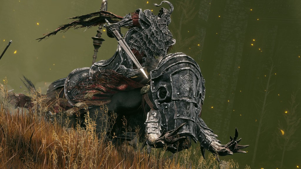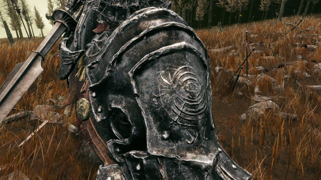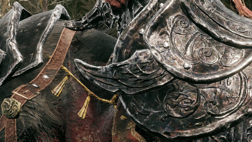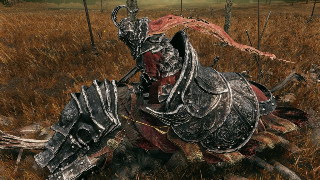 This made Gaius and Gaea an impressive team and a valued part of the later general’s army. Both warrior and steed wear black iron armor with fang designs over red cloth and hair like Redmane Knights, the boar’s caparison in particular featuring the same lion and tree designs as Radahn’s cloak. Already that demonstrates their place in the prince’s inner circle, which is only furthered by the Albinauric’s armor being made to resemble a fallen seed — specifically, a pine cone — beginning to sprout. Even if he wasn’t born by the grace of the Erdtree, the Starscourge still considered his senior an estranged son of gold, a Carian offshoot setting new roots under its umbrella. This makes the stylized gravity sigil emblazoned on Gaea’s helm take on a new meaning for Radahn. Gaius was that seed which allowed the Starscourge to flourish, and he would always be grateful. Yet despite commissioning such unique armor to honor his classmate, the army man doesn’t appear to have bestowed the silver warrior with actual knighthood.
