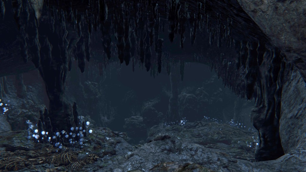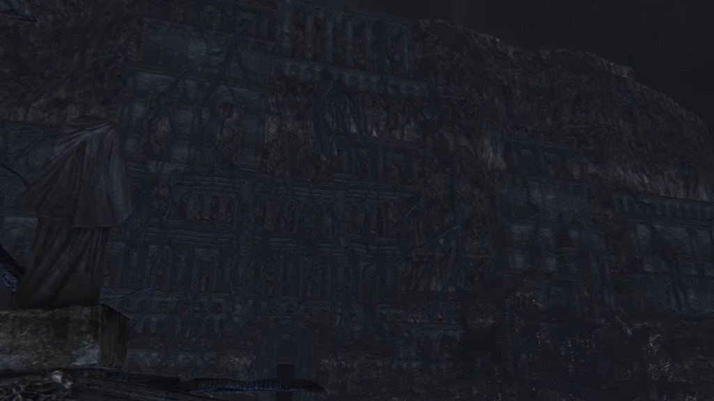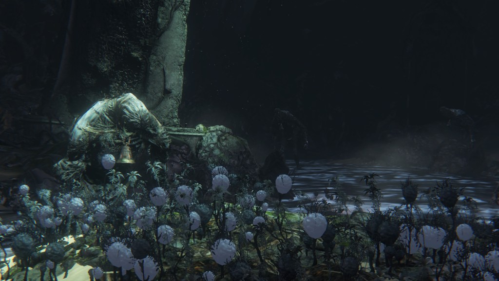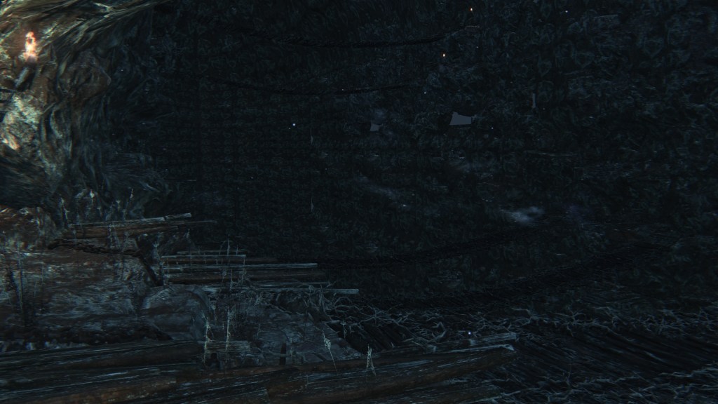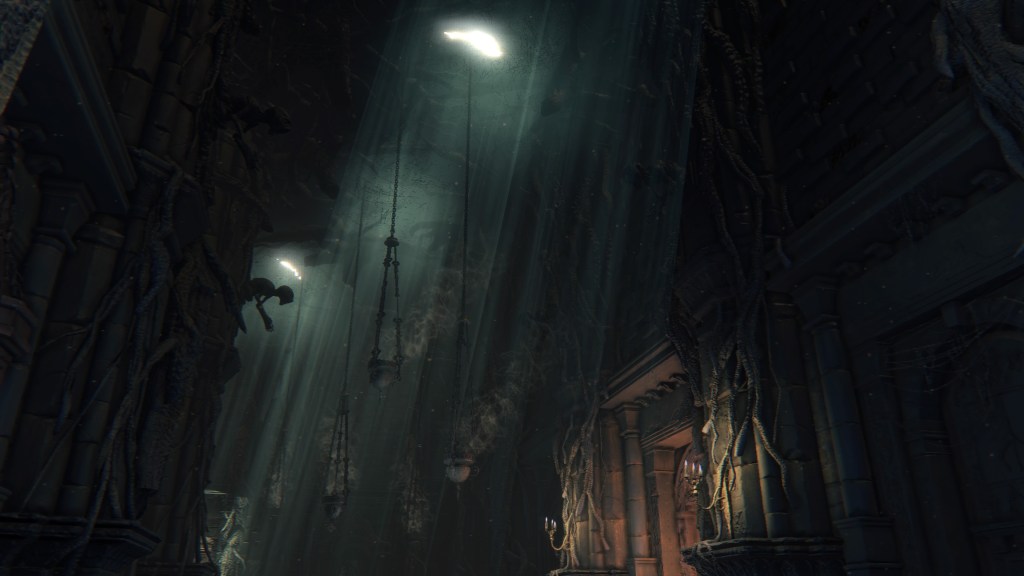 All this casts doubt on us visiting a physical place operating on the same plane as Yharnam. At the same time, there is no denying that these ruins exist beneath the capital. From the Forbidden Woods, we can enter a cavernous aquifer. The hollow takes us just below ground level, yet we find tomb mold growing down there. Admittedly, the corpse-ridden cave replicates the conditions to grow this fungus associated with the divine graveyard, but there are also raggedy church giants meandering about, not too dissimilar from the undead giants we can encounter in the Chalice Dungeons. Joining them are the exact same parasitic insects crawling around certain dungeons. Taken altogether, the cavern most likely possesses some unseen connection to the underground ruins, an opening in the earth from which the mold spread and stray enemies wandered out. While the game doesn’t permit us to climb into the labyrinth from this same hypothetical opening, its location must lay just below the subterranean aquifer’s level. And by heading up a long ladder, we exit the cave for Iosefka’s Clinic in Yharnam.