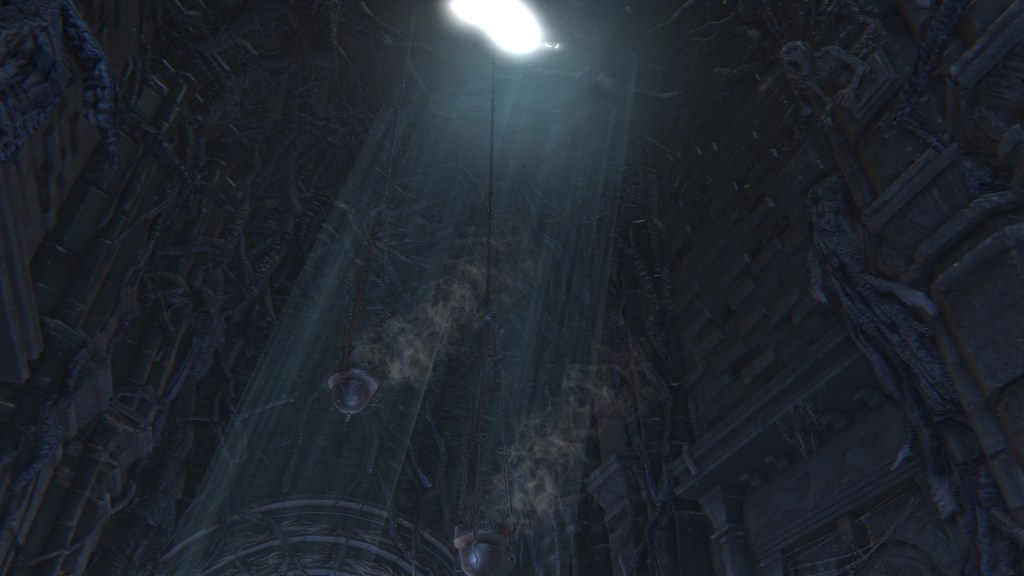 For even less explicable peculiarities, we can use cursed chalices or offerings to additionally modify the dungeon we enter or the enemies encountered within. The latter makes sense in abstract, some offerings exuding an odor meant to attract foes who otherwise wouldn’t be drawn to that part of the ruins. But how do enemies in ruins underground smell an offering laid upon a grave altar in the Hunter’s Dream, another dimension? This must also take into consideration the actual parts of the dungeon we explore, the Loran and Isz dungeons each featuring a large canyon with the sun pouring in from high above. This is a strange landmark when no such gorge is visible anywhere in the vicinity of Yharnam, let alone multiple with colors differing depending on the dungeon. How then can it be part of the gods’ tomb situated directly underneath, even assuming that the complex extends beyond the city limits?