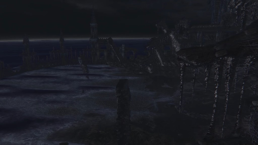 Granted, time travel alone doesn’t explain how we are able to kill these bosses in the past and still meet them in the present. Moreover, our venture through time can only take us a limited period back. One could reasonably date the aforementioned canyons to a more ancient era long before Yharnam was built, explaining the discrepancy. After all, Loran disappeared into the sands which litter its ruins, but no desert exists in Yharnam today. It is perfectly feasible for climate change to reshape the landscape over eons, turning mountains and valleys into desert and eventually a more temperate region with lush forests and vast bodies of water. And yet, the names and equipment of the various hunters we can summon within the dungeons invariably traces them to modern times, with many appearing insane in those same ruins. Some of these hostile doppelgangers might be generic stand-ins for their faction, since multiple occasionally exist within a single dungeon, even a single chamber. But obviously, if they are alive to explore the various parts of the labyrinth until going mad, then the events we witness can only be from the recent past, mere decades at most.