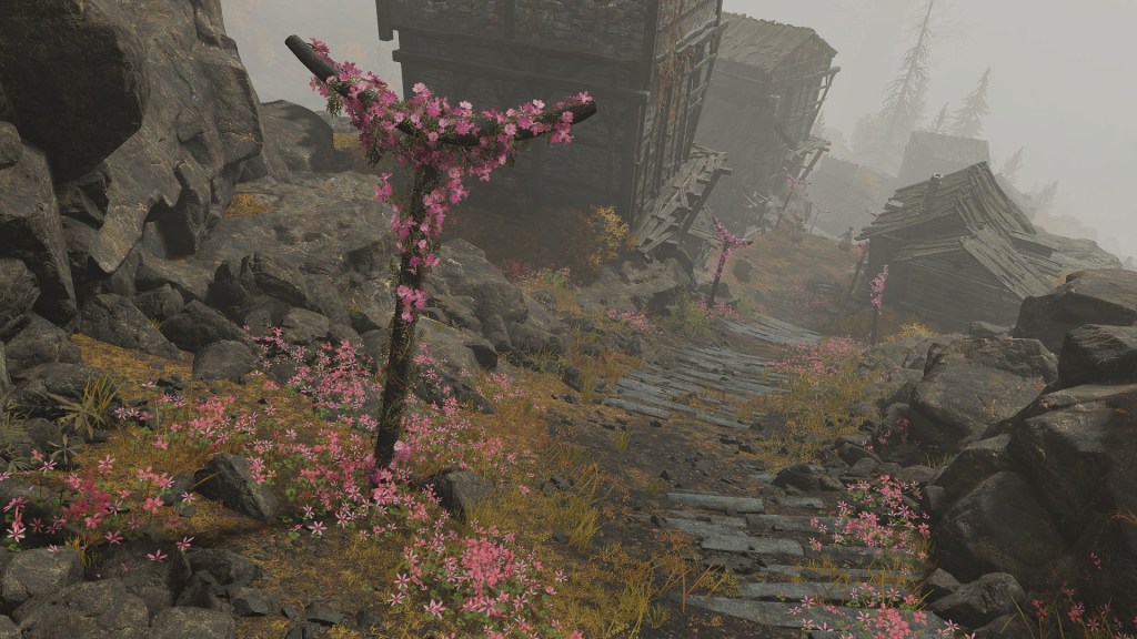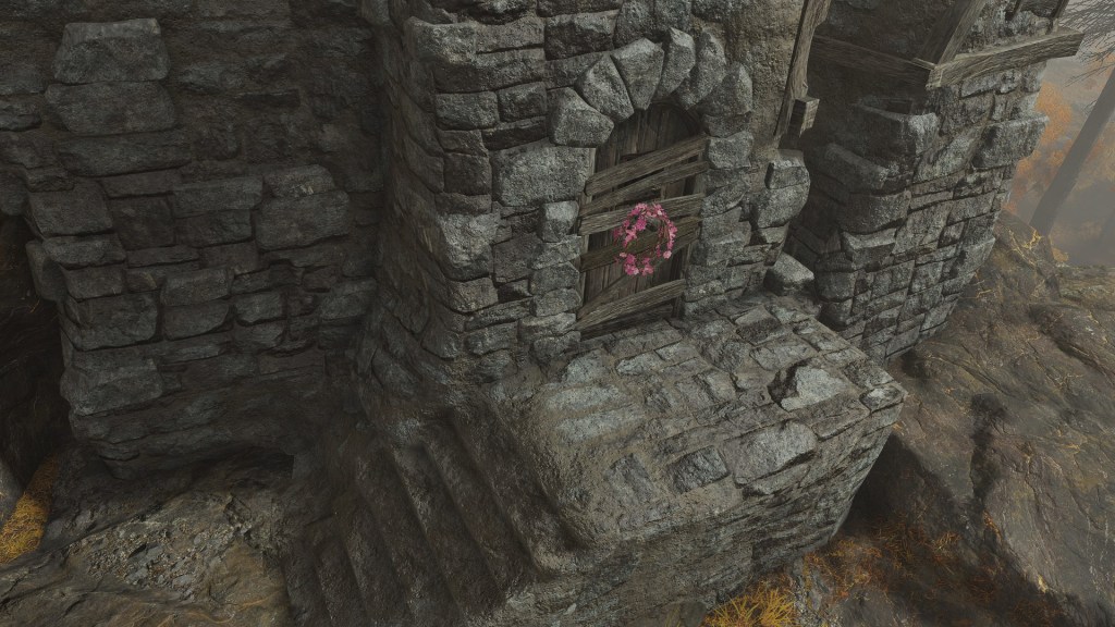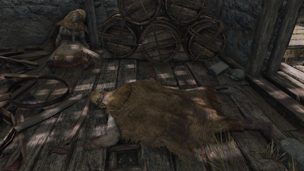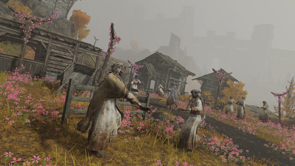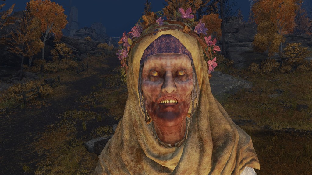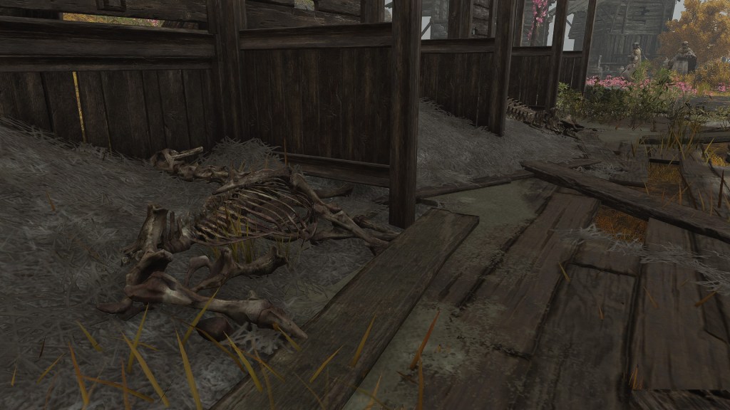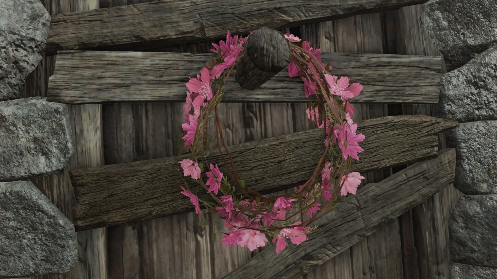 All of this is done as part of the festival. A male spirit in the hamlet cowers from the reveler’s song for fear of being skinned alive. We do see village women dance around a burning pile of skinless, rotting enemies at the East Windmill Pasture. This handful weren’t the only ones, as more of the rotten can be found in a nearby pond, mostly laying their full bodies in the waters now growing bloodroses. Without question, many men were rounded up and skinned alive, their enduring flesh left to rot in imprisonment before their mutilators finally decided to cook their meat. Some managed to run straight for the pond to put out the flames, but as the one curled up in despair shows, with still no hope of escape. This depraved cannibalism ritual is why we see so many women dance around crosses draped in local pink flowers. The same flowers hang as wreathes on the villagers’ heads or doors. That serves as a sign of celebration as well as of mourning, a wreathe representing the cycle of life — which takes on a more ominous meaning in the context of these festivities. In short, the women are giving a cheery sendoff to those they sacrifice.