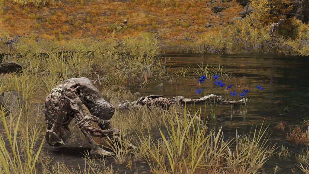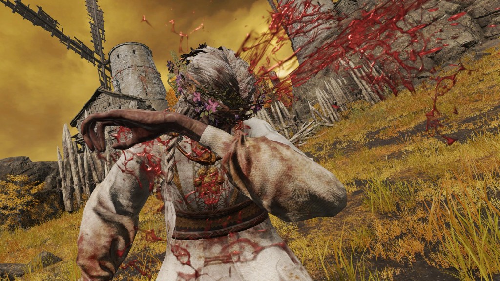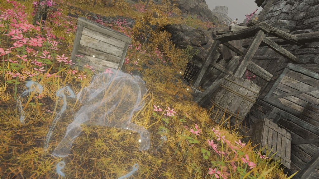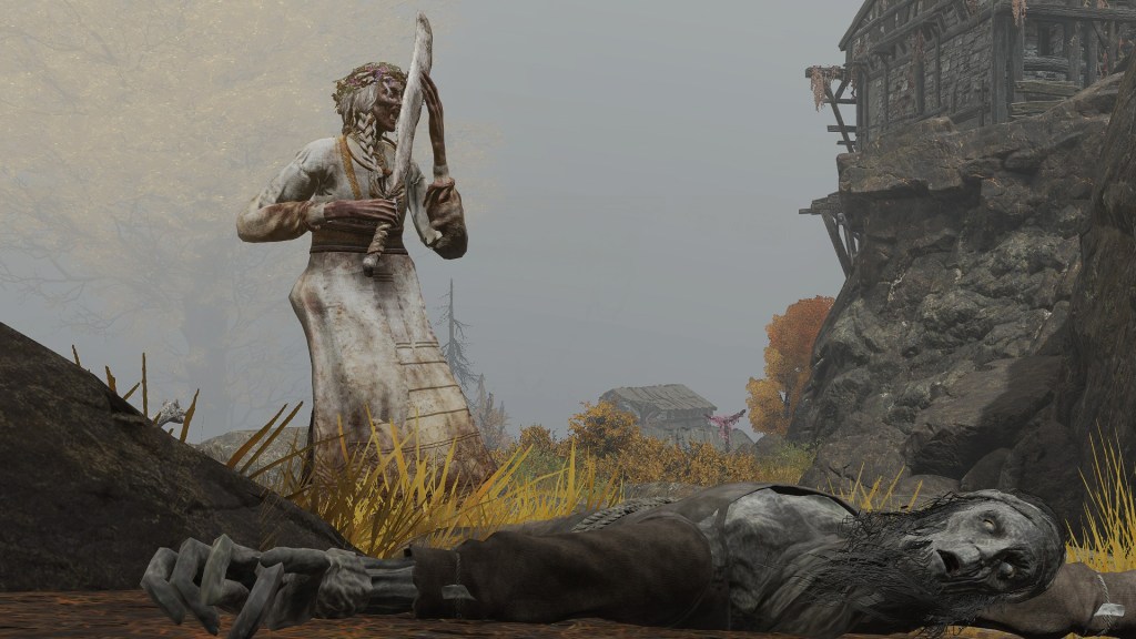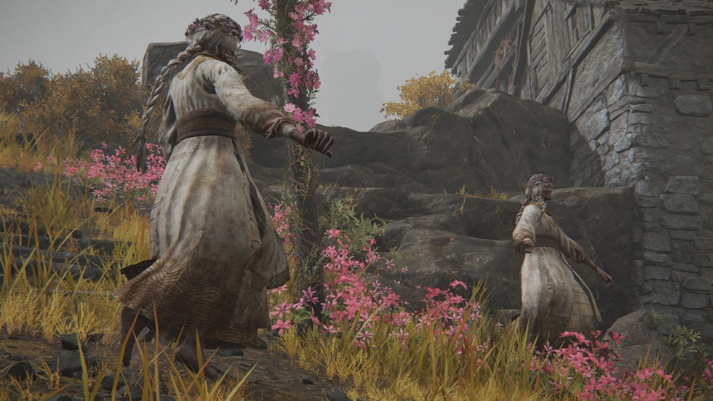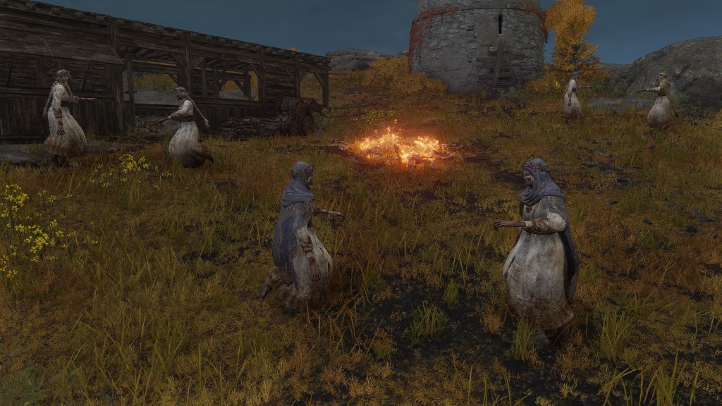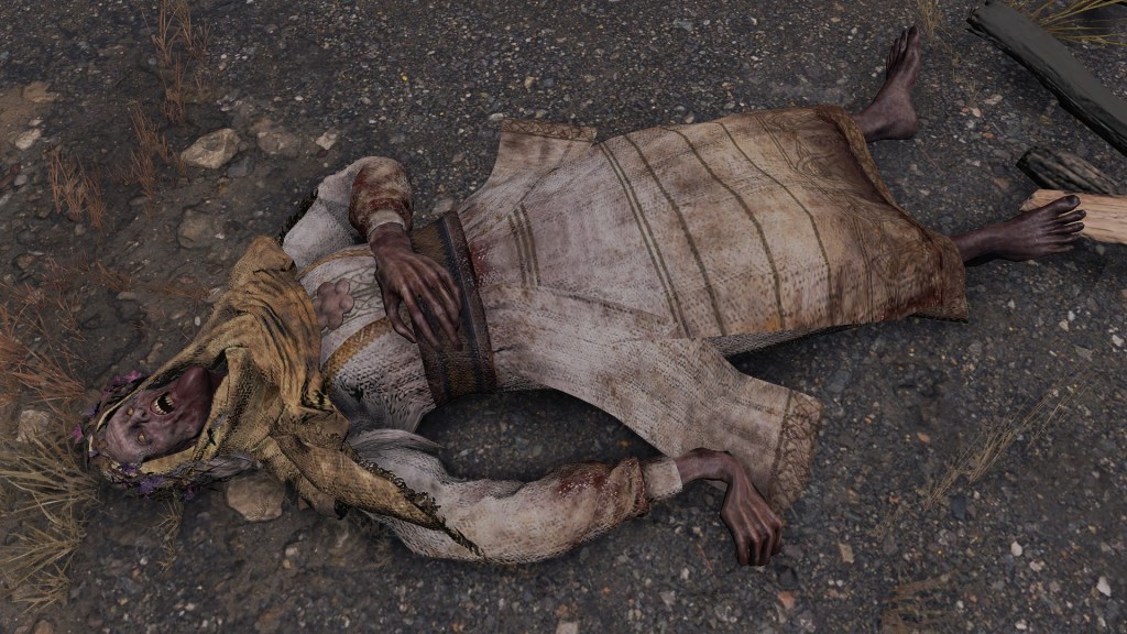 All of this is done as part of the festival. A male spirit in the hamlet cowers from the reveler’s song for fear of being skinned alive. We do see village women dance around a burning pile of skinless, rotting enemies at the East Windmill Pasture. This handful weren’t the only ones, as more of the rotten can be found in a nearby pond, mostly laying their full bodies in the waters now growing bloodroses. Without question, many men were rounded up and skinned alive, their enduring flesh left to rot in imprisonment before their mutilators finally decided to cook their meat. Some managed to run straight for the pond to put out the flames, but as the one curled up in despair shows, with still no hope of escape. This depraved cannibalism ritual is why we see so many women dance around crosses draped in local pink flowers. The same flowers hang as wreathes on the villagers’ heads or doors. That serves as a sign of celebration as well as of mourning, a wreathe representing the cycle of life — which takes on a more ominous meaning in the context of these festivities. In short, the women are giving a cheery sendoff to those they sacrifice.