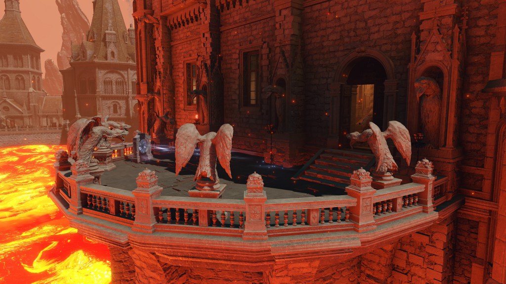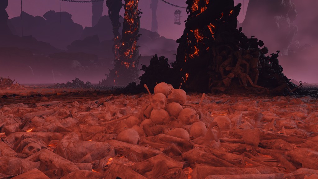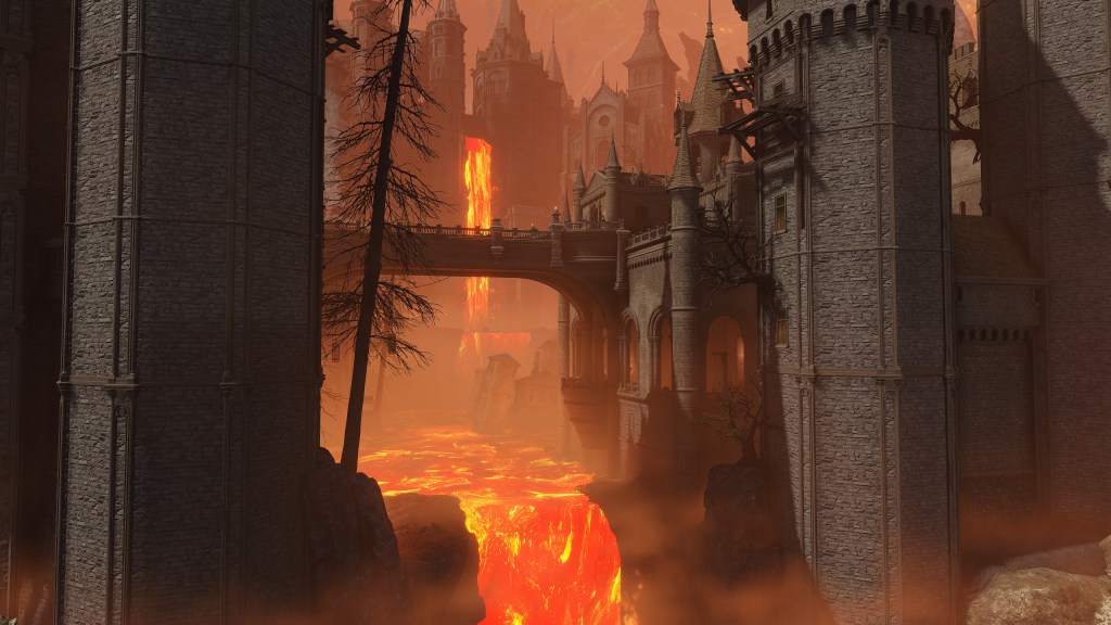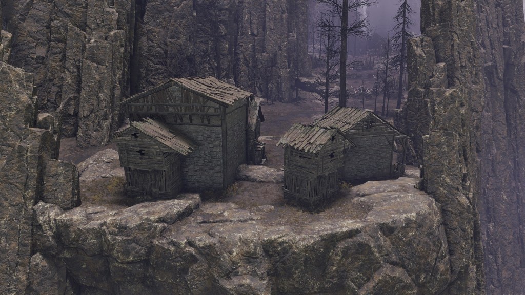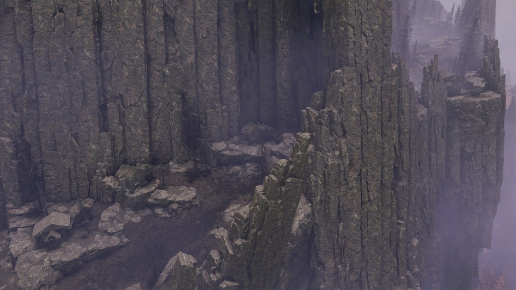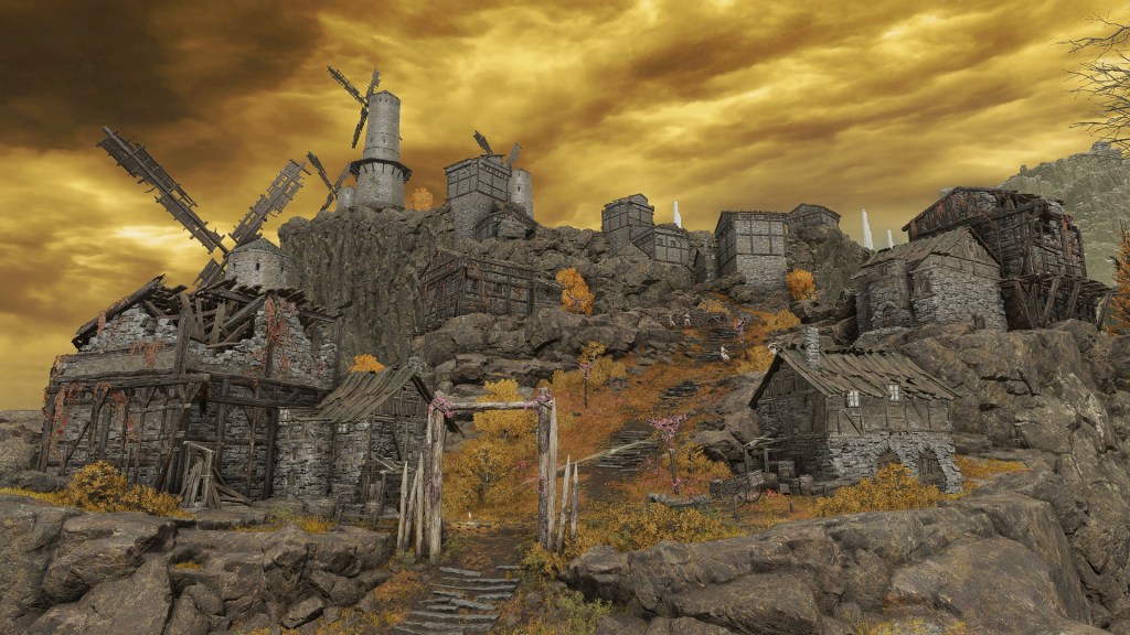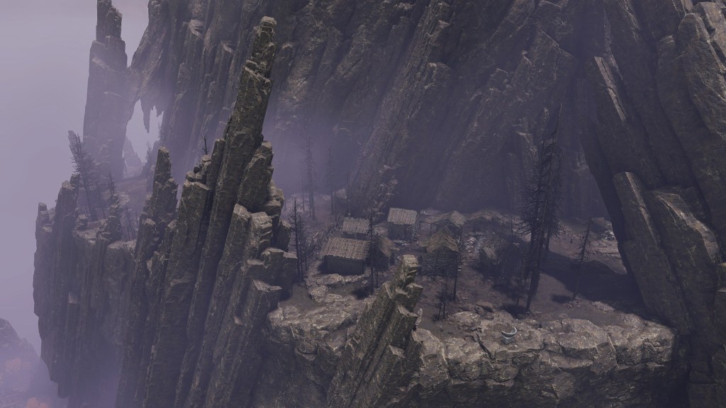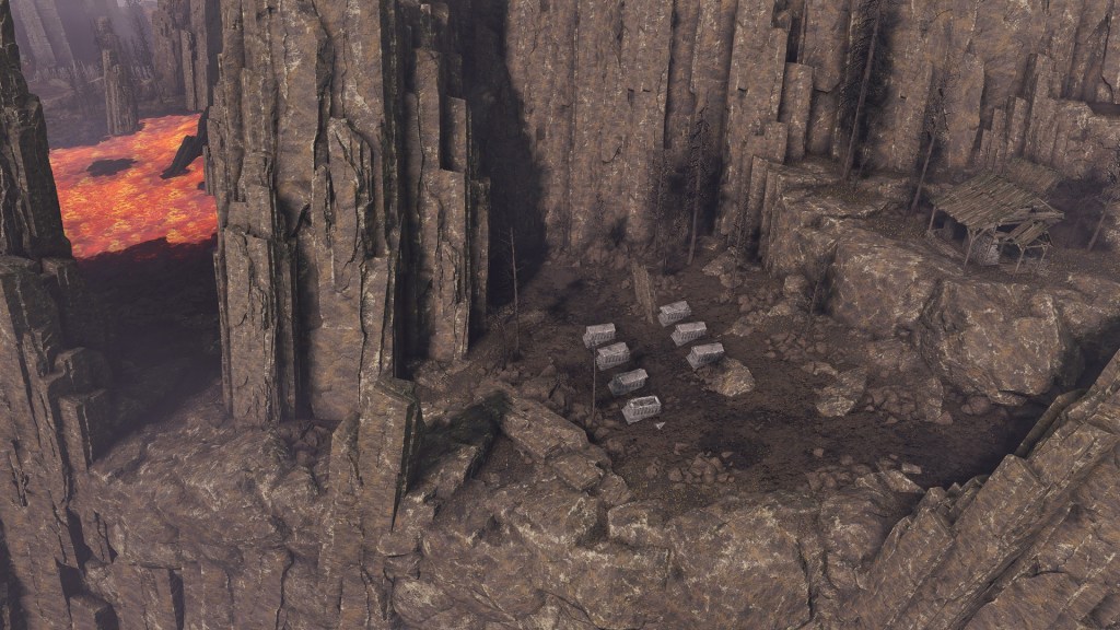 The Hermit Village roosts on the south crag of the volcano, though collections of similar dwellings extend around to the western side. True to its name, it is a reclusive sort, accessible solely by crossing the steady volcanic outflow beyond the Seething River. And yet, the corpses littering the place are the same women seen in Dominula. Although we find no flowers draped upon doors or crosses to coincide with their ceremonial dress, that may due to lack of availability on a volcano. The women, at least, still wear some, and this Hermit Village definitely has the same style of housing; the main difference is the lack of windmills, large herds of sheep within the confines instead indicating a more pastoral lifestyle. Altogether, it suggests a cultural connection between these hermits and Dominulans, and thereby Dominula and Gelmir. In fact, the “hidden” location by the lava may be intentional.