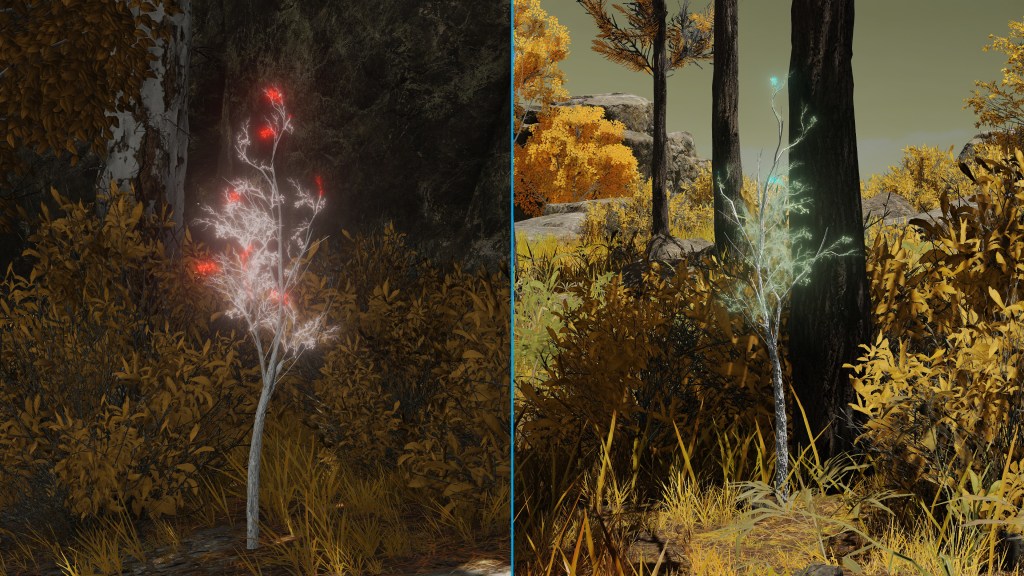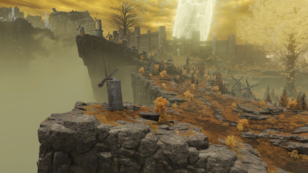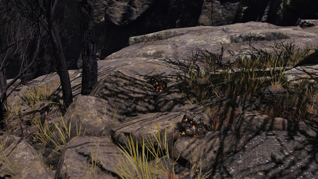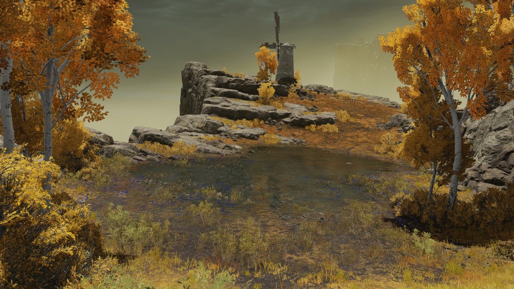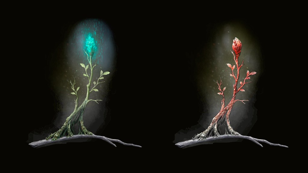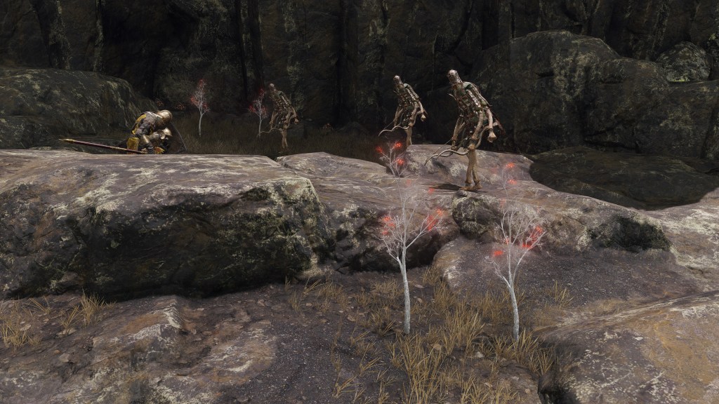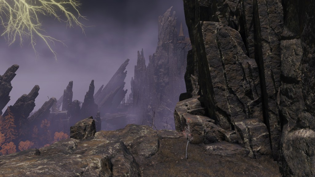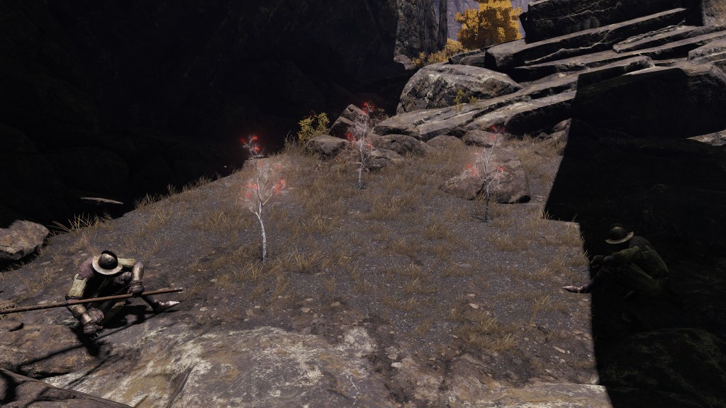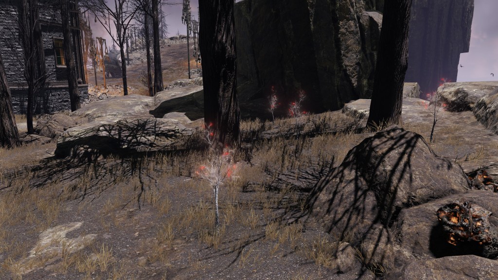 Having helpers only serves to the deity’s benefit, which is presumably why it has never simply devoured them like the rest — let the ignorant fools enjoy their trinkets, while the crafty serpent slowly grows to devour them all come the end times. The land has certainly become drenched in blood because of this history. Besides volcanic stones, Gelmir is plentiful with sacramental buds, with some more growing on Altus at the foot of the mountain. This harvestable item is generally associated with youthful holy blood which causes the newborn tree soaking it up to remain a sapling. And yet, its appearance on the volcano is irregular. Typically, the bud grows either in huge concentrations at specific areas within Altus or Caelid or in sparse amounts sparingly across those same lands; on Gelmir, it is mostly in groups of three or four. Moreover, the model and menu graphics of it and crystal bud nigh match, sans the color. In other words, sacramental buds can effectively stand in for red glintstone buds. And red glintstone is what Gelmir’s sorcery staves embed at the tip to enhance their lava sorceries.