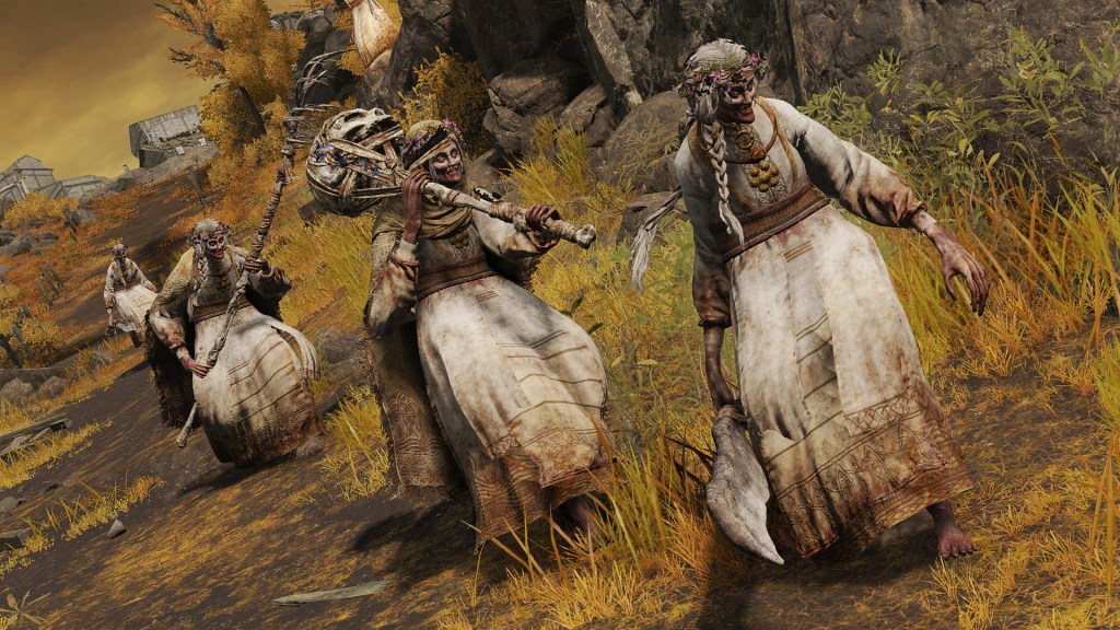 Across the northeastern ridge of Altus lies the humble village of Dominula. With a Latin name meaning “mistress”, women hold a particularly special role in this place. This is because, even as the community uses the south-flowing winds from the Mountaintops to operate grain mills with harvest wrought by their plows and sickles, it prefers meatier delicacies. The hamlet maintains a number of horse pastures, though its livestock have long since starved to death and been stripped clean by the local canines. Meanwhile, the women simply enjoy their traditional festivities, singing and dancing in ceremonial dress. Yet despite the innocent revelry, one need not go far off the beaten path to find a village woman with a cleaver chowing down while standing over a dead man. Indeed, these ladies all have blood staining their mouths and clothes, their tools crafted with bone — not just the farming equipment, but the hatchets and hammers used for preparing game as well, and even their lanterns. The women are cannibals and, given the gender disparity, maneaters in every sense.