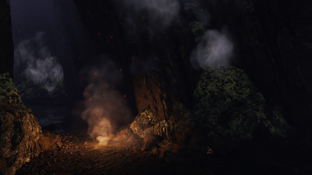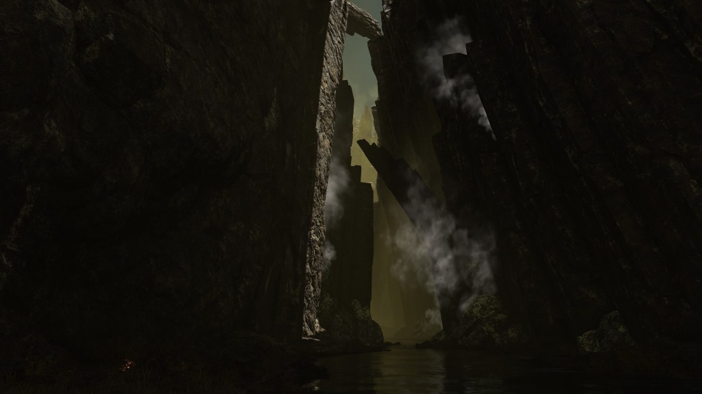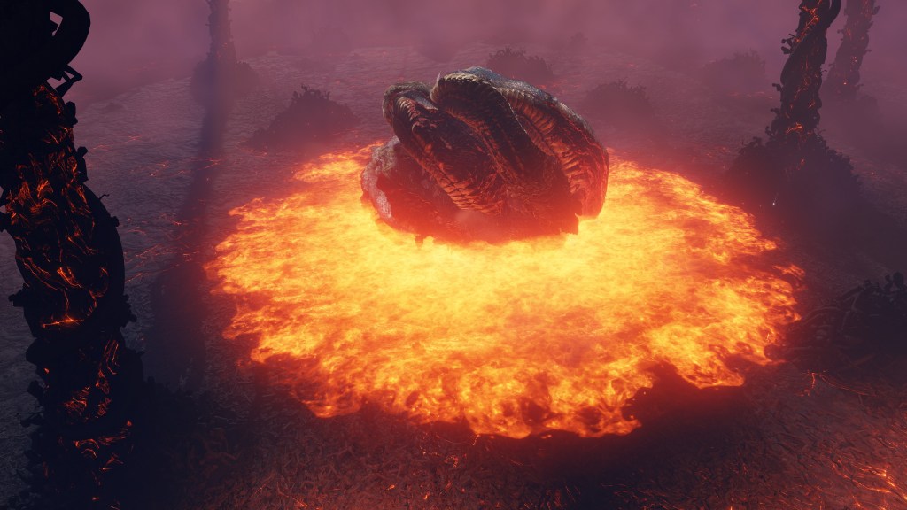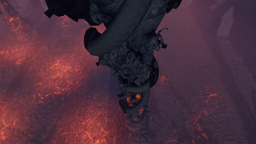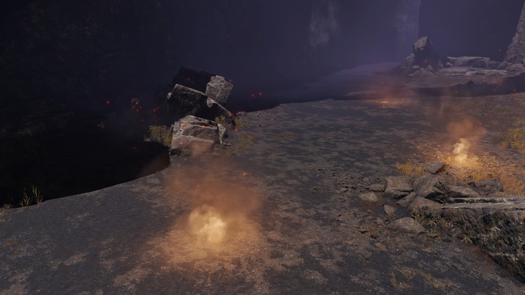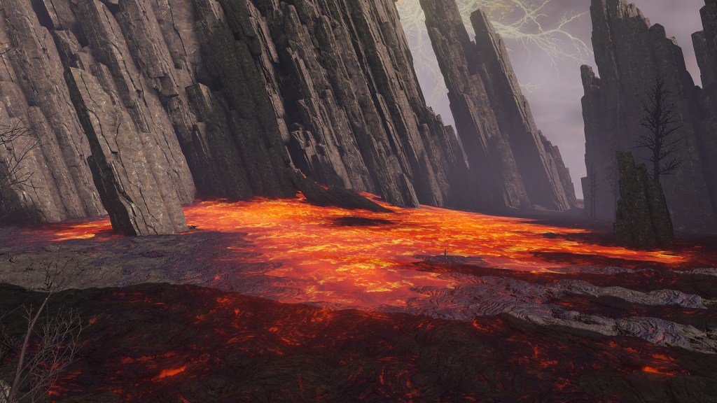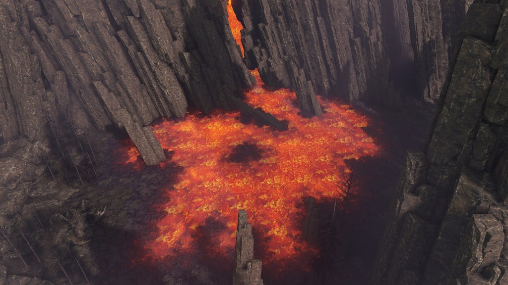 In growing to such size, the serpent produces the lava flowing from the volcano. We can see how its body instantly melts whatever rock it slithers across, creating a constant pool of magma around it. The long-term presence has evidently scorched the god’s entire lair, the blackened stone, flesh, and bone still lingering with molten heat. The boss room is likewise located beneath the source of magma spouting out from the summit; the waygate to said boss room pointing toward these welling emissions from a balcony covered in snake statues emphasizes the connection. Therefore, it is body heat which rises to permeate the mountain rock. Besides turning the stone overhead into magma, it warms up the whole region, hence local fieldstones containing hot gas. This high-temperature gas leaks out of not just peaks but even valleys like the Seething River, named for the vents regularly spouting especially fiery vapors. The land has even formed sulfur deposits because of this volcanic activity.