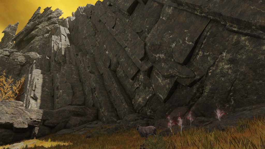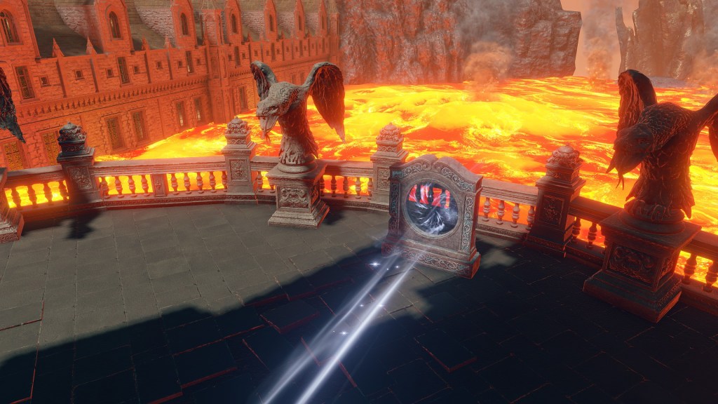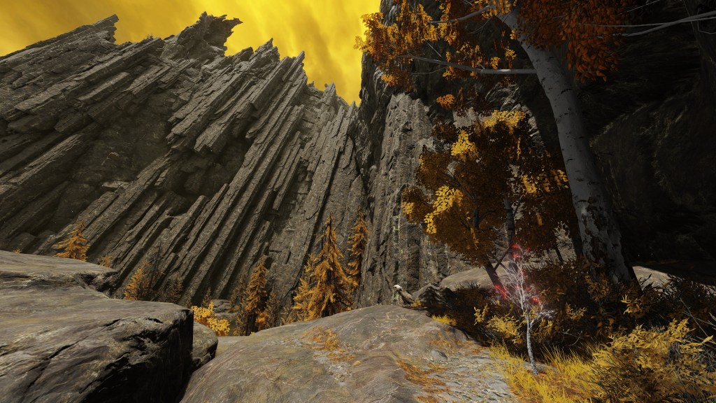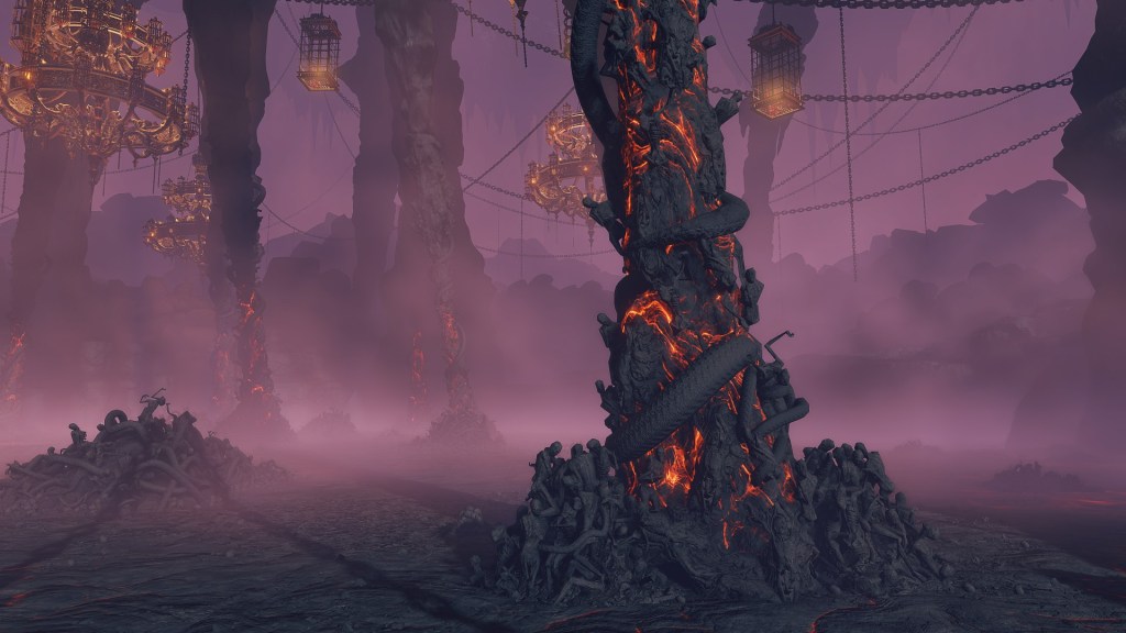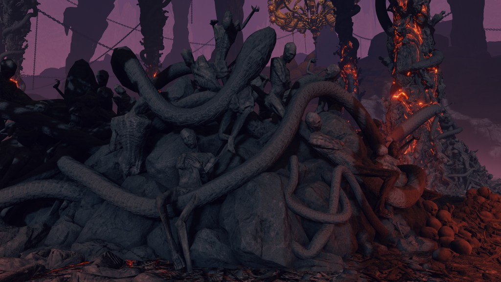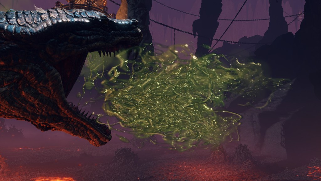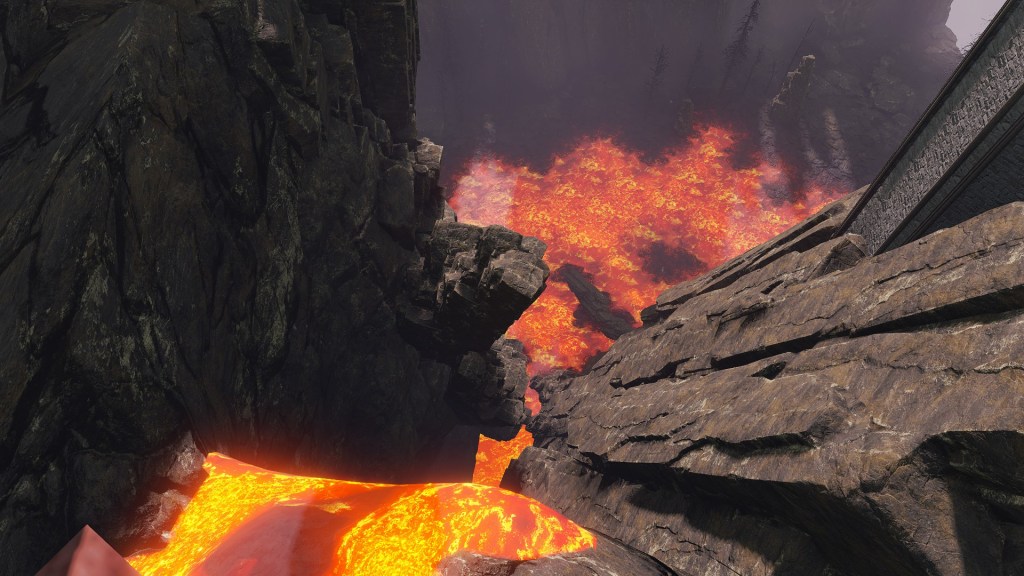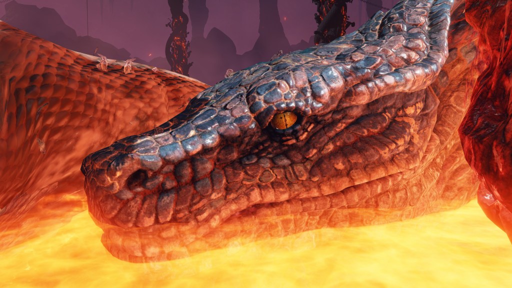 In growing to such size, the serpent produces the lava flowing from the volcano. We can see how its body instantly melts whatever rock it slithers across, creating a constant pool of magma around it. The long-term presence has evidently scorched the god’s entire lair, the blackened stone, flesh, and bone still lingering with molten heat. The boss room is likewise located beneath the source of magma spouting out from the summit; the waygate to said boss room pointing toward these welling emissions from a balcony covered in snake statues emphasizes the connection. Therefore, it is body heat which rises to permeate the mountain rock. Besides turning the stone overhead into magma, it warms up the whole region, hence local fieldstones containing hot gas. This high-temperature gas leaks out of not just peaks but even valleys like the Seething River, named for the vents regularly spouting especially fiery vapors. The land has even formed sulfur deposits because of this volcanic activity.