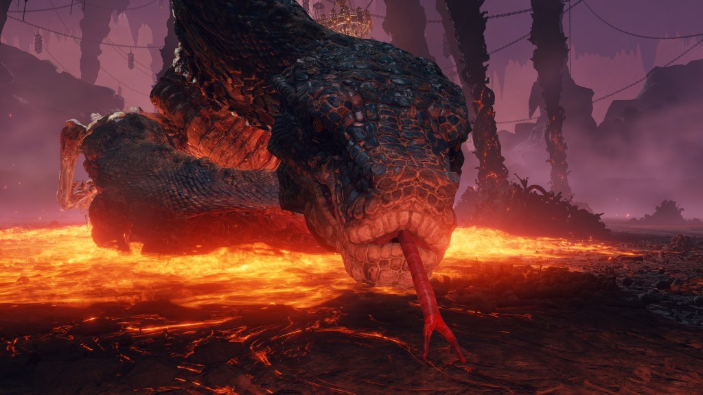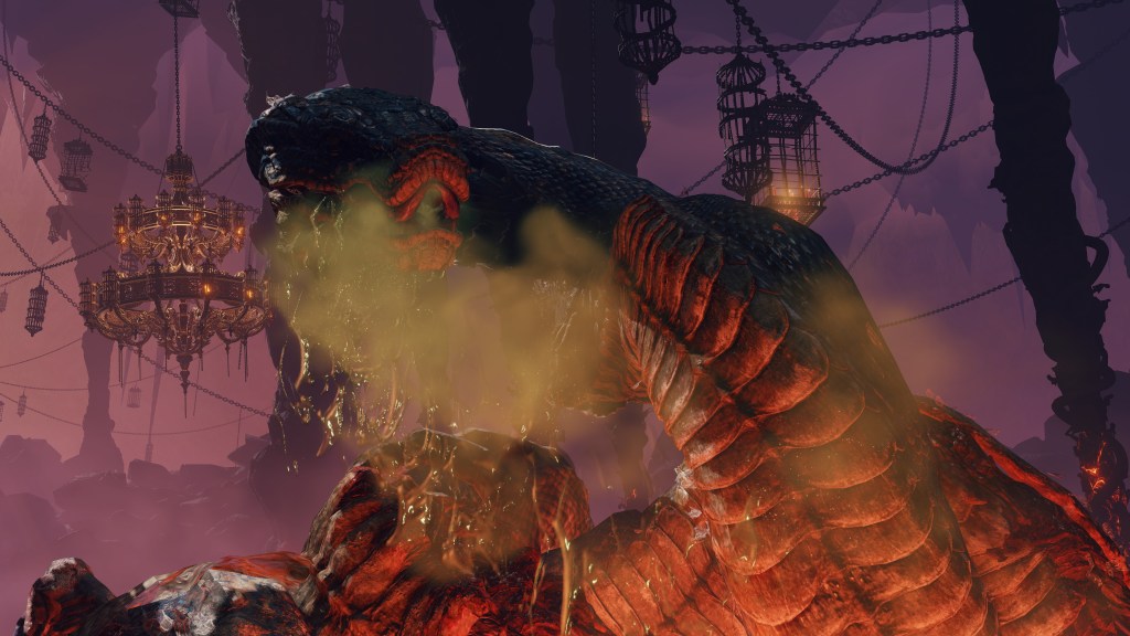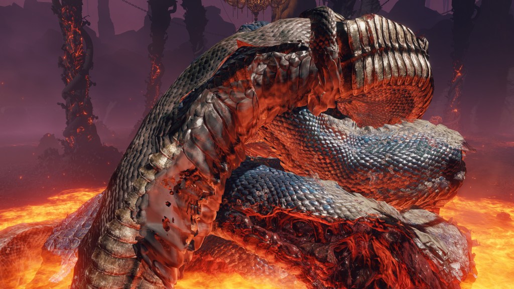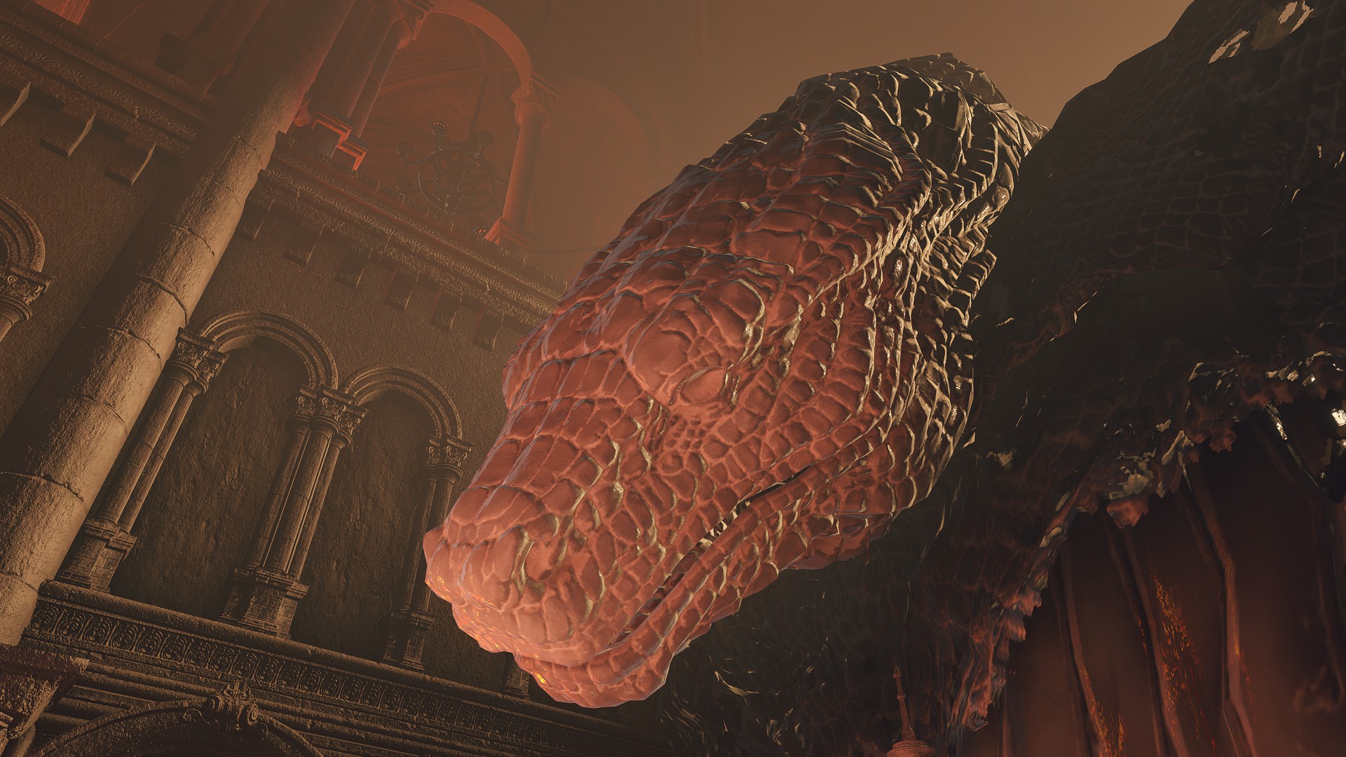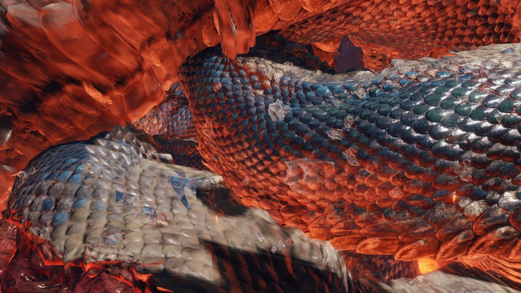 In that case, Gelmir’s god must be some sort of supernatural being, whether an outer god’s avatar or some other kind of astral entity. However it came to the Lands Between, the snake deity ultimately settled in the mountain where it had continued to live, eat, and grow. That last part is especially important in light of the reptile’s size. Snakes are known to never stop growing throughout their entire lives, and an eternal snake is no different, infinitely shedding its skin. The serpent devouring Rykard in the introductory cinematic looks no bigger than the average python. But looking around the boss room, the area is filled with snakeskins of varying sizes, some smaller and others far larger. This culminates with the boss itself, where our full body may as well be a toothpick between its teeth — remnants of fresh snakeskin still clinging to the cyan scales. In the relatively short time since the events of the Shattering when Rykard was last human, the “little” green snake has grown exponentially. Had the immortal serpent not been hunted in the past, it likely would be even larger than it is now.