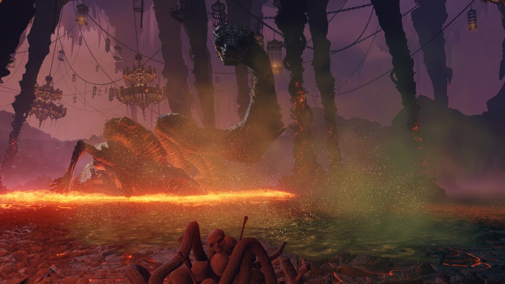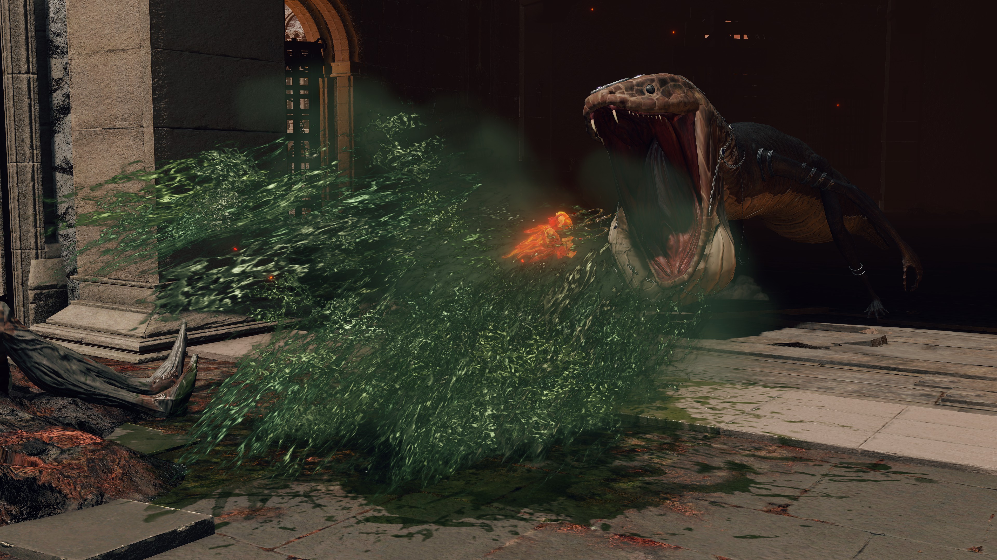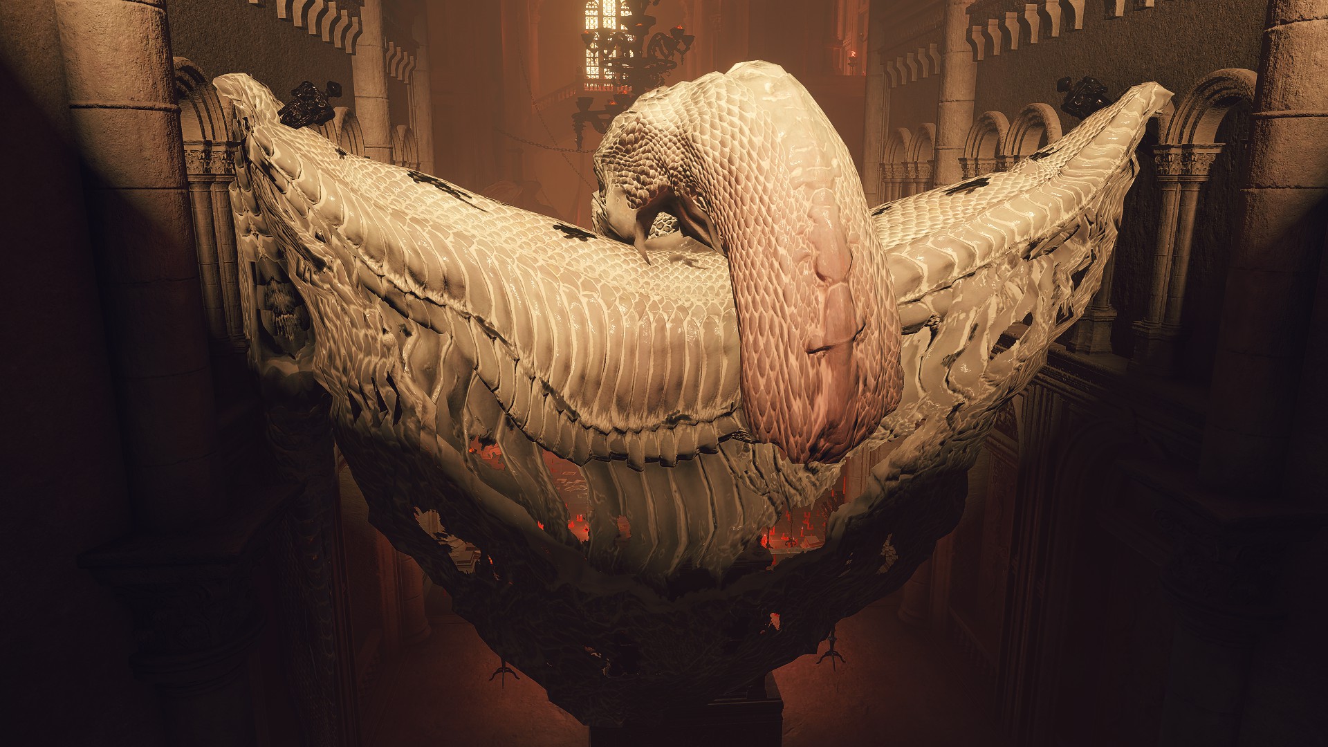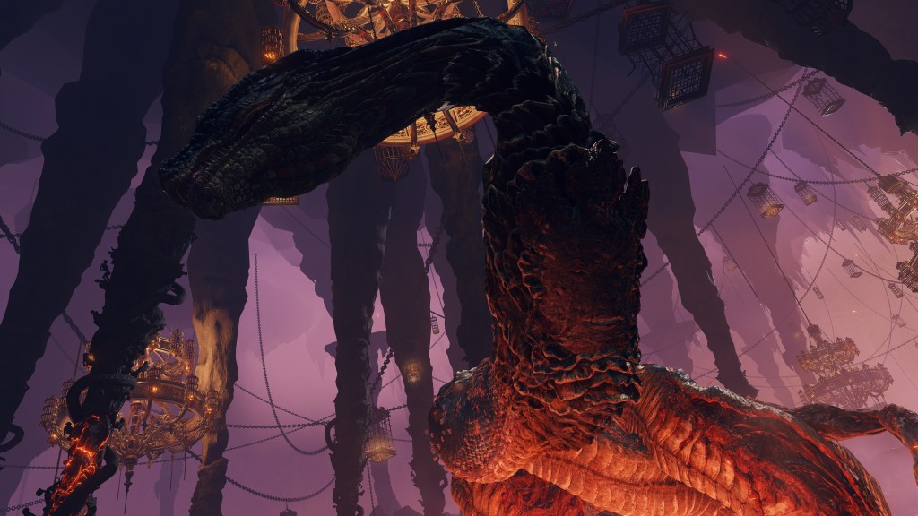 In that case, Gelmir’s god must be some sort of supernatural being, whether an outer god’s avatar or some other kind of astral entity. However it came to the Lands Between, the snake deity ultimately settled in the mountain where it had continued to live, eat, and grow. That last part is especially important in light of the reptile’s size. Snakes are known to never stop growing throughout their entire lives, and an eternal snake is no different, infinitely shedding its skin. The serpent devouring Rykard in the introductory cinematic looks no bigger than the average python. But looking around the boss room, the area is filled with snakeskins of varying sizes, some smaller and others far larger. This culminates with the boss itself, where our full body may as well be a toothpick between its teeth — remnants of fresh snakeskin still clinging to the cyan scales. In the relatively short time since the events of the Shattering when Rykard was last human, the “little” green snake has grown exponentially. Had the immortal serpent not been hunted in the past, it likely would be even larger than it is now.