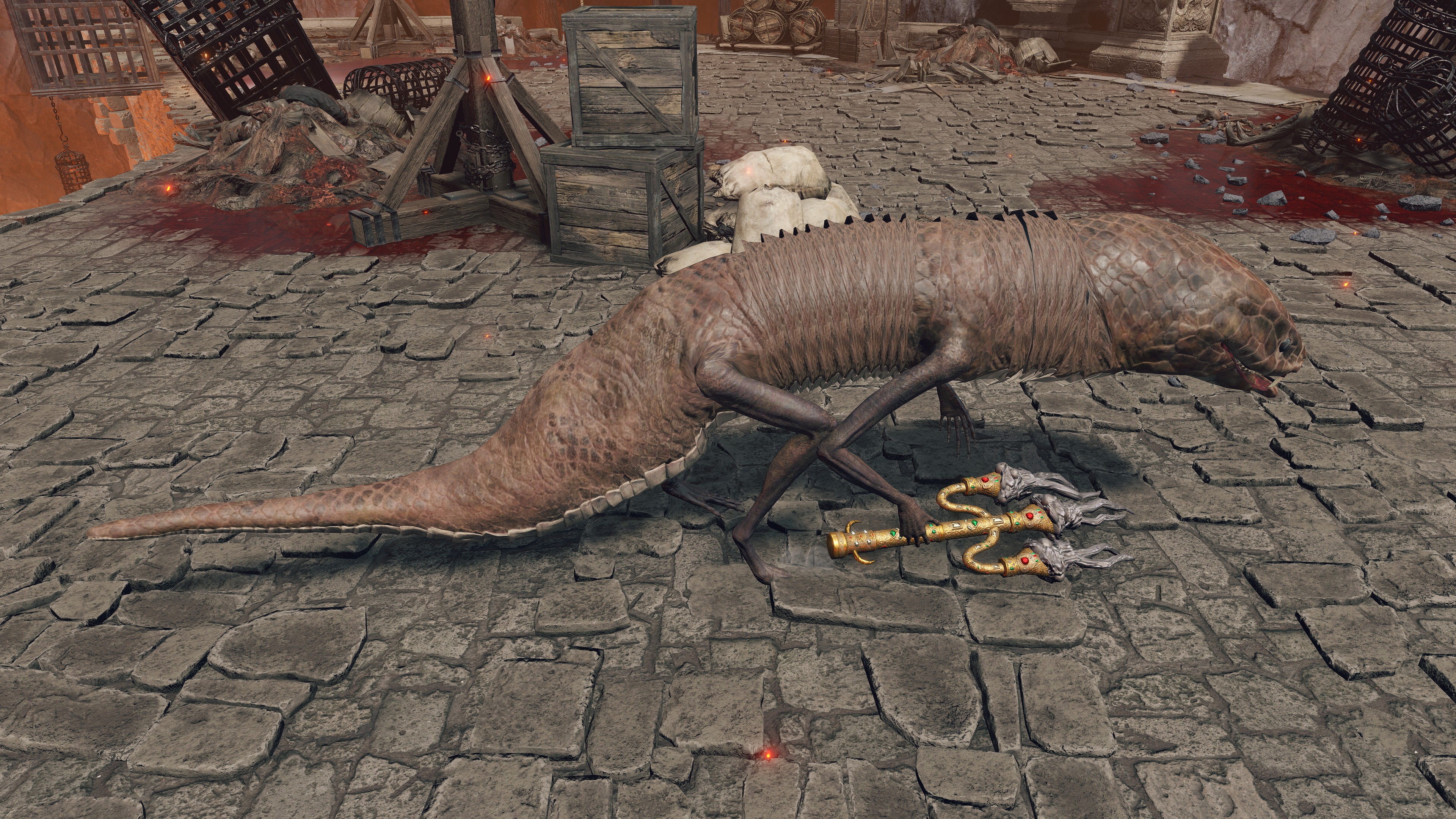 Truly, that volcano is a “fire mountain” (火山) in the most literal sense, the snake god being the source of the fire. Without it, Gelmir would be no different from Jagged Peak. Since we witness no signs of this melting body heat while the snake devours Rykard, it must be a byproduct of eating so many more. Indeed, a multitude of corpses across the lands inexplicably smolder with embers. In most cases, the corpse models possess a weapon or some other indication that they were a warrior in life. This embered state might thus be faulted on the dead’s fighting spirit, a fiery soul for a hot-blooded temperament. It would explain why only proven heroes are currently offered to Rykard, the strongest and bravest supplying the most vigor, and fire power, to the snake. These “blasphemous” flames the demigod wields to both produce magma and steal more life further add to the impression. But if even non-warriors possess a little heat in their spirits, they cumulatively could bring the serpent the same growth as well as bodily emissions — and that gives incentive to the human sacrifices.