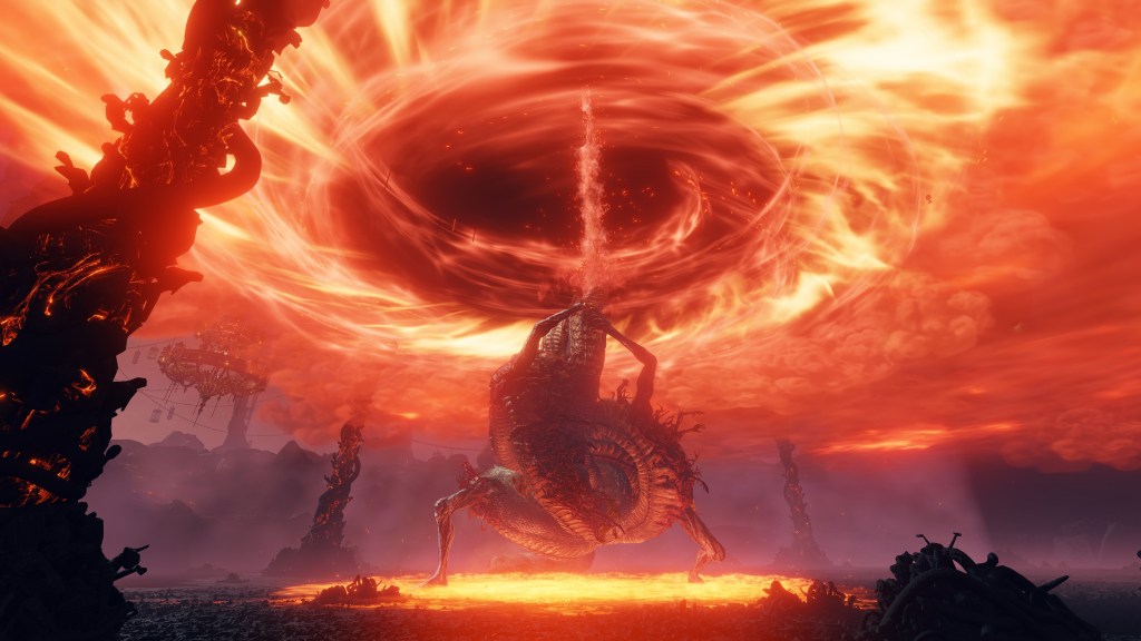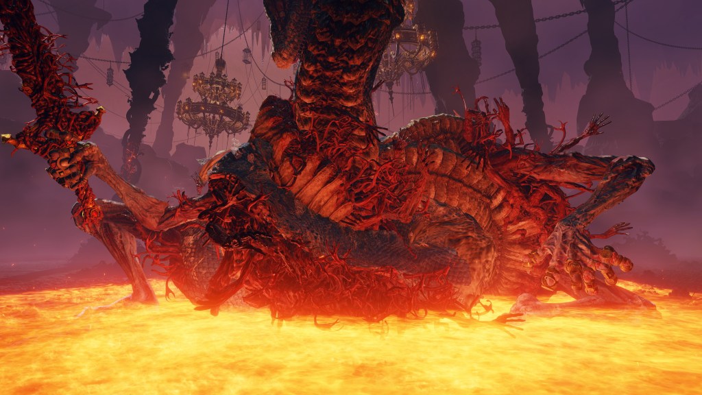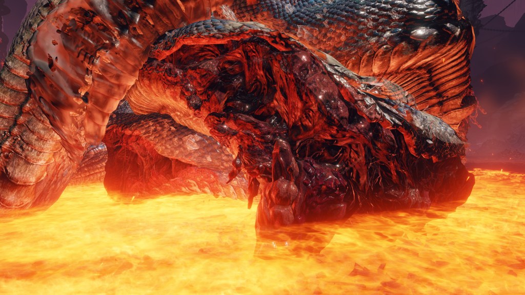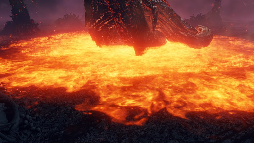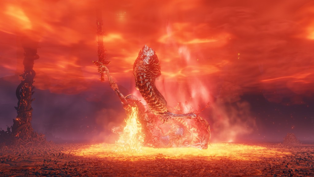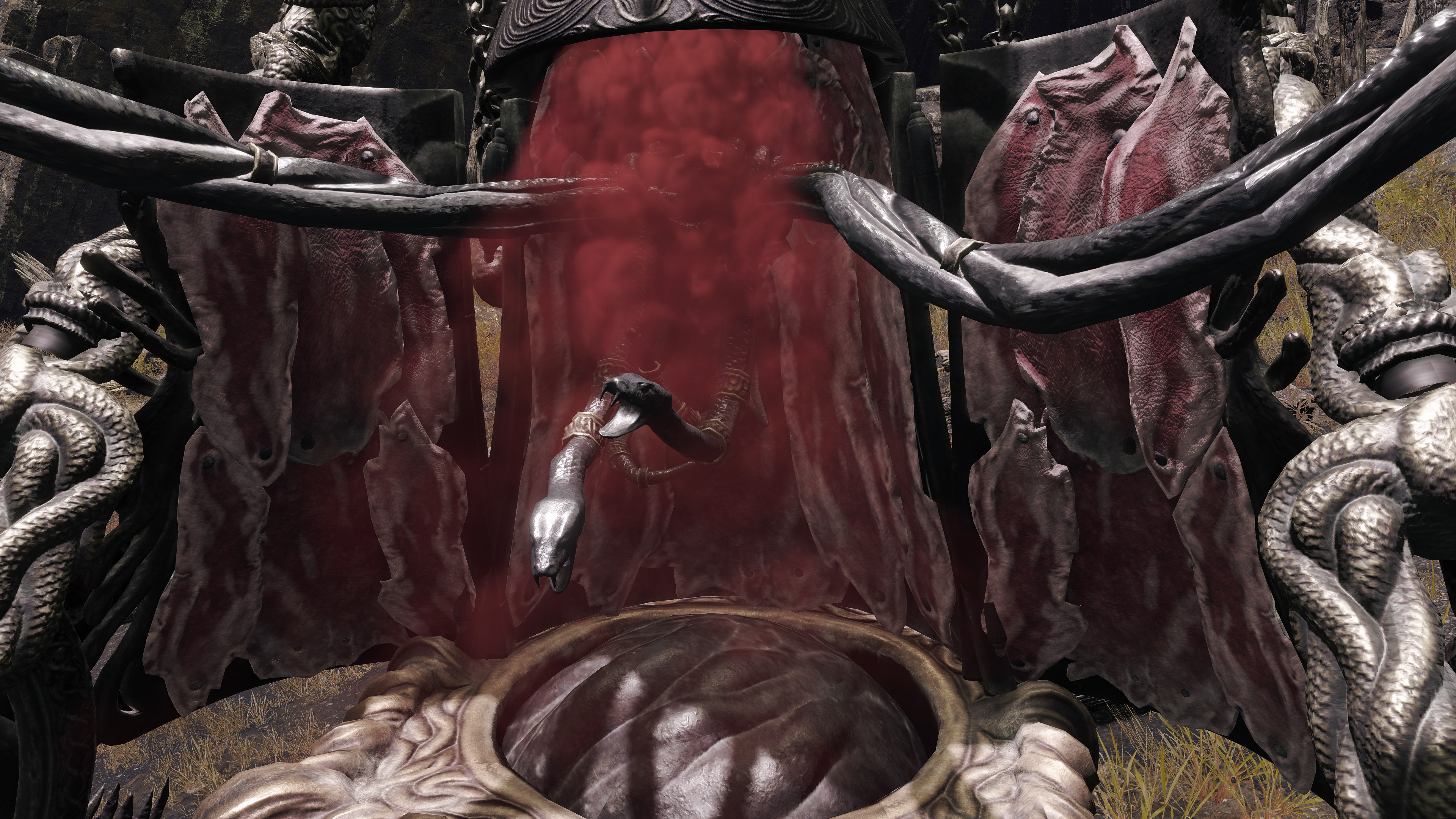 Of course, few possess the will of a demigod, and most sacrifices to the snake evidently haven’t appreciated their violent fate. Inside the body, the dead often become vengeful spirits, smoldering with flame from the internal heat. Rykard will occasionally breathe out these ghostly grudges to unleash their wrath upon us, each leaving a serpentine trail followed by a string of explosions. Even the scorched bodies littering the boss room harbor such resentment, Rykard rousing them with the brushes of his sword along the ground until they collectively form a cloud with which to rain all that rancor upon his enemies. The fact that Gelmir’s Fury mirrors the Wrath of Gold incantation as the “Wrath of Gelmir” (ゲルミアの怒り) makes one wonder who truly lies behind the volcano’s angry response — the snake with a vendetta against the Order born of golden runes, or the ghosts with a vendetta against the man-eating snake. Either way, a deity siphoning their life so that it can grow and eat more is, to no one’s surprise, not everyone’s cup of tea.