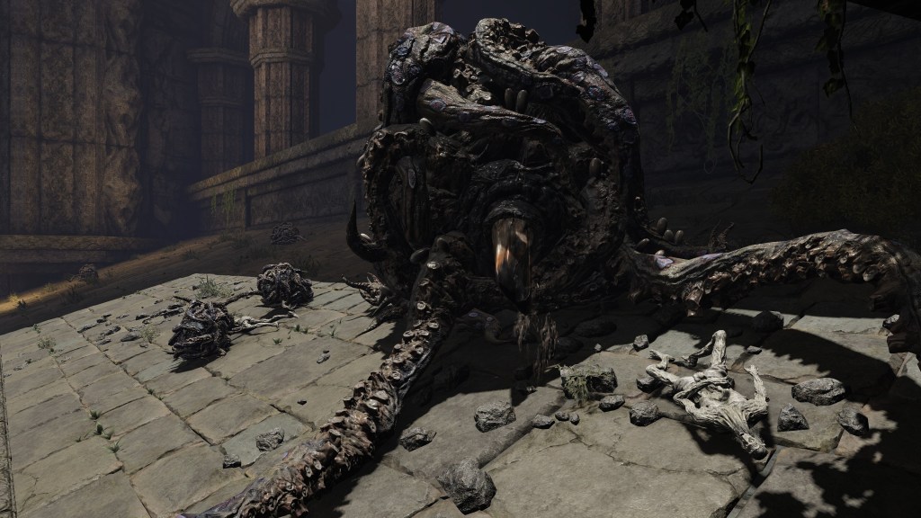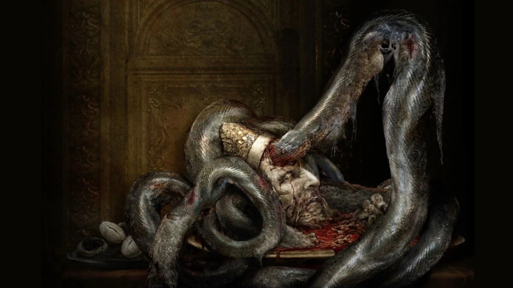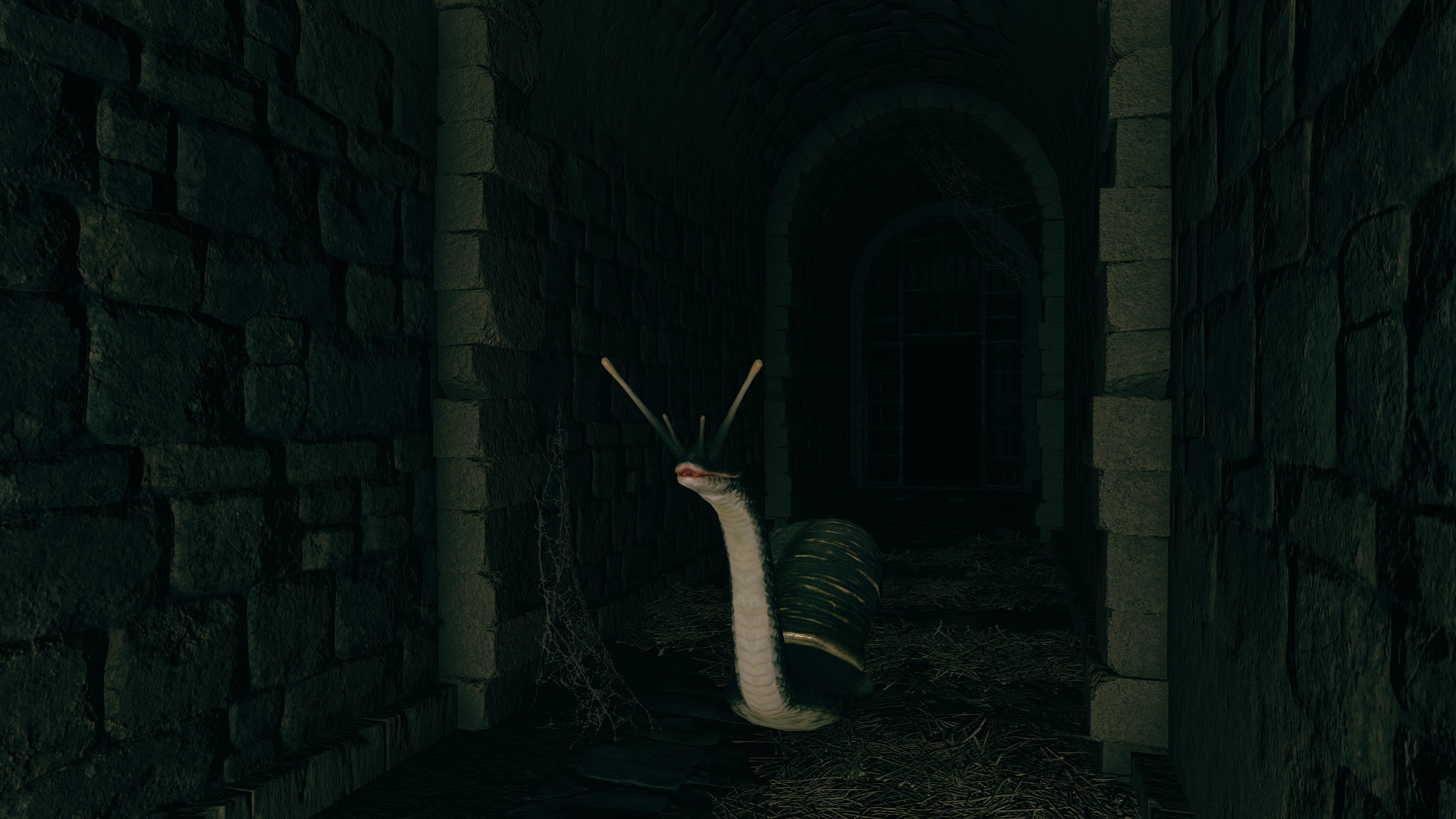 Granted, some of that spiritual energy might still be broken down and reconstituted into new forms, and not just as part of the great snake. After all, the animal god is female, as evidenced by its offspring. While devouring Rykard, we can spy a few small eggs next to the snake, either already hatched or hatching. This implies that the deity lays eggs in the course of endlessly devouring prey, presumably not even requiring a proper mate to facilitate this. We don’t encounter any snakelets slithering in the wild on Gelmir — the closest is the snail snakes taking the place of rats as local pests, humorously enough. However, the eggs suggest that lesser snakes do exist. They may be the source of the poison inserted into the Formless Serpents’ arrows, the description of which makes no mention of hexing in contrast to the bow. Regardless, that birth through ingestion involves the bodies and souls of the serpent’s victims in the process, which is consistent with its latest progeny.