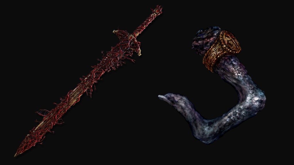 Holy sword of Rykard, Ruler of Blasphemy. The countless people eaten by him, the corpses of heroes, sinuously squirm on the surface of the sword blade.
