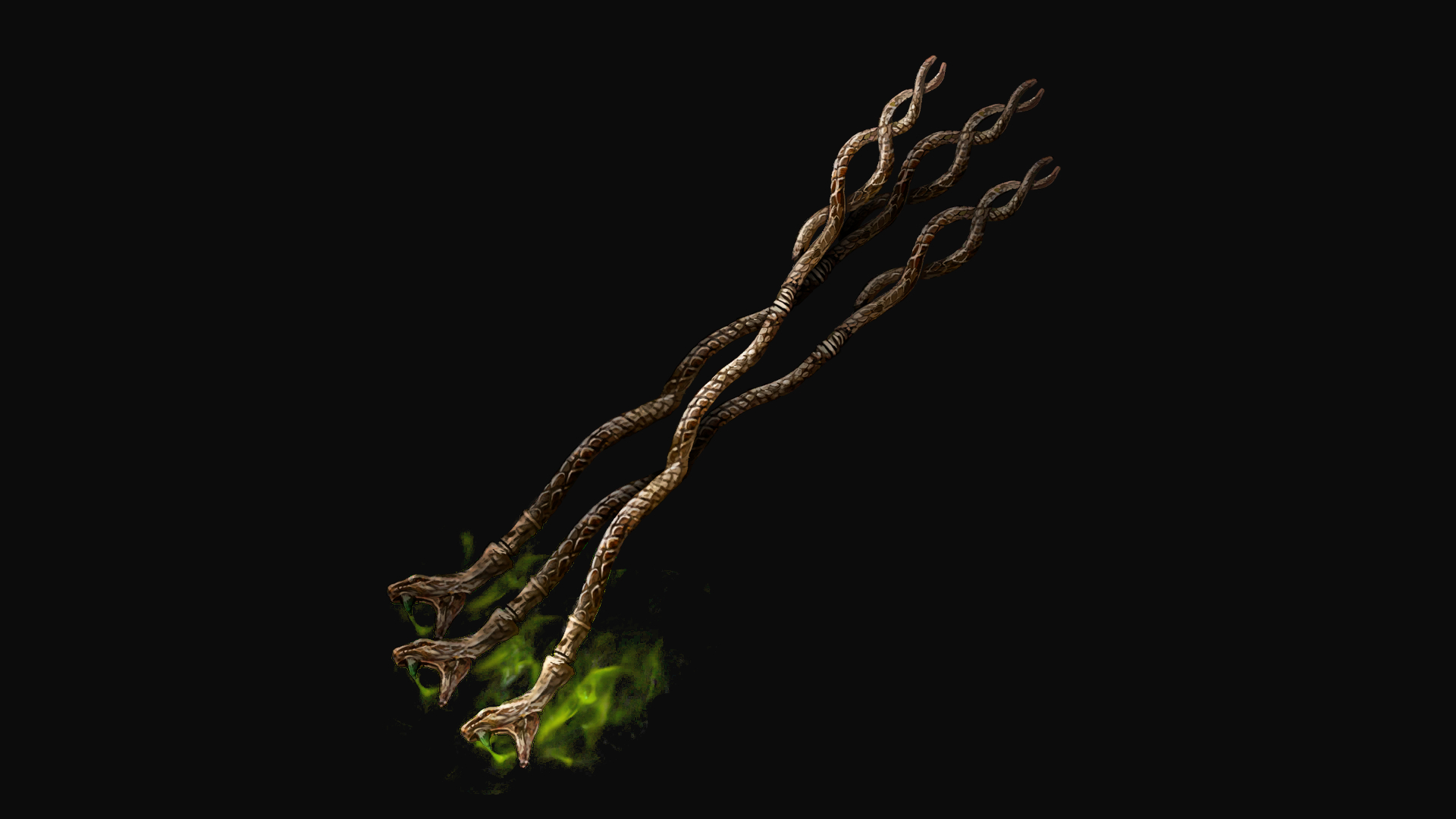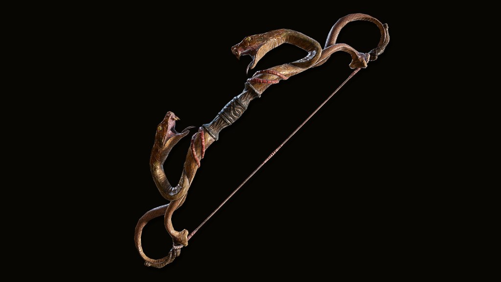 Atypical bow modeled on two poisonous snakes. Endows arrows with the poison attribute via pagan conjury and demonstrates its true value when using poison arrows in particular.