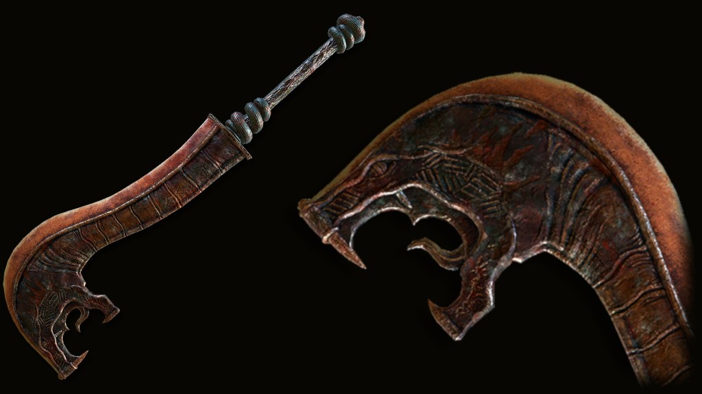 Curved sword modeled on an old snake god. Ritual tool of the lost faith of Gelmir.