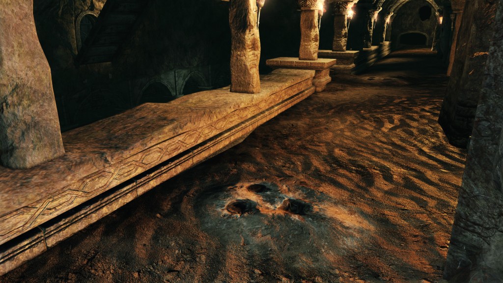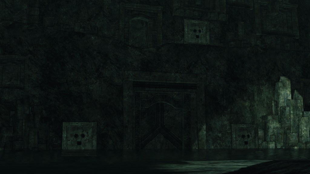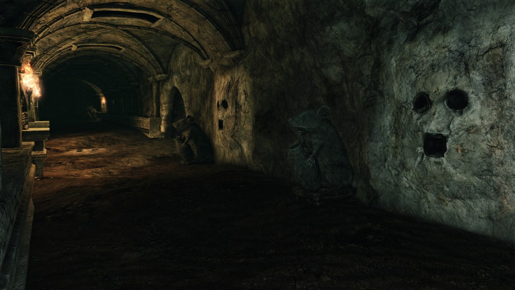 Certainly, the end product stands out for some of its capabilities, including creating pools of healing water which even an Undead can enjoy. In some cases, the contraption reveals secrets, the “face” glowing on nearby walls which we can dispel with a single strike. This is the only example of illusory walls in the game, despite their being ubiquitous in the original Dark Souls. Drangleic otherwise relies on the more conventional “fake” walls which pull away via mundane mechanism when activated by non-violent interactions. Both methods are used to conceal hidden passages or stores of items related to the area, but only Pharros seems to preserve the magical means; maybe this makes Pharros a sort highly proficient spellcaster. To that point, we find his contraptions in the Memory of Orro, within a highly secure military facility mid-invasion. Either Pharros was alive during the fort’s heyday, or he can travel through time like us. Whichever is the truth, it require that he possess stealth and infiltration abilities matching the greatest of thieves, whether through magic or pure natural ability.