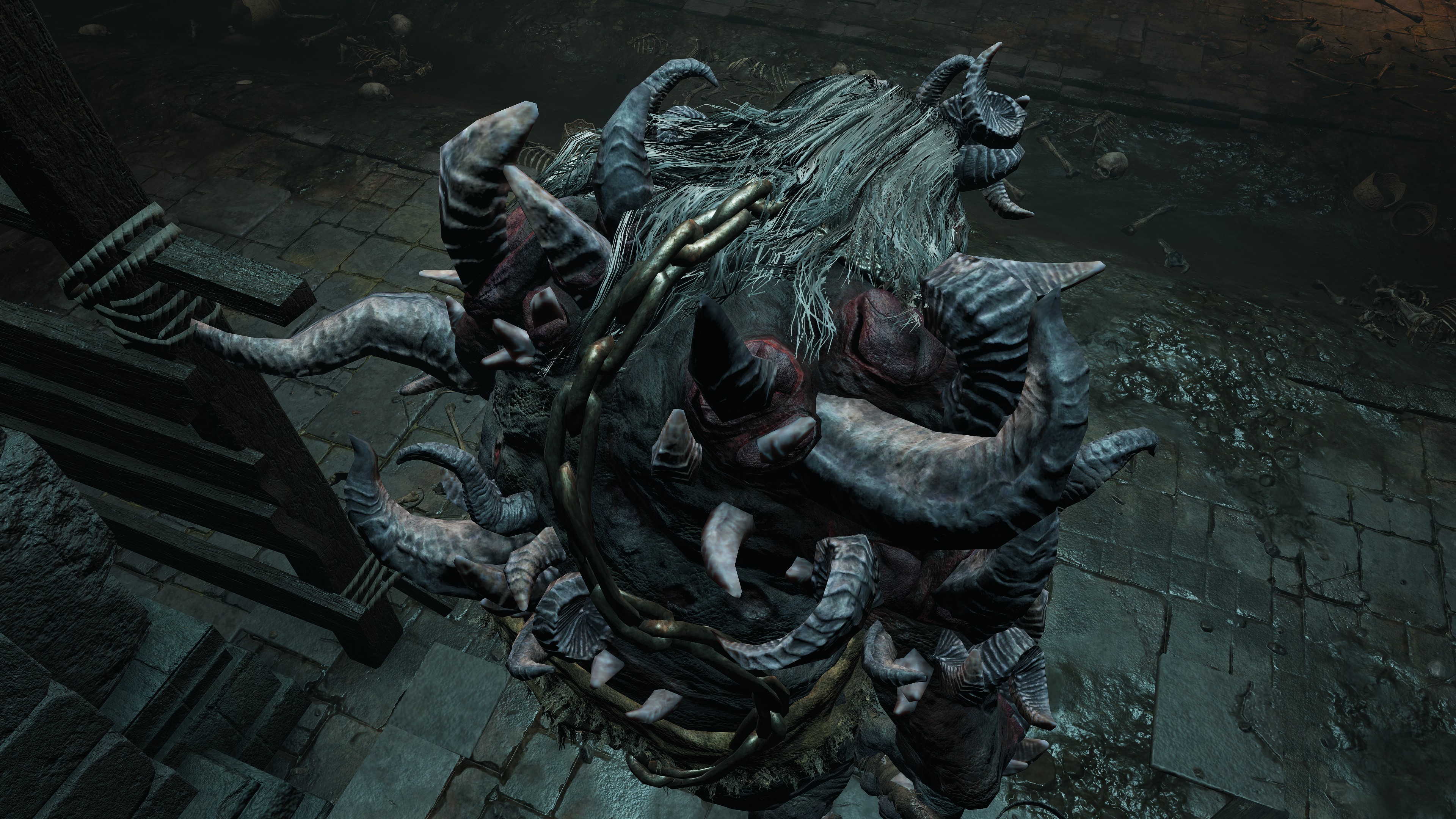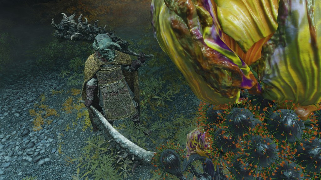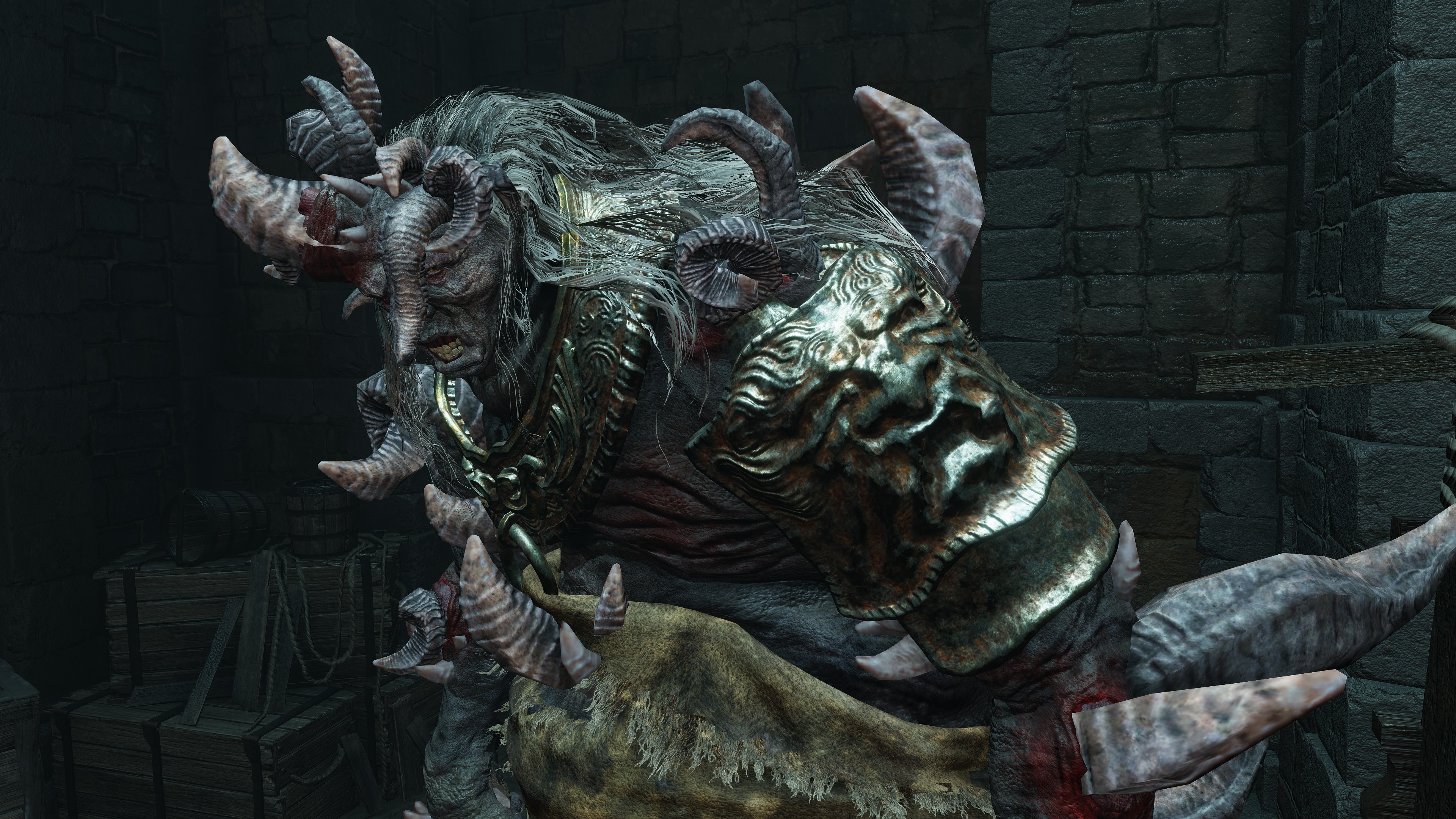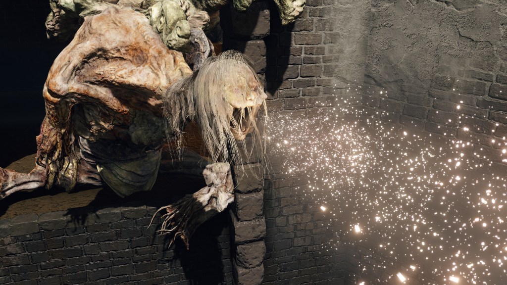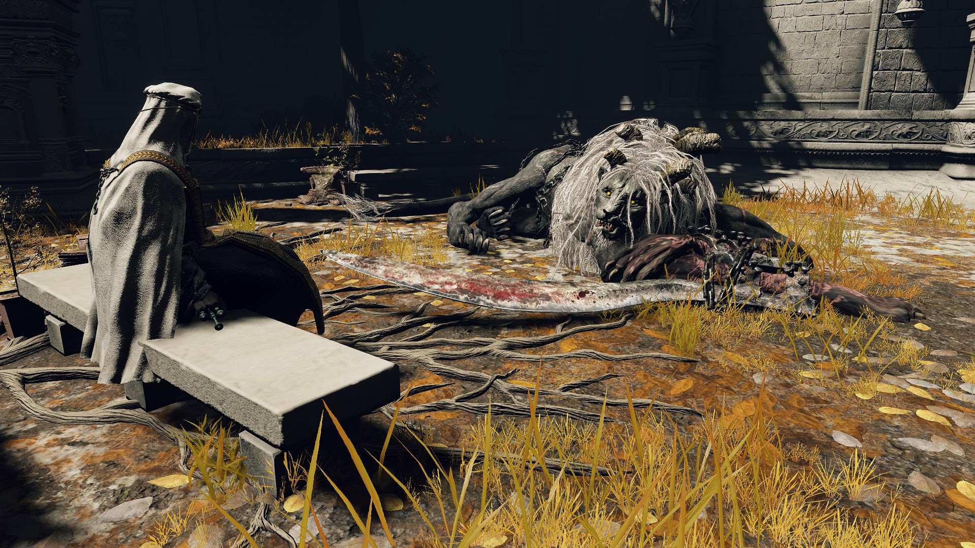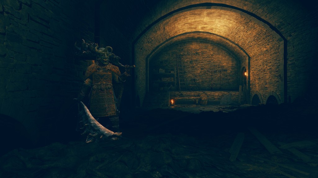 Of course, not all are so cooperative. Leaving the “civilization” of the Underground Roadside, we begin seeing Omen armed yet uncollared. Such individuals have allowed their horns to grow wild all over the body. Perhaps the priests provide regular grooming for those they chain to help them manage the curse, but these royal rejects prefer to retreat into the sewers’ recesses regardless, remaining on the fringes of the undercity at best. Some, like the mournful Omen holding onto an old friend’s Bairn, may be more friendly, but most seem to embrace savagery; one lies in ambush just to attack any coming around the corner, especially from the Leyndell Catacombs. Nonetheless, they can still be receptive. Another example kneels down to examine the Crucible Scale Talisman offered on the catacombs altar, likely contemplating what could have been. The priests are reaching out to these lost lambs, but the Omen have so far only been willing to accept the holy men’s gift tools, not leashes. They are understandably wary of strangers, especially when similar people in aprons try to hunt the lot down with the face of their nightmares.
