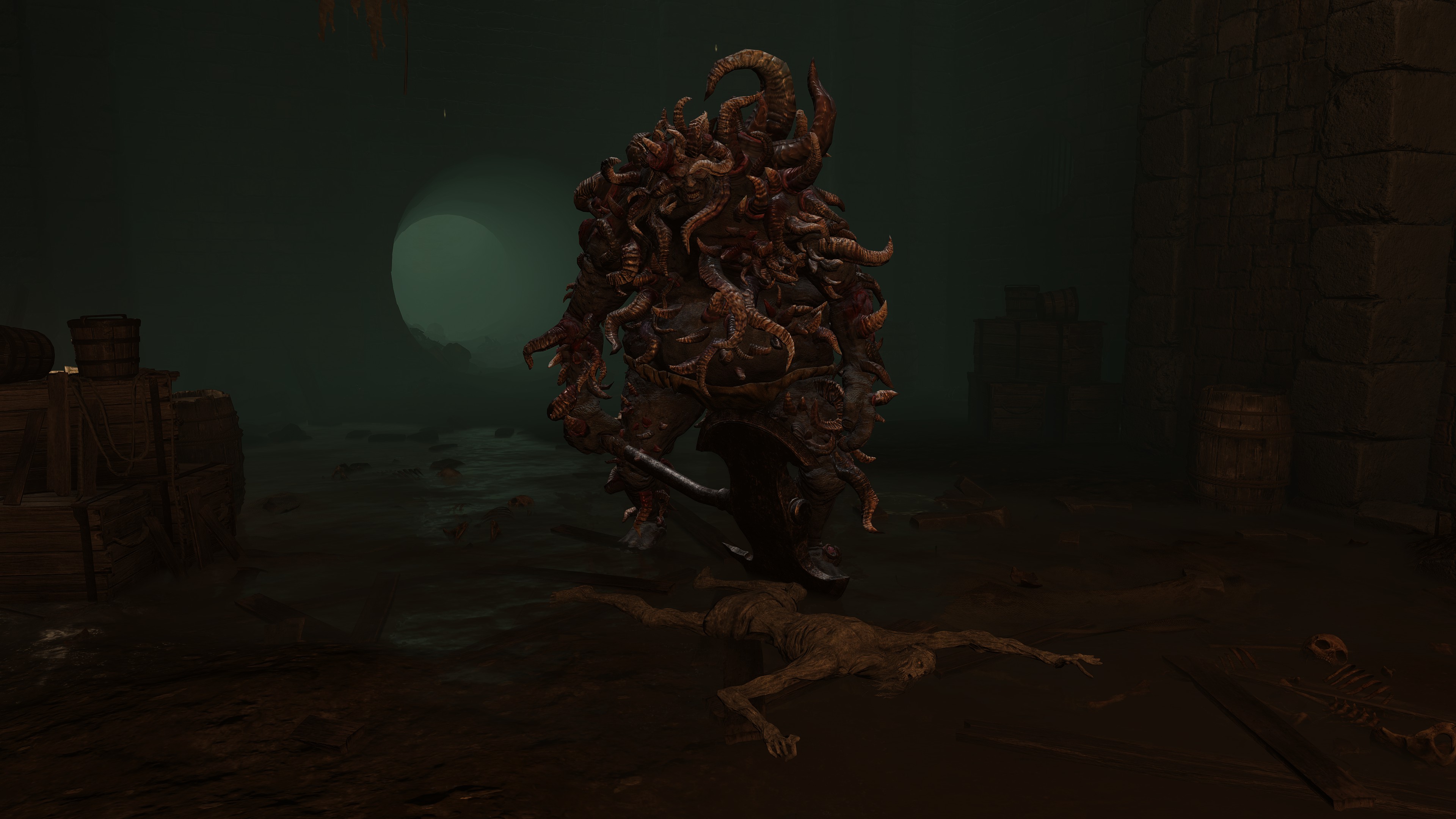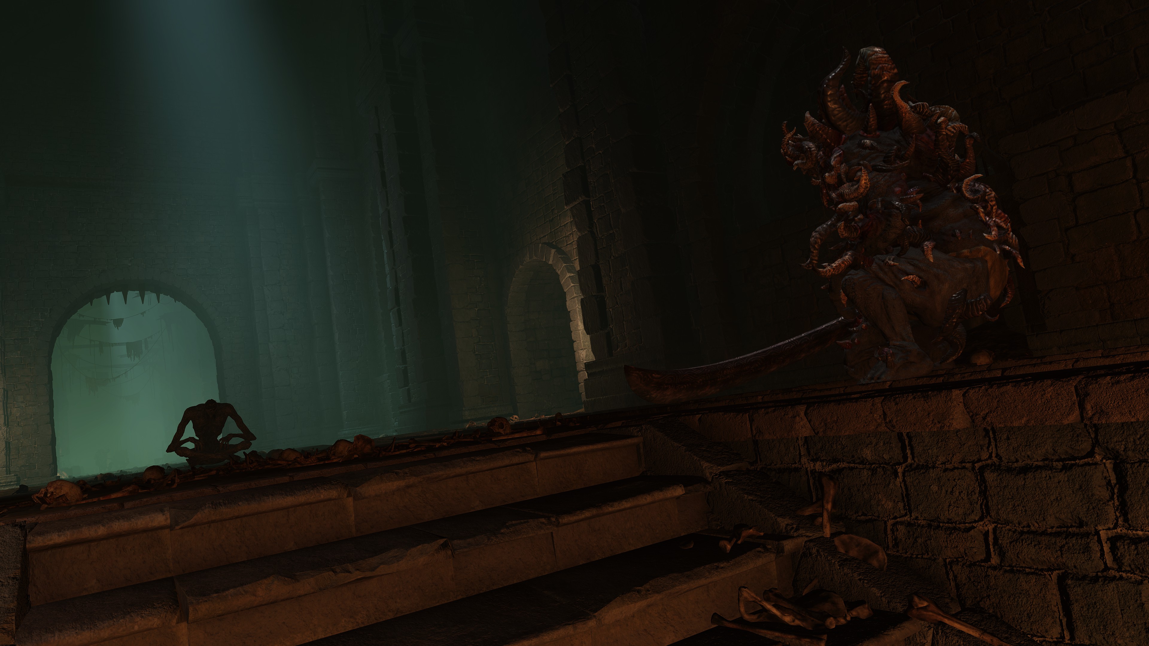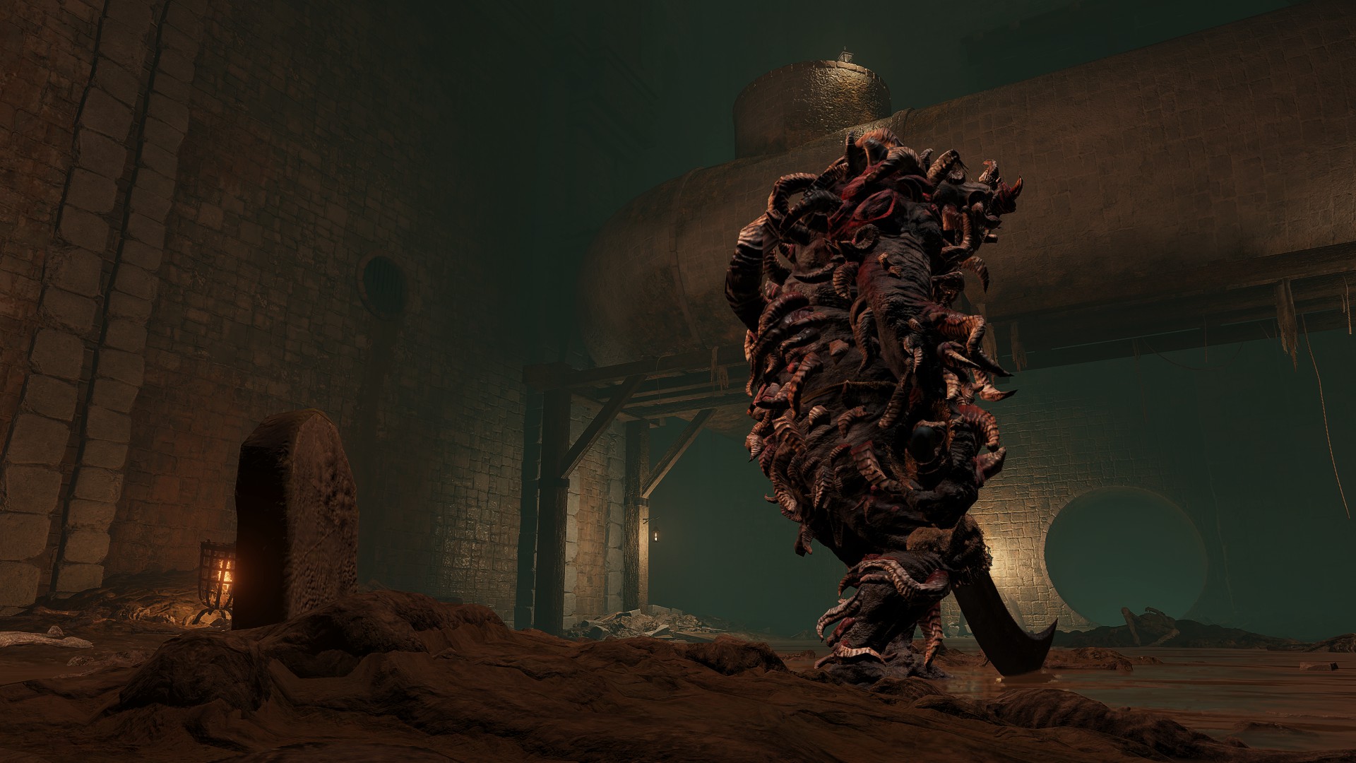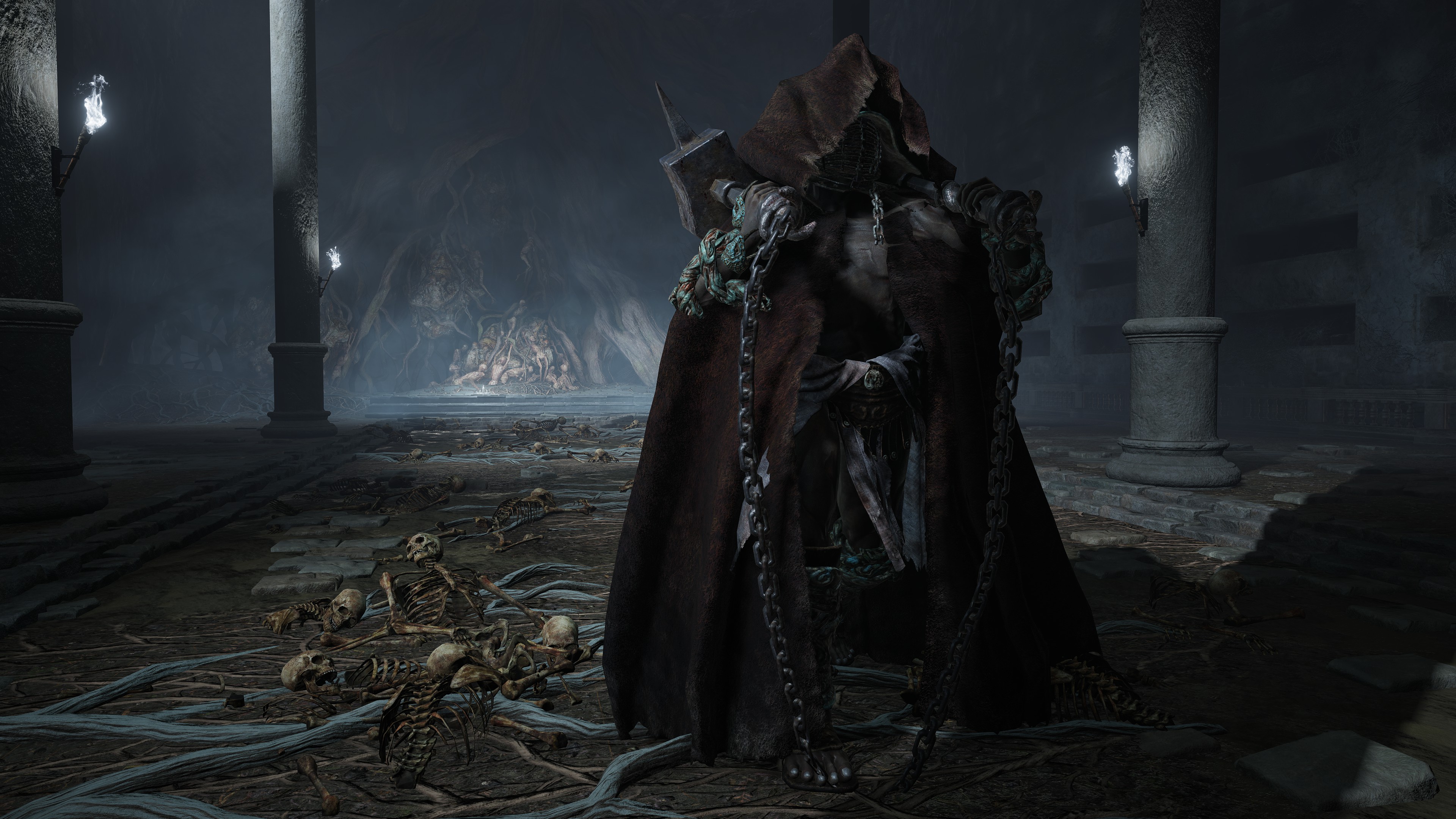 Of course, not all are so cooperative. Leaving the “civilization” of the Underground Roadside, we begin seeing Omen armed yet uncollared. Such individuals have allowed their horns to grow wild all over the body. Perhaps the priests provide regular grooming for those they chain to help them manage the curse, but these royal rejects prefer to retreat into the sewers’ recesses regardless, remaining on the fringes of the undercity at best. Some, like the mournful Omen holding onto an old friend’s Bairn, may be more friendly, but most seem to embrace savagery; one lies in ambush just to attack any coming around the corner, especially from the Leyndell Catacombs. Nonetheless, they can still be receptive. Another example kneels down to examine the Crucible Scale Talisman offered on the catacombs altar, likely contemplating what could have been. The priests are reaching out to these lost lambs, but the Omen have so far only been willing to accept the holy men’s gift tools, not leashes. They are understandably wary of strangers, especially when similar people in aprons try to hunt the lot down with the face of their nightmares.