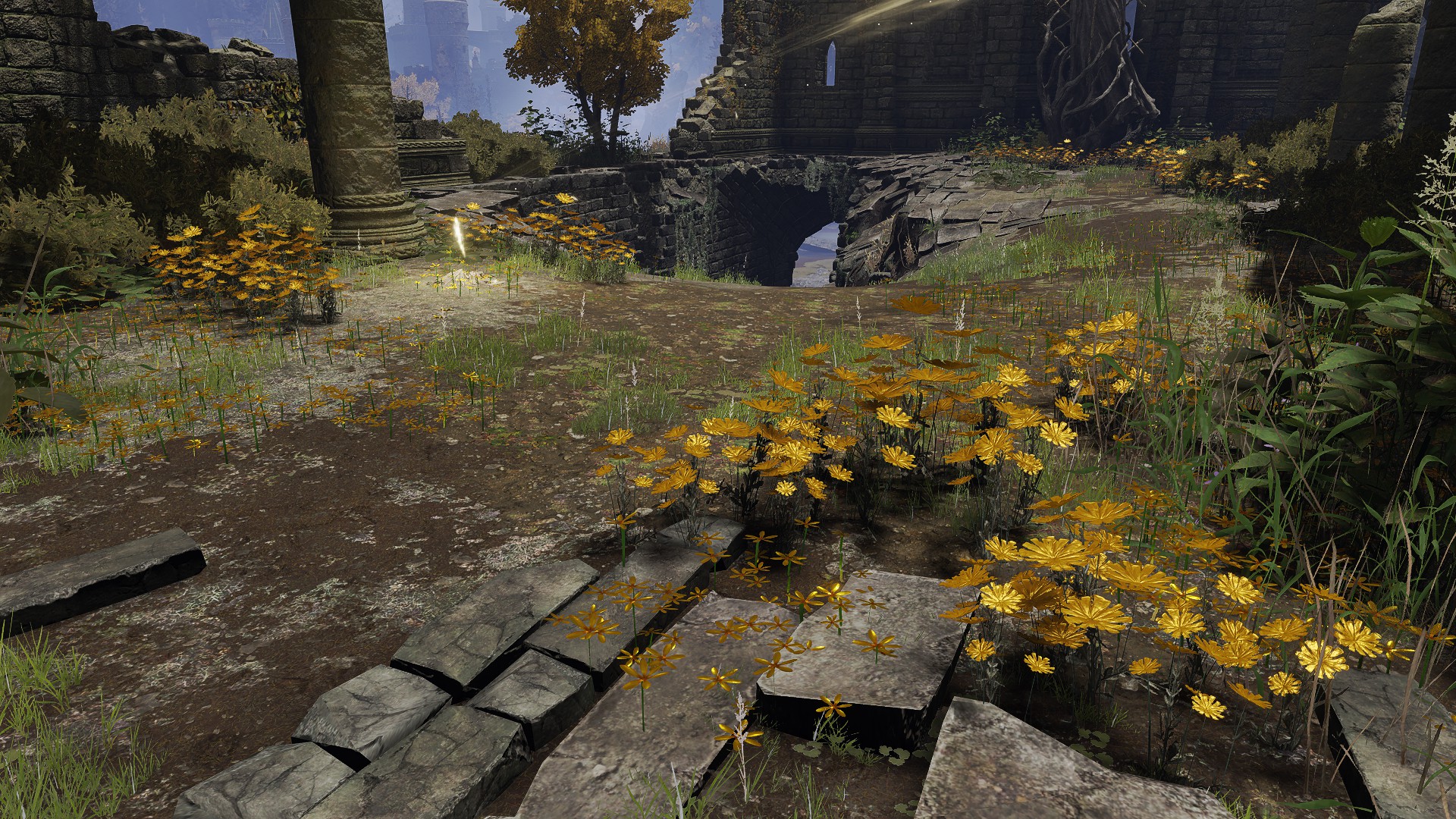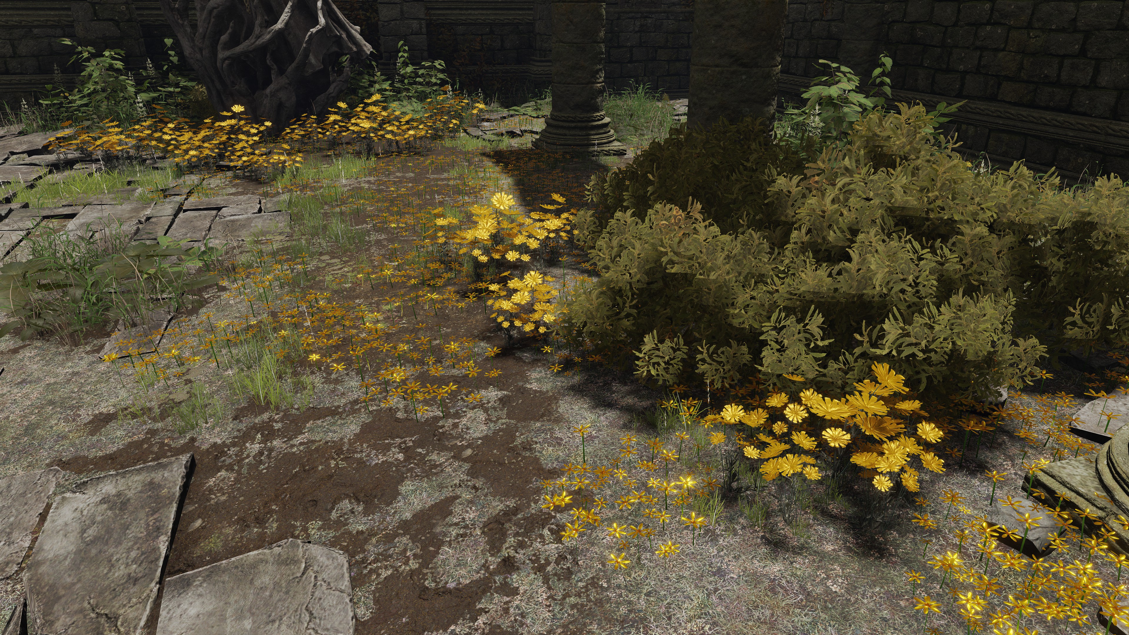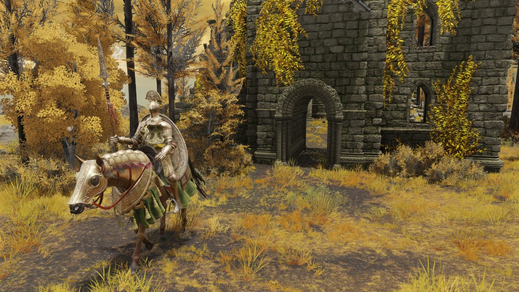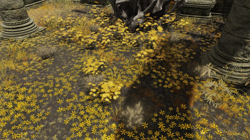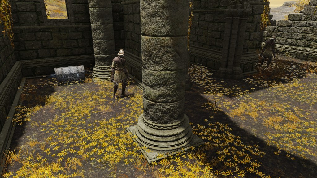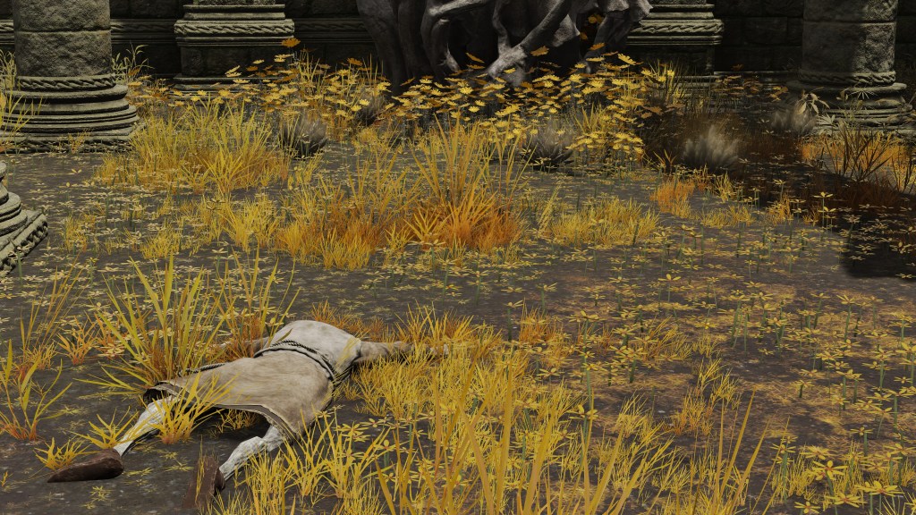 The Bellum Church is built in the place of Radagon’s first major achievement: heroism in the First Liurnian War. But if that is the reason for its construction, then it is odd that it differs from many of the standard churches. It does have the golden flowers scattered about inside, stretching all the way to its front step. But unlike the previous examples, this church doesn’t just proliferate the smaller species; the larger ones also dot the patches within its walls. This discourages the notion of the church being used for research like those other cases. Rather, the addition of the large flowers implies a great deal of fanfare. Adding to the implication, the church is connected to the highway not by dirt road but more highway — as if part of some major route. Based on the golden centipedes lying around, the place once attracted fundamentalists. Moreover, the nomadic merchant camping behind the church sells various cured meats, including the invigorating white cured meat crafted with golden rowa from Altus Plateau. This suggests that passers-by mainly come down from the Grand Lift of Dectus.