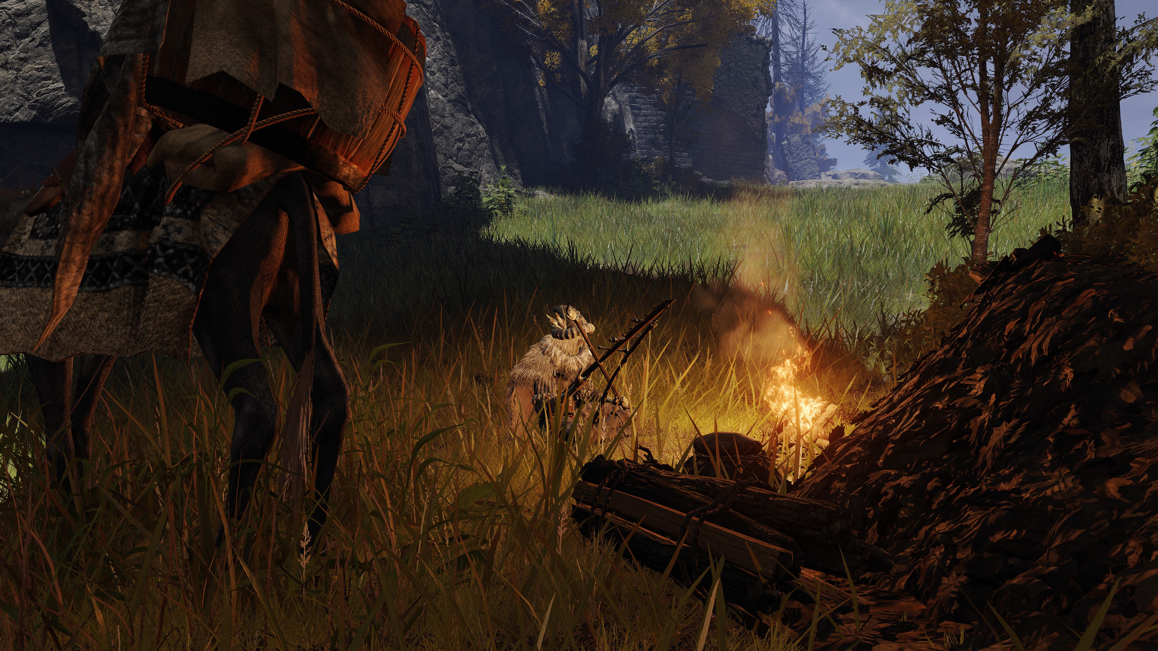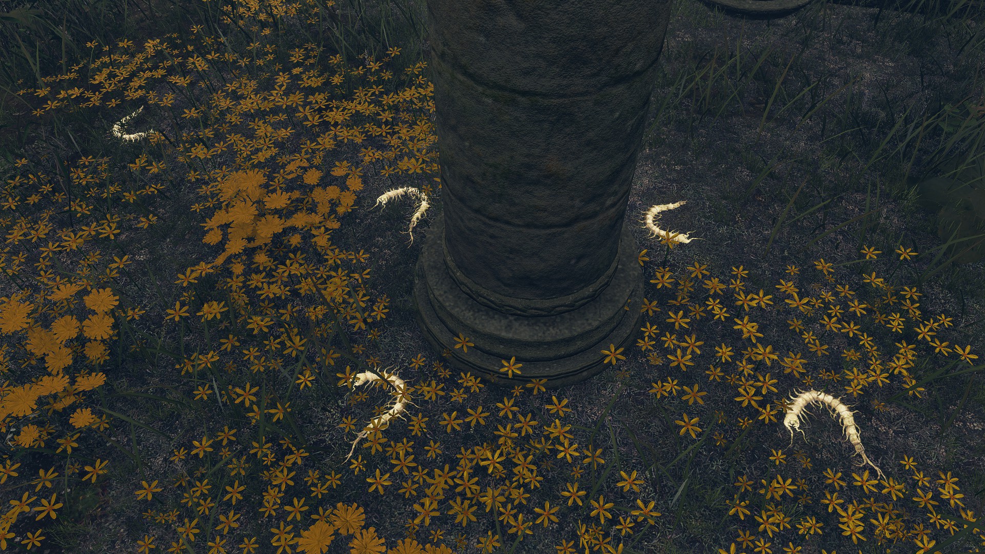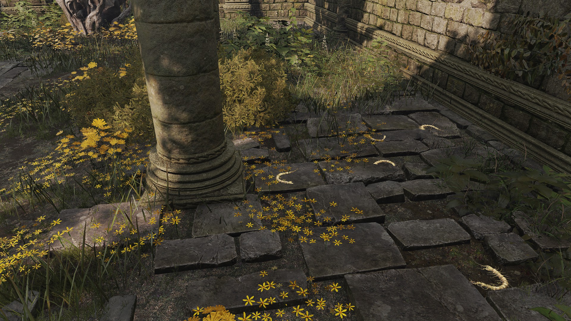 The Bellum Church is built in the place of Radagon’s first major achievement: heroism in the First Liurnian War. But if that is the reason for its construction, then it is odd that it differs from many of the standard churches. It does have the golden flowers scattered about inside, stretching all the way to its front step. But unlike the previous examples, this church doesn’t just proliferate the smaller species; the larger ones also dot the patches within its walls. This discourages the notion of the church being used for research like those other cases. Rather, the addition of the large flowers implies a great deal of fanfare. Adding to the implication, the church is connected to the highway not by dirt road but more highway — as if part of some major route. Based on the golden centipedes lying around, the place once attracted fundamentalists. Moreover, the nomadic merchant camping behind the church sells various cured meats, including the invigorating white cured meat crafted with golden rowa from Altus Plateau. This suggests that passers-by mainly come down from the Grand Lift of Dectus.