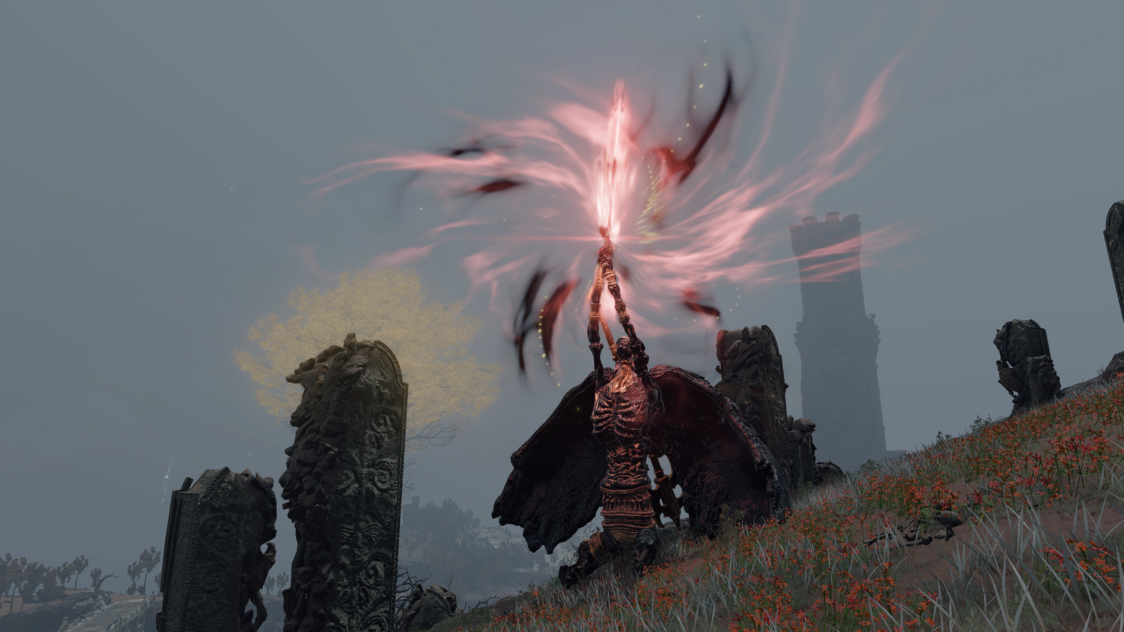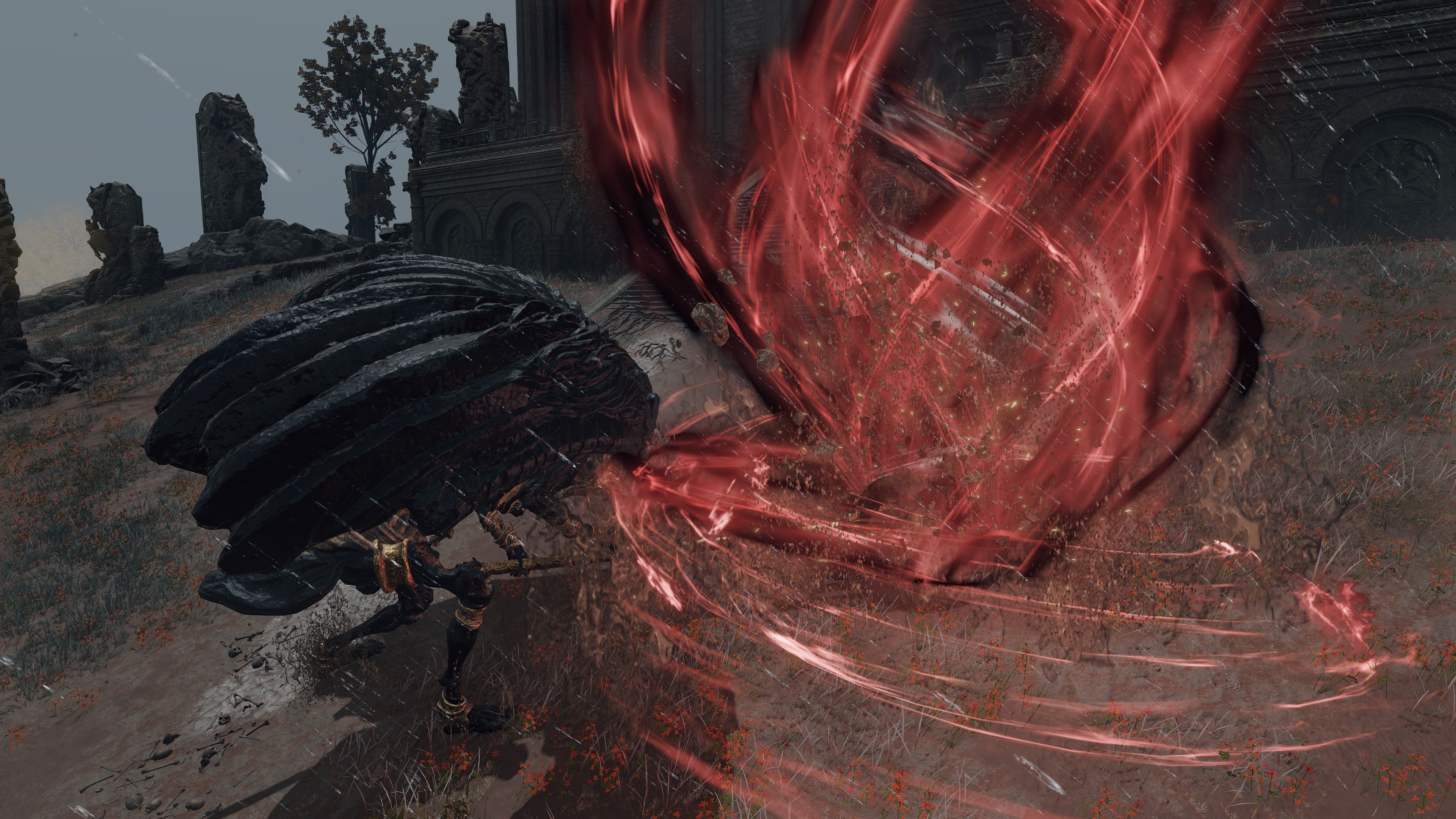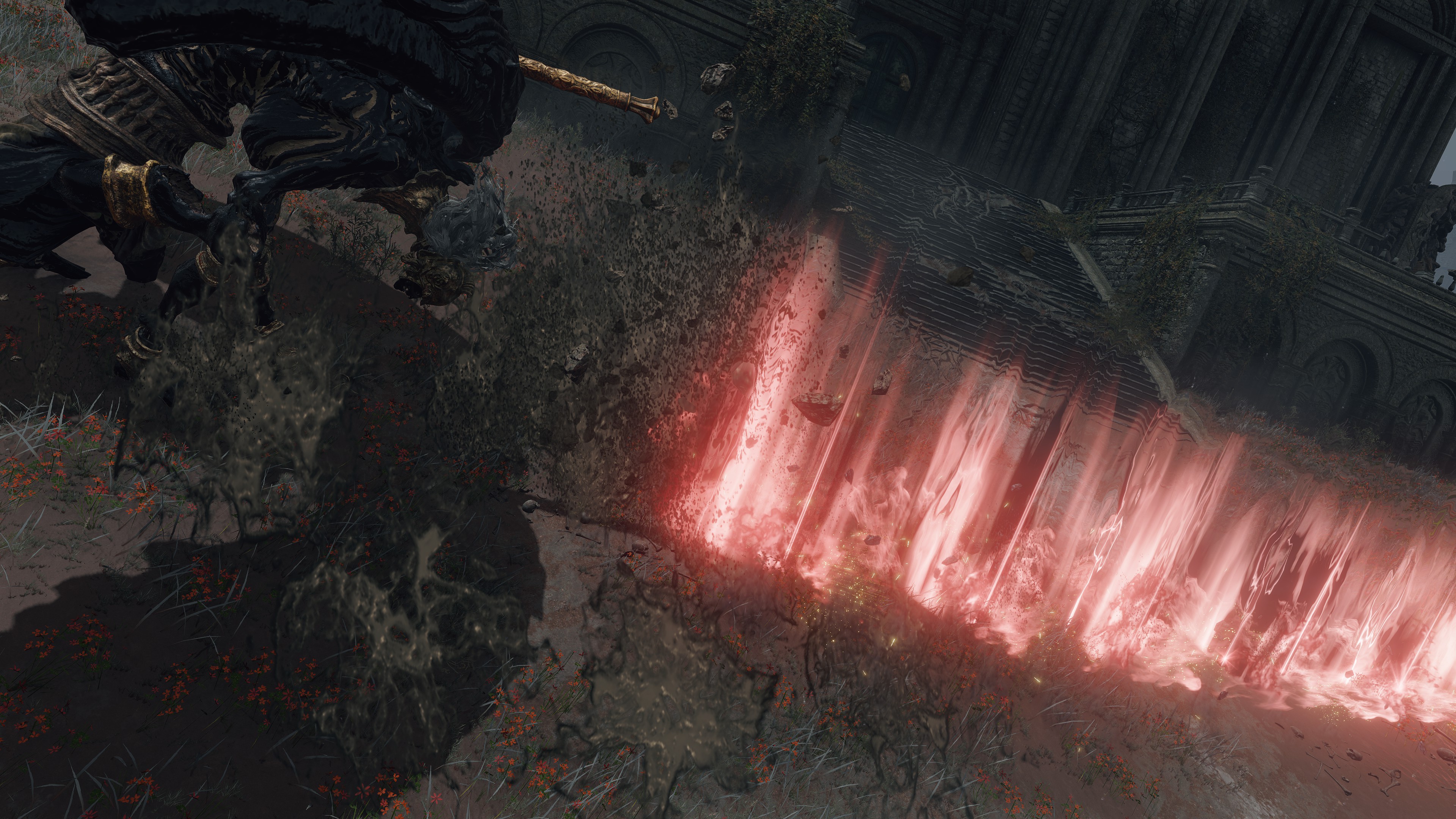 The question, then, is what area of incantations was Radagon pursuing which Marika had neglected? There were many sects of prayer outside the Erdtree chants the queen was familiar with. One of these might have been the Ancient Dragon Cult which had more recently emerged in her capital. Past the Ancient Dragon War monument lies the Stormcaller Church enshrining Radagon’s statue. This implies that the man was present on that battlefield at some point. But it is Godwyn, not Radagon, who distinguishes himself in the actual battle, and there is otherwise no indication that the red-haired hero participated in that clash between demigod and ancient dragon. Why then build a church of Radagon on the site? For research. Although the building is nowhere near as extensive as the Minor Erdtree and Third Marika Churches, it does grow the small golden flowers across its entire floor in similar fashion. It may have thereby served as another, smaller laboratory for investigating gold on the plateau. Specifically, this hill is the perfect location for independent research into the ancient dragons’ powers.