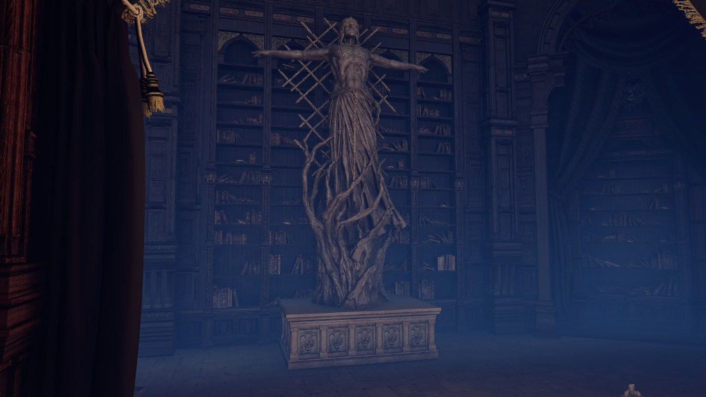 When it comes to the Erdtree rulers’ cynical mindset, nowhere is it more evident than in Radagon’s return to Liurnia, particularly the Academy of Raya Lucaria. Rennala keeps a statue of Radagon with her in the Grand Library, the same as churches dedicated to the man. The Radagon Icon is likewise stored above the Debate Parlor where we may engage one of his red wolves. Marika’s other half was obviously there at some point, and his depiction in these icons indicate that this occurred after he had been crowned Elden Lord — and the talisman’s effect further implicates prior mastery of incantations as Lord. In other words, it was only well into his second marriage that Radagon paid a visit to the school which his wife led, though whether she was still managing faculty is another question. After all, Rennala had apparently “lost heart” when she lost her husband, her ensuing despondency tarnishing the heroic image she had cultivated in establishing her rule. No one can blame her heartbreak, however, in light of the circumstances.