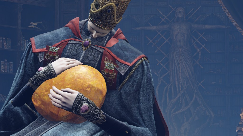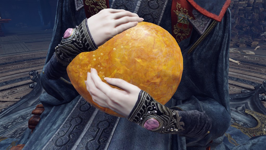 But whether he made a formal announcement at any point, news of the missing king consort’s eventual remarriage was sure to reach the Carians. And while Rennala was no doubt sinking into depression, Radagon shamelessly waltzed right back into her life. Whether or not the academy welcomed his visit, the scholars accepted his gifts, perhaps after hearing him argue for Golden Order Fundamentalism in the Debate Parlor. But preaching to sorcerers was doubtful his motive for coming. Rather, it is most likely at this point that Radagon gifted Rennala the amber egg. Despite the name, the “egg” is more accurately a mass of amber encasing a Great Rune, presumably manifest from the rune’s golden power or actual Erdtree sap. This makes it difficult to imagine Radagon owning one before becoming Elden Lord, when he had free access to the Elden Ring. The only other possibility is that he had been carrying around the egg since before his marriage to Rennala, but that just begs more questions as to why. It is more liable, then, to be something the man created expressly for Rennala to use, and use it she does.
