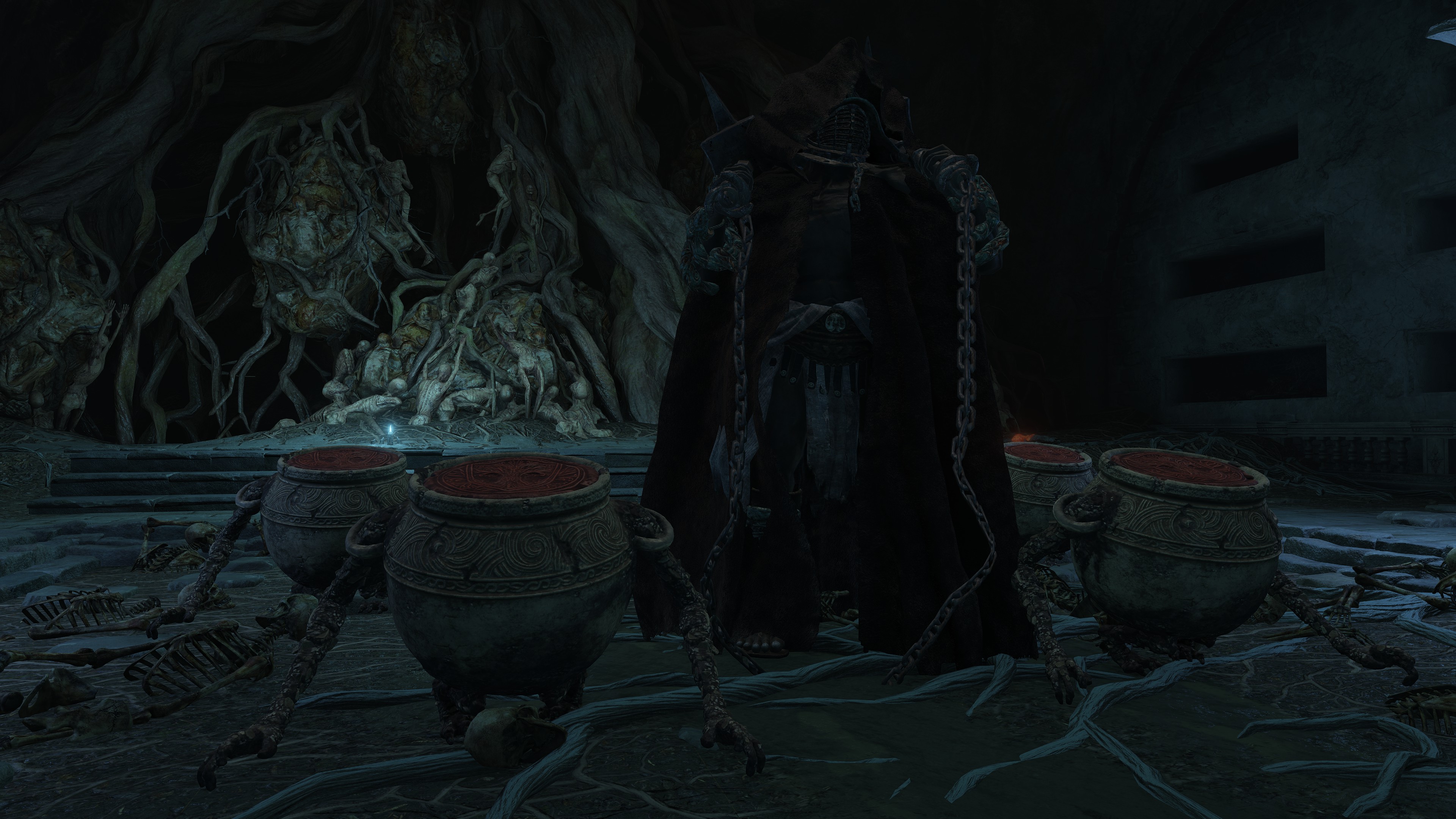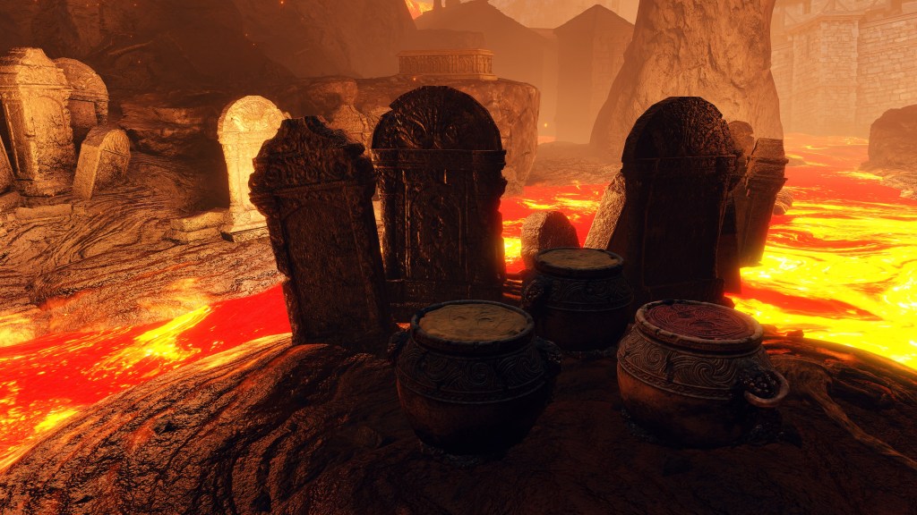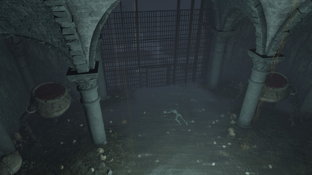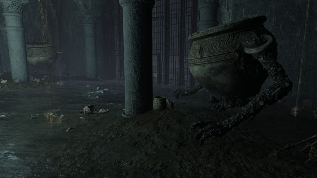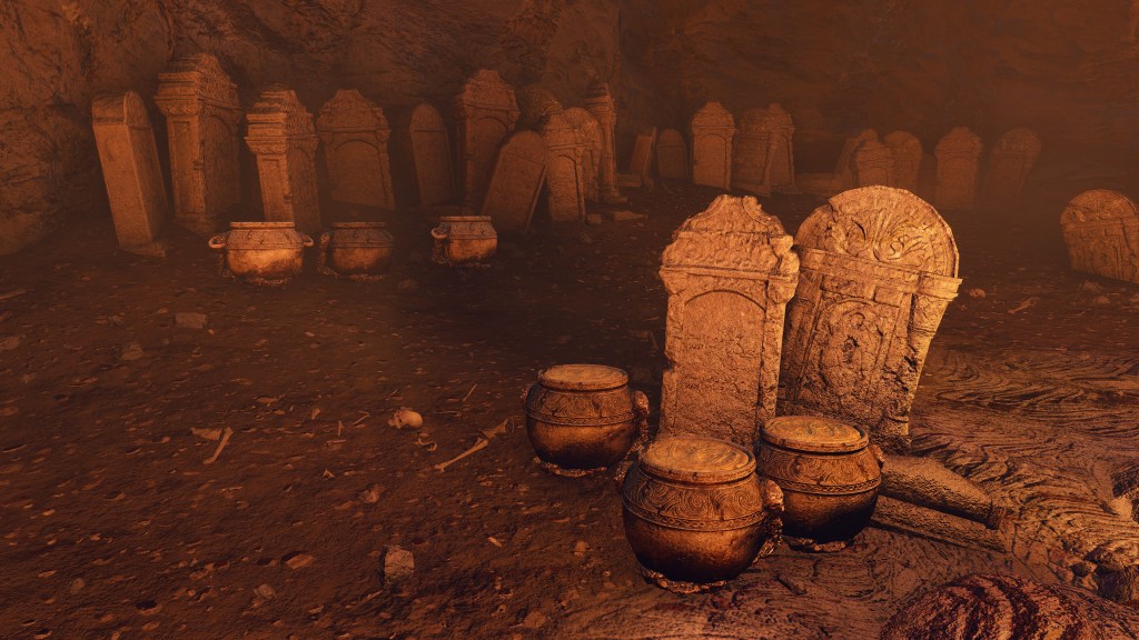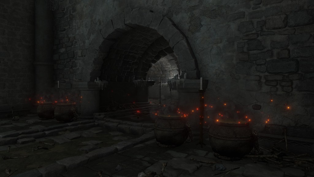 All of this can be explained by the Eternal Queen’s involvement. As noted previously, the Auriza Side Tomb has the signature Marika touch with its layers of deceptively similar floors, but the mischief to the catacomb’s design goes beyond that. To further disorient grave robbers, traversal between the different levels and chambers is accomplished by a plethora of warp chests, the web of magic turning the place into a labyrinth to navigate. The implementation demonstrates the god’s direct involvement in the magic employed throughout. In that case, the magic flame and lightning more than likely dates this to after Radagon’s mastery of sorcery and incantations, applying that knowledge to the construction of the new catacomb. Both halves were contributing to a new burial place for the Auriza. But why? If they were heroes, the Hero’s Grave sufficed. If they were not, the Leyndell Catacombs did. In either case, why stuff so many in pots? Perhaps because they overwhelmingly couldn’t bury whole bodies.