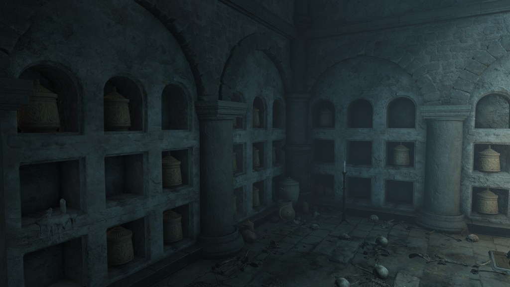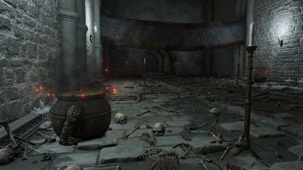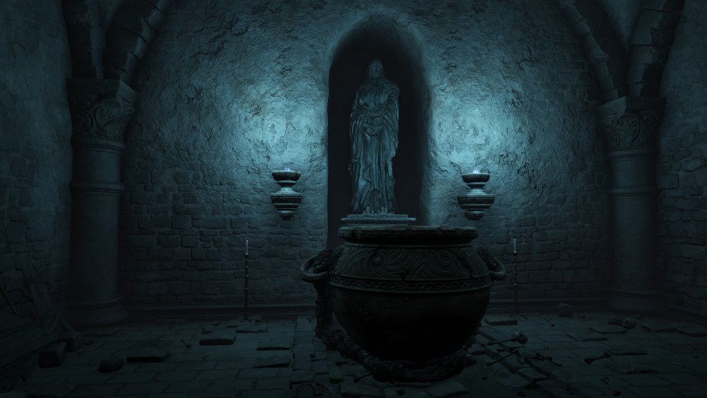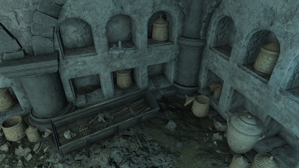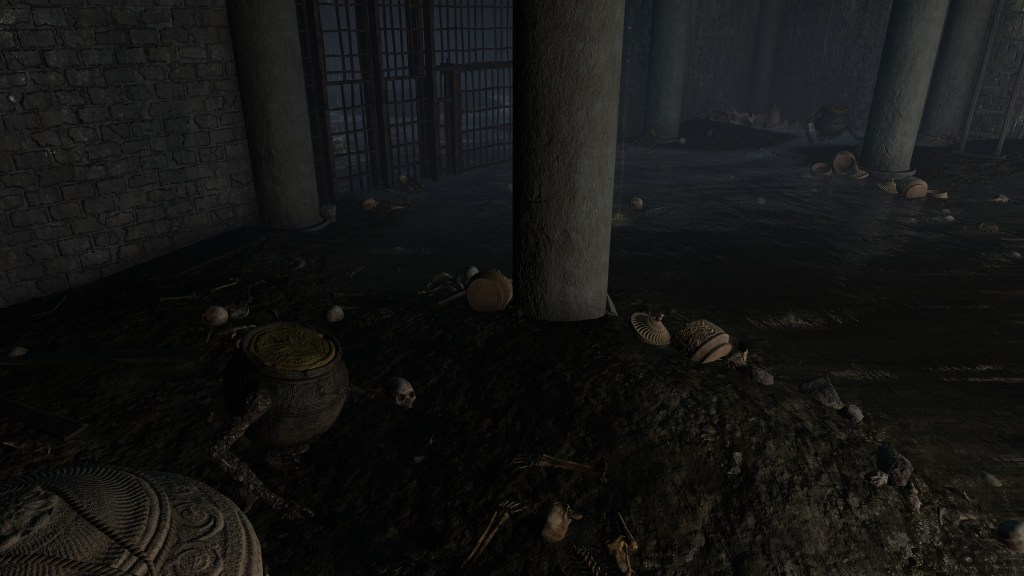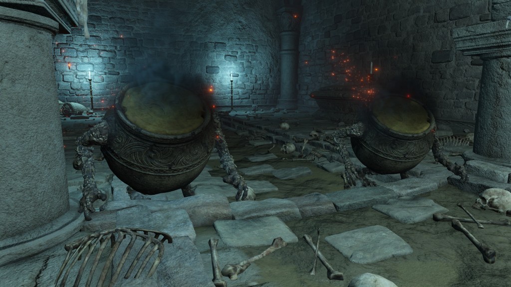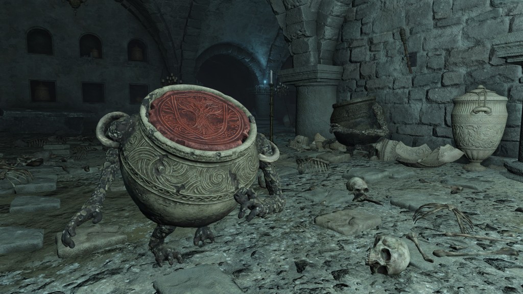 All of this can be explained by the Eternal Queen’s involvement. As noted previously, the Auriza Side Tomb has the signature Marika touch with its layers of deceptively similar floors, but the mischief to the catacomb’s design goes beyond that. To further disorient grave robbers, traversal between the different levels and chambers is accomplished by a plethora of warp chests, the web of magic turning the place into a labyrinth to navigate. The implementation demonstrates the god’s direct involvement in the magic employed throughout. In that case, the magic flame and lightning more than likely dates this to after Radagon’s mastery of sorcery and incantations, applying that knowledge to the construction of the new catacomb. Both halves were contributing to a new burial place for the Auriza. But why? If they were heroes, the Hero’s Grave sufficed. If they were not, the Leyndell Catacombs did. In either case, why stuff so many in pots? Perhaps because they overwhelmingly couldn’t bury whole bodies.