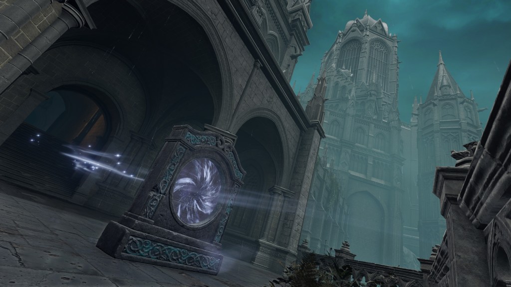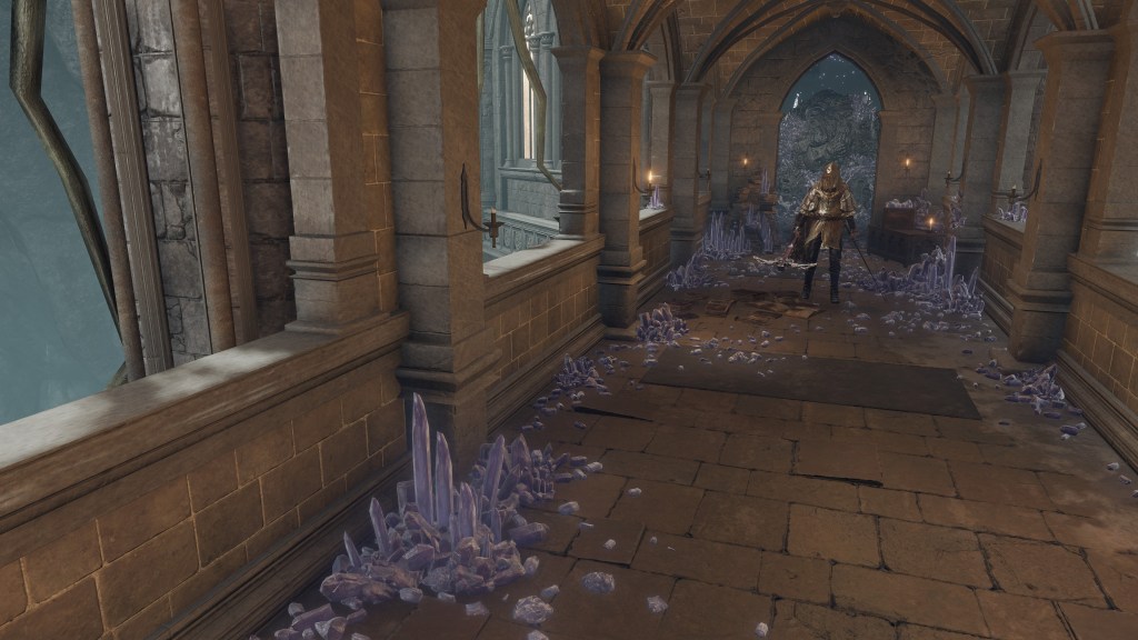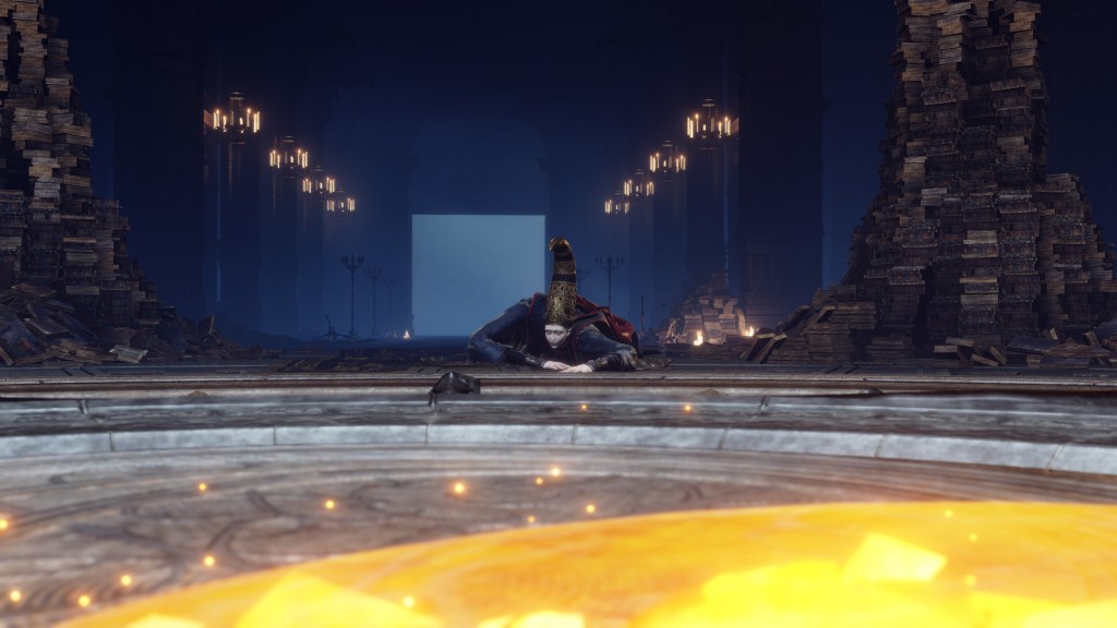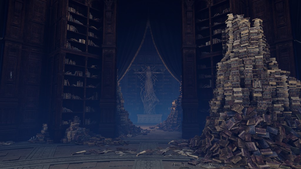 Rennala’s lingering attachment to Radagon is obvious from the Elden Lord’s statue in the boss room, a reminder of who she is experimenting for. Even before he arrived with her gift, she had likely already been yearning to reunite. Outside the Grand Library, we find a warp gate to the Church of Vows, which has since fallen into ruins. Clearly, the building hasn’t received regular visits, and thereby support for maintenance, for some time, yet Miriel has heard of what became of Rennala and Radagon. Therefore, the church didn’t fall into total neglect until well after the two’s separation — naturally, after their vows were broken, the place slowly lost relevance to pilgrims. And given the warp gate’s location, it is likely that Miriel saw the Full Moon Queen among the last to come by whenever she couldn’t even pretend to focus on work at the academy, wanting instead to revisit happier times when it seemed that husband and wife would be together forever. How then would the witch react to that same husband coming back with a request? Ecstatic, especially if her beloved was offering a chance to restore their union.