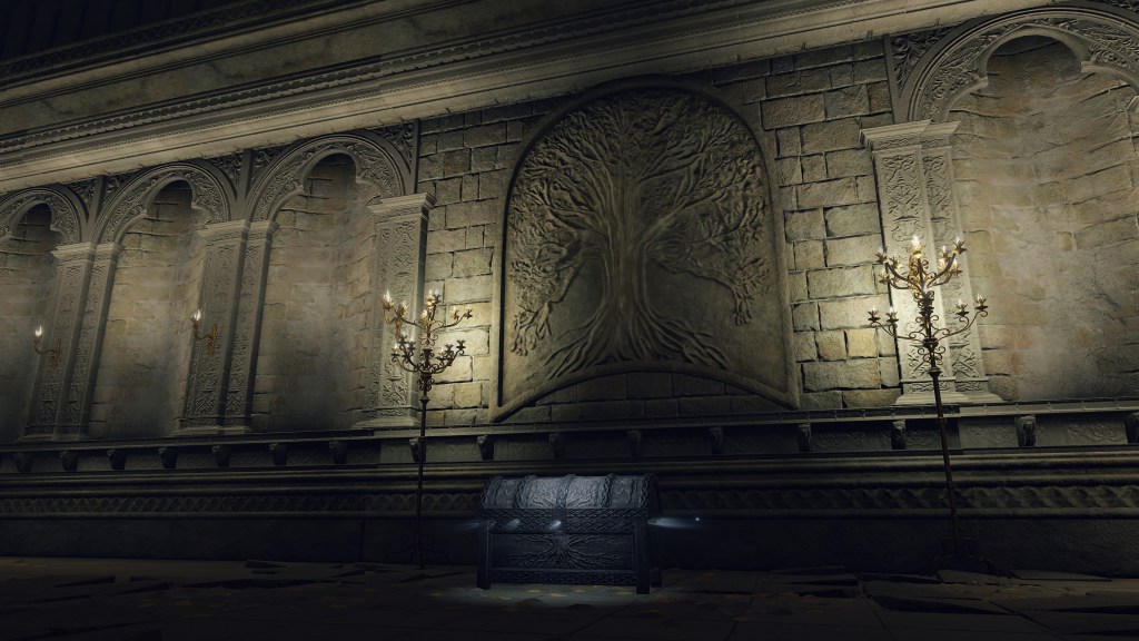Currently, several foot soldiers squat within the ruins, a commoner corpse in front of them carrying a bundle of lightning greatbolts tipped with gravelstone — presumably taken from the adjacent collection littered among the Sacred Tear’s golden flowers. This in itself isn’t odd, since the nomadic merchant beneath the church sells the smaller lightning bolts on top of a cultist’s instructions for crafting simple lightning pots. Many visitors to the old battlefield have probably experimented with the leftover gravelstone or vast field of fulgurblooms, especially after the Shattering. But why place it around the Erdtree’s blessing in a chalice? Another curiosity is the chest in a corner, behind the foot soldiers, containing Dragonbolt Blessing. Whether this incantation text was already stored there or collected by the soldiers, it begs the question: what is it doing there, disconnected from Leyndell? After all, it is a prayer belonging to the royal capital’s ancient dragon cult. But if it is somehow linked to Radagon, then he might have played a role in creating the incantation.