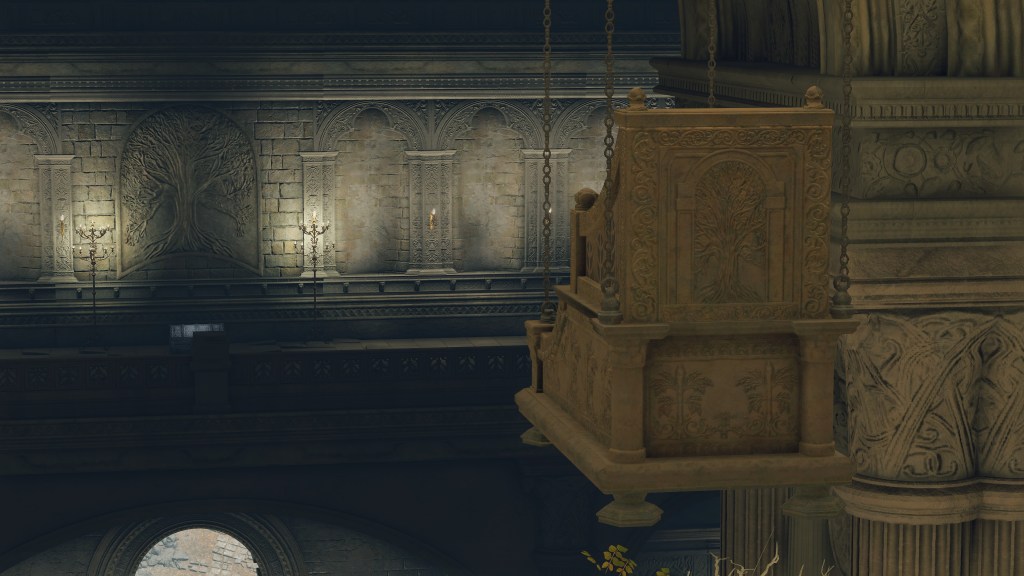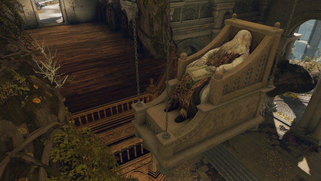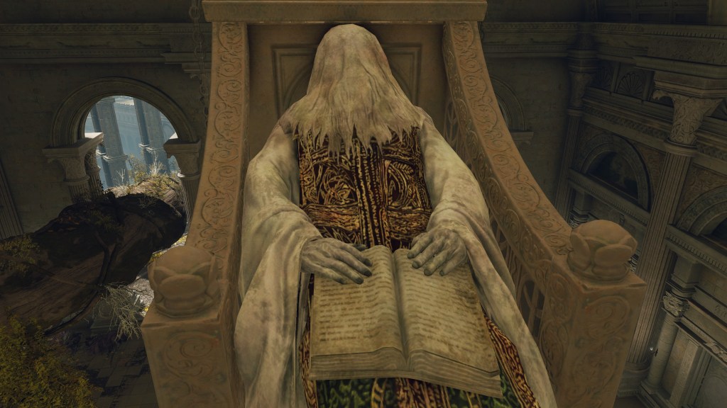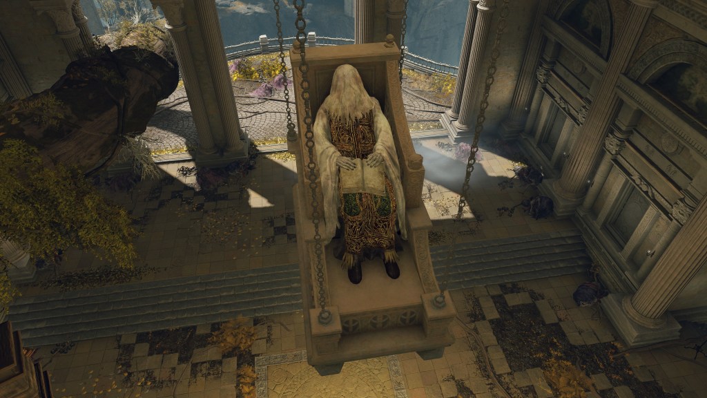 Naturally, the priesthood was the first to be enlightened with these teachings. We acquire the Golden Order Principia from a corpse suspended within the Erdtree Sanctuary. Although a cloth obscures the face, the apron confirms the person seated to be a priest in the midst of reading the open prayerbook detailing the Law of Regression. The hanging chair is oriented toward a chest on the second floor containing the Erdtree Bow beneath a relief of the tree in question. The meaning is clear: the cleric looks upon the Erdtree’s past left to rot whilst embracing the flourishing future of the faith. Godfrey’s war is the “old age”, and it was time for Marika’s ministry to put those unruly times behind them — Radagon had, literally, elevated the golden above such childish ideas of Order. Chaos regresses to the immutable, thereby civilization must graduate from base thinking to achieve a high-resolution perspective on the world. And circulating that message fell to the clergy.