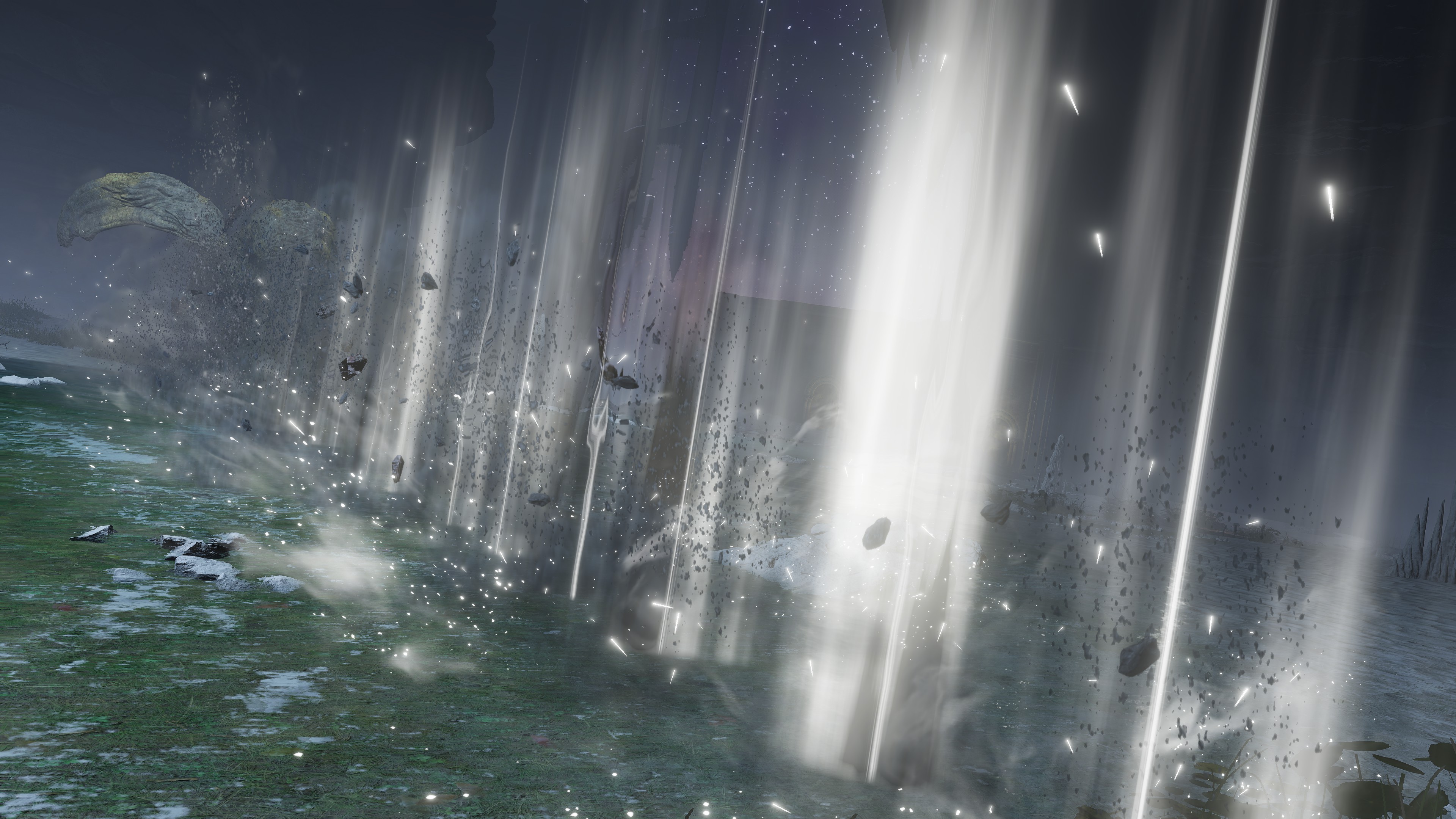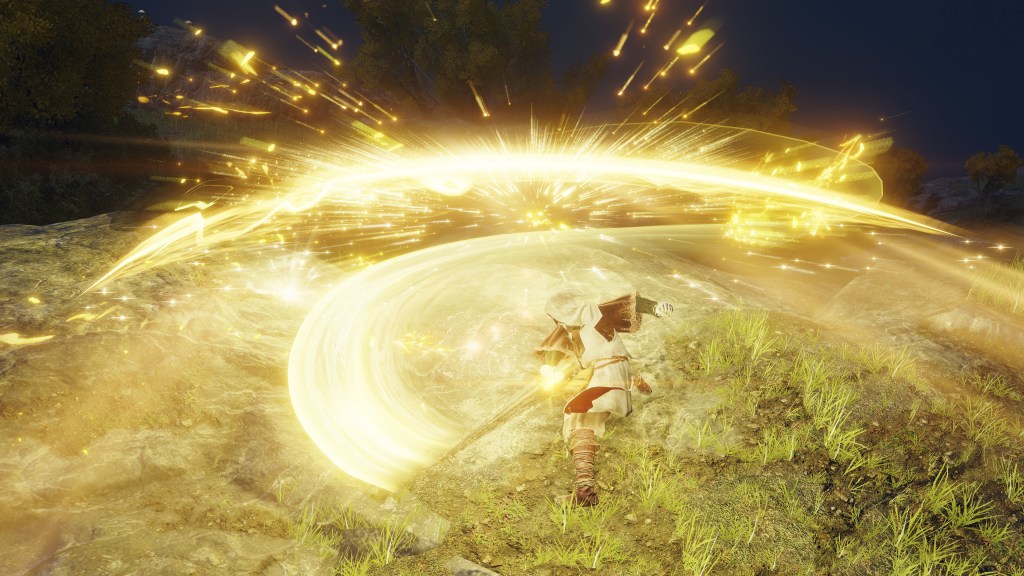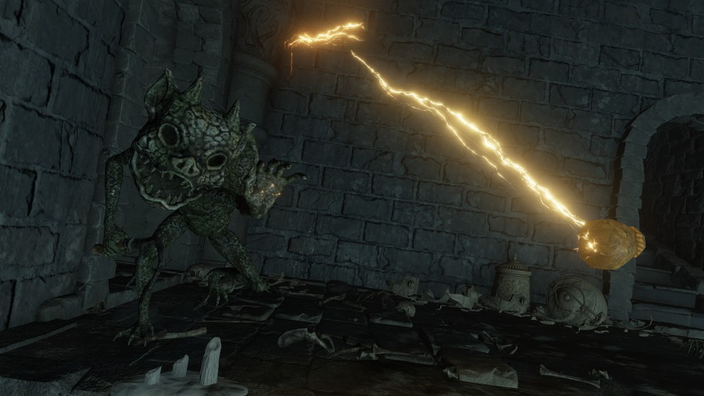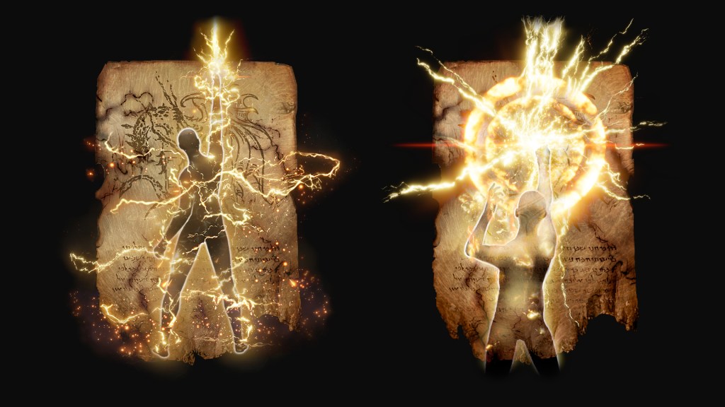 “Stormcaller” Church is designated after the golden lightning which continues to rain down upon the battlefield thanks to the fulgurblooms. Paralleling those flowers, Dragonbolt Blessing calls lightning to envelope the caster’s entire body, granting the eponymous “divine protection of dragon lightning” (竜雷の加護) to the person. This electric field better keeps out various threats, though it also makes the user all the more vulnerable to similar bolts of light. Strangely, it is the only incantation of the cult to be considered “superior” despite demanding less faith than more standard prayers like Honed Bolt or Lightning Strike. Not even more powerful incantations using primordial red lightning benefit from such a descriptor. In that case, what makes this “blessing” stand out from the rest? It conjures lightning which does no immediate harm to the person struck. Just like fulgurblooms, the caster becomes a lightning rod with which to channel the draconic power. Someone masterful left that text behind.