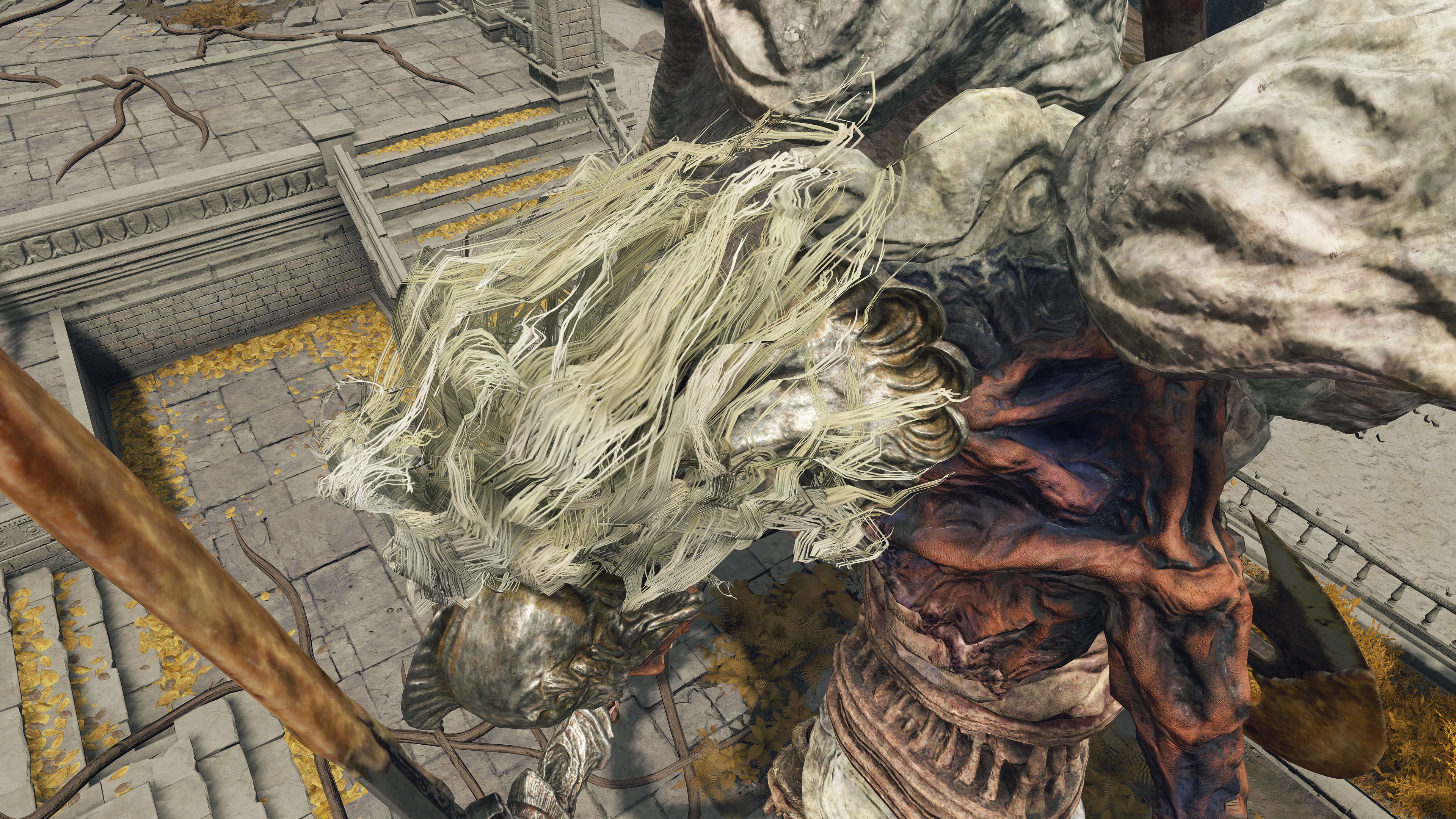 The perfumer connection puts the gargoyles’ creations squarely within clerical circles, who follow Marika and Radgon’s direction. And where did they procure their cadavers? From warriors of the prior age. The hero gargoyles’ blond hair is consistent with affiliates of the royal capital, royalty included. The Vacuum Slice performed with their swords is likewise a “lost” skill of “old” heroes, the force to cleave air into a deadly vacuum evocative of the power wielded by soldiers in Godfrey’s day. Adding to that impression, gargoyles equipped with an axe perform an empowering warcry, their bodies emanating a similar aura as the first Elden Lord before their earth-shattering assaults. (and in Elden Ring: Nightreign, his grafted descendant produces a similar aura when performing Crucible arts) Everything indicates that they are Leyndell residents whose strength came in part from mimicking the Warlord. In other words, they are the Auriza who fought alongside him.