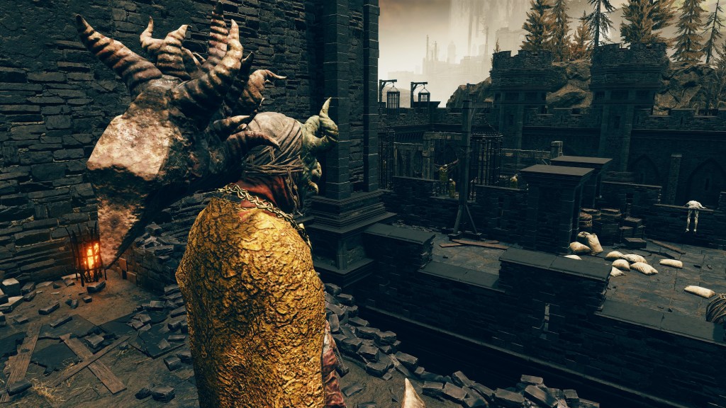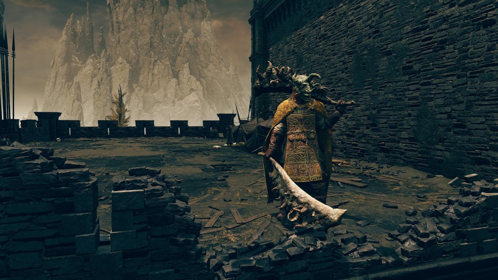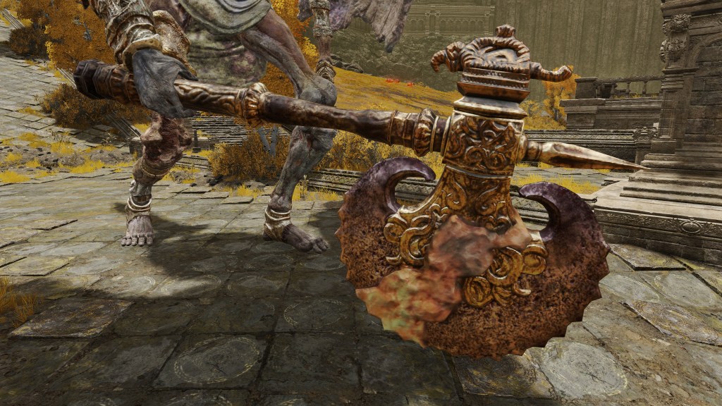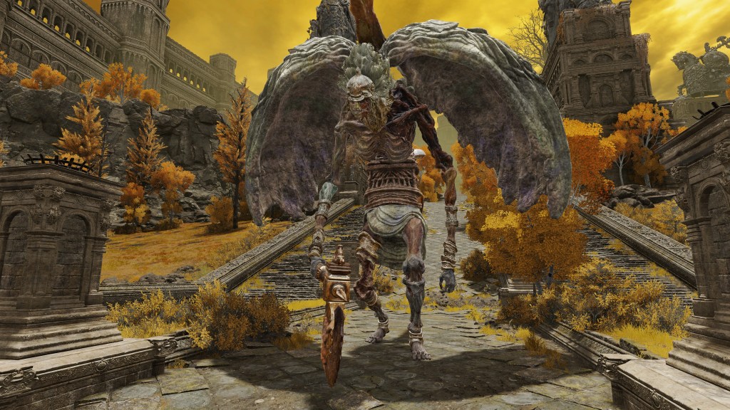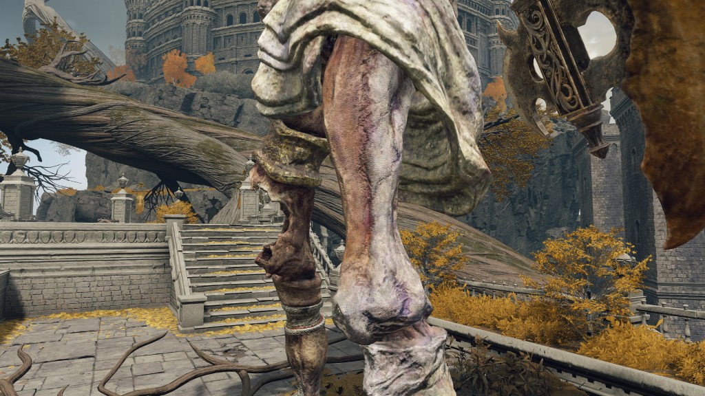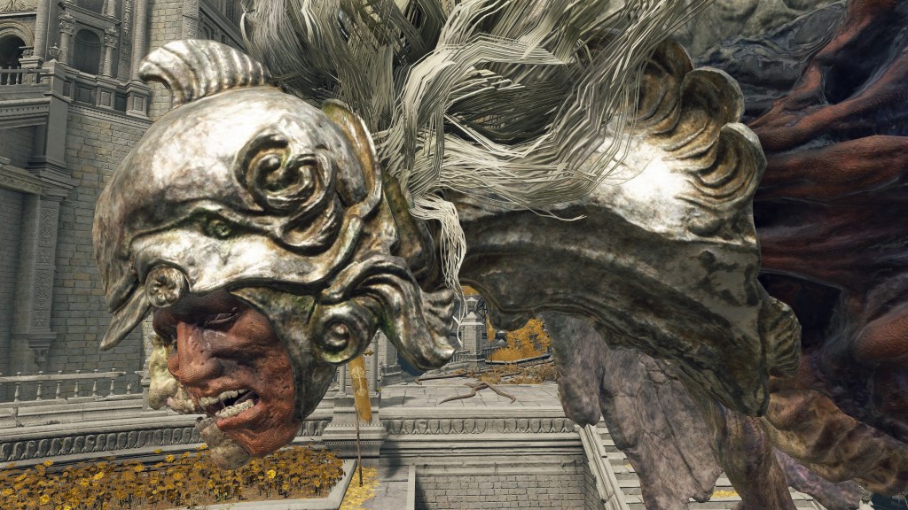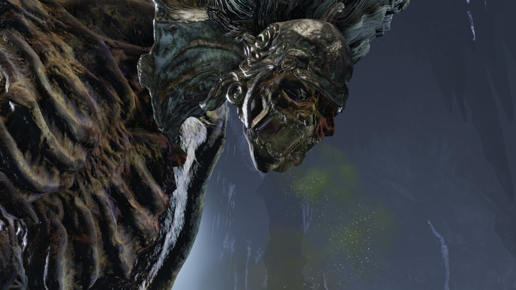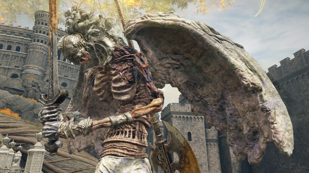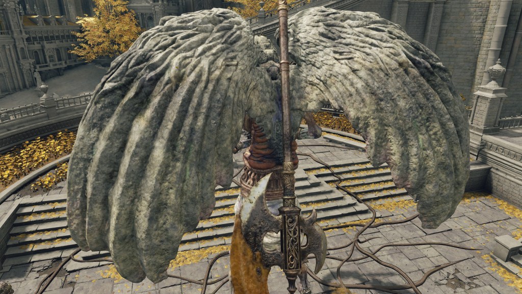 The valiant gargoyles in service to Leyndell are, as the name implies, heroes whose destroyed bodies and weapons have been put back together into a Frankenstein monstrosity. The different sources for the corpse parts is obvious from the two heads in one, with clear delineation between the “red” and “gold” bodies comprising the singular entity. Where the pieces don’t exactly fit, corpse wax is used to fill in the gaps. This patchwork of heroes appears to then be reanimated via some arboreal necromancy — dismember them, and the limb stubs begin regrowing root-like structures. The reanimation likely relates to perfuming specifically, as certain gargoyles vomit out the spark aromatics or poison spraymist of perfumer kind. Equipped with bronze armor and armaments, these undead heroes are subsequently made into guardians. The only reason to call them gargoyles is the stone wings and skirt grafted onto the desiccated cadavers, more or less petrified. Beyond the fact that the wings are functional, there is little mystery to their nature, and the same holds true for their origins.