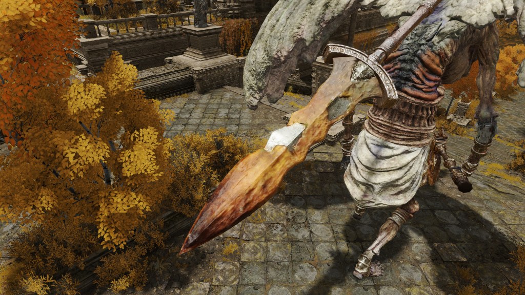 Even if anyone could embark on this pilgrimage, it was still easiest for residents of Altus coming down the Grand Lift of Dectus. This was perhaps inevitable, since all roads led to Leyndell, but the heartland would be most receptive to Radagon’s gospel. This holds true even ignoring the blue bloods. Although all living knights of Leyndell we encounter are ancient dragon cultists, a portion did embrace Fundamentalism. Such fundamentalist knights temporarily imbue holiness to the weapons of themselves and others through skills like Sacred and Shared Order. Their ashes of war are acquired from a Night’s Cavalry along the Altus highway or a scarab on the outskirts of the plateau, so they do seem spread among the ranks. Naturally, Fundamentalism took the greatest hold of the royal guard in the capital, with their Treespear we acquire already possessing the Sacred Order skill. Even amongst the lower ranks, Immutable Shield features the soldiers’ kind in its menu graphic. Leave it to army men to see the practical applications of the message they had the privilege of hearing right there at ground zero.
