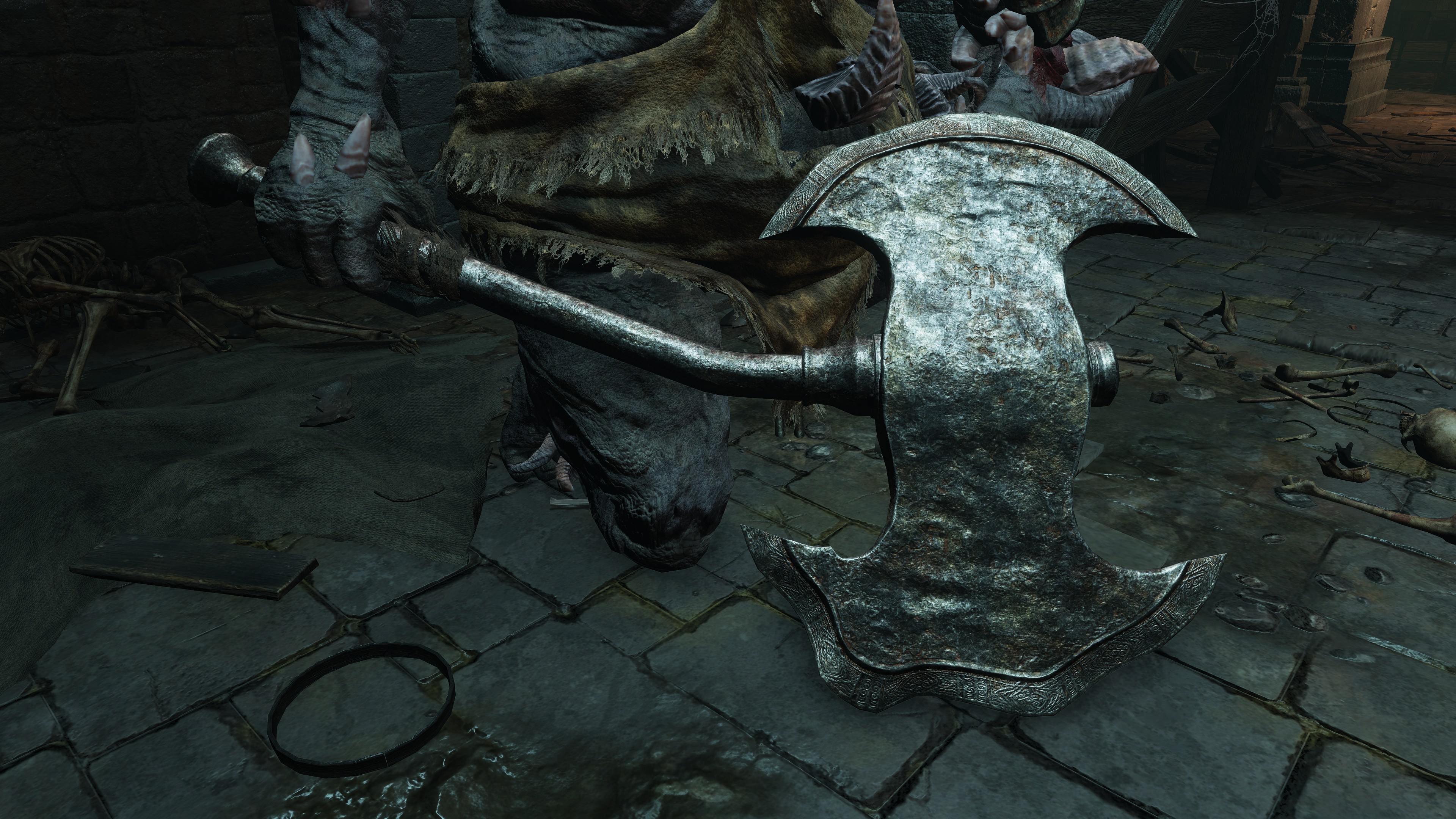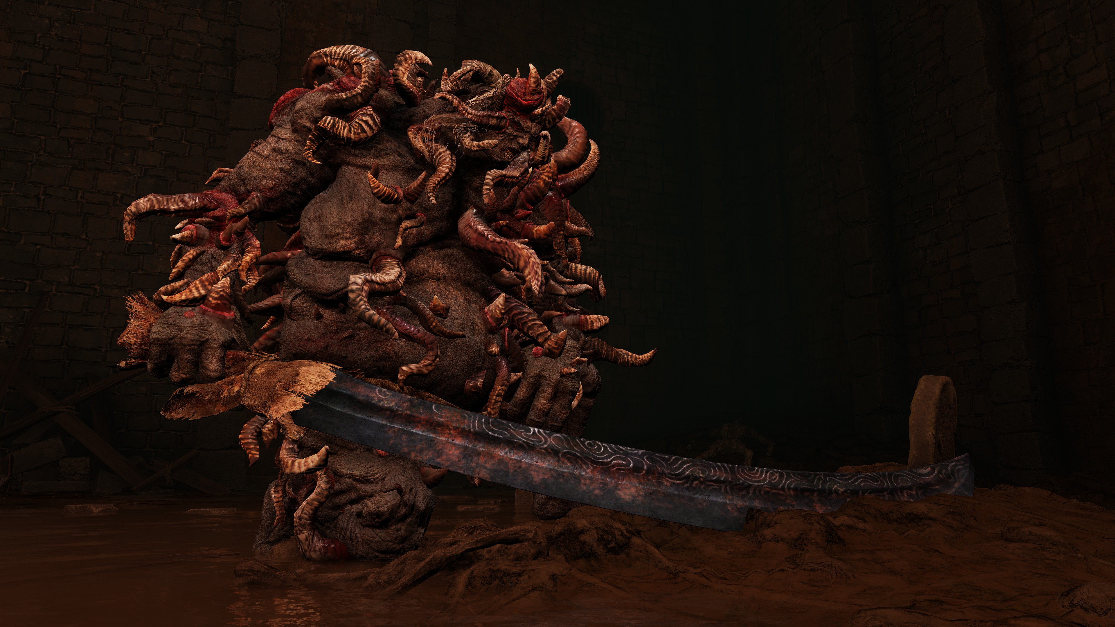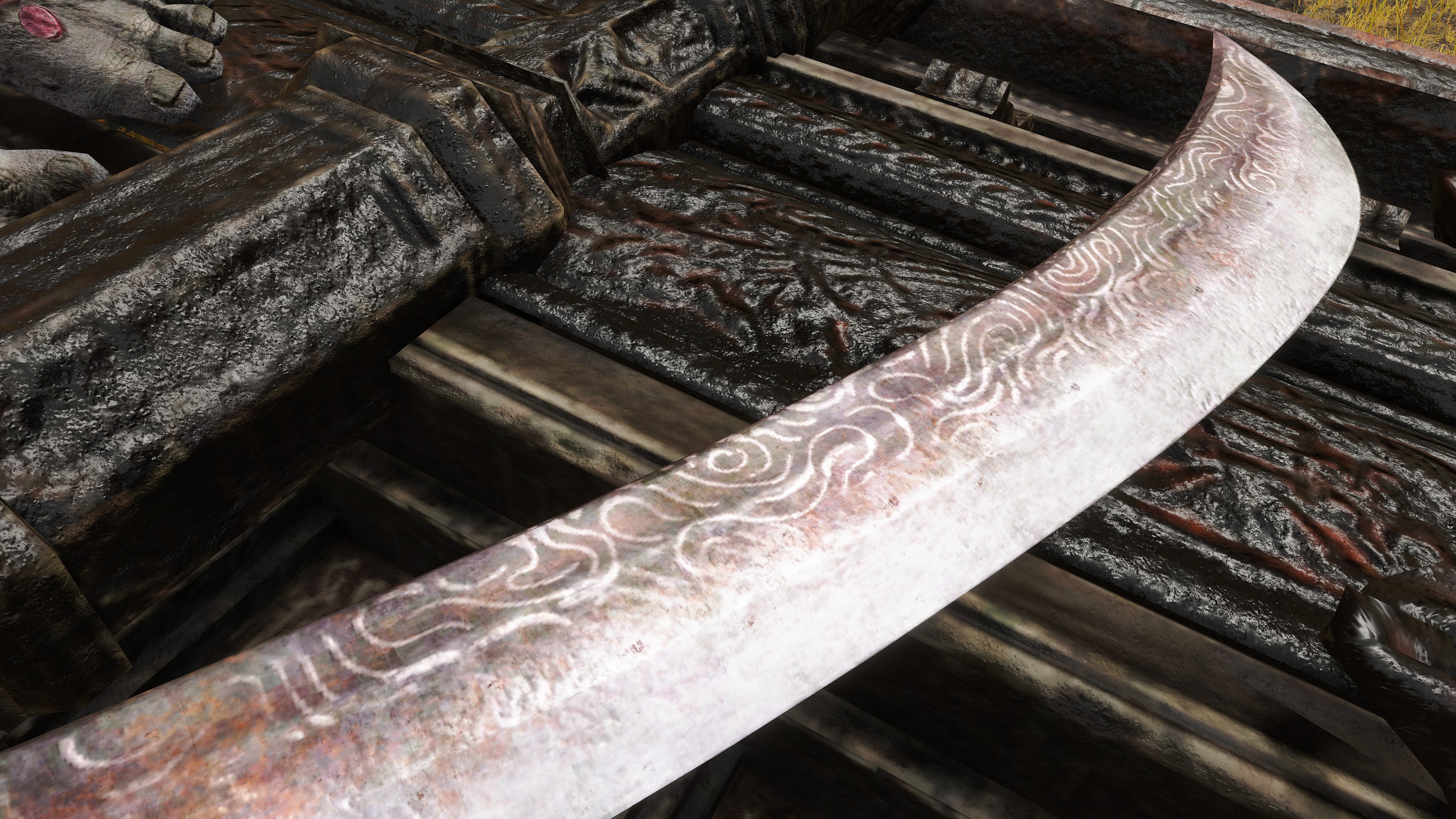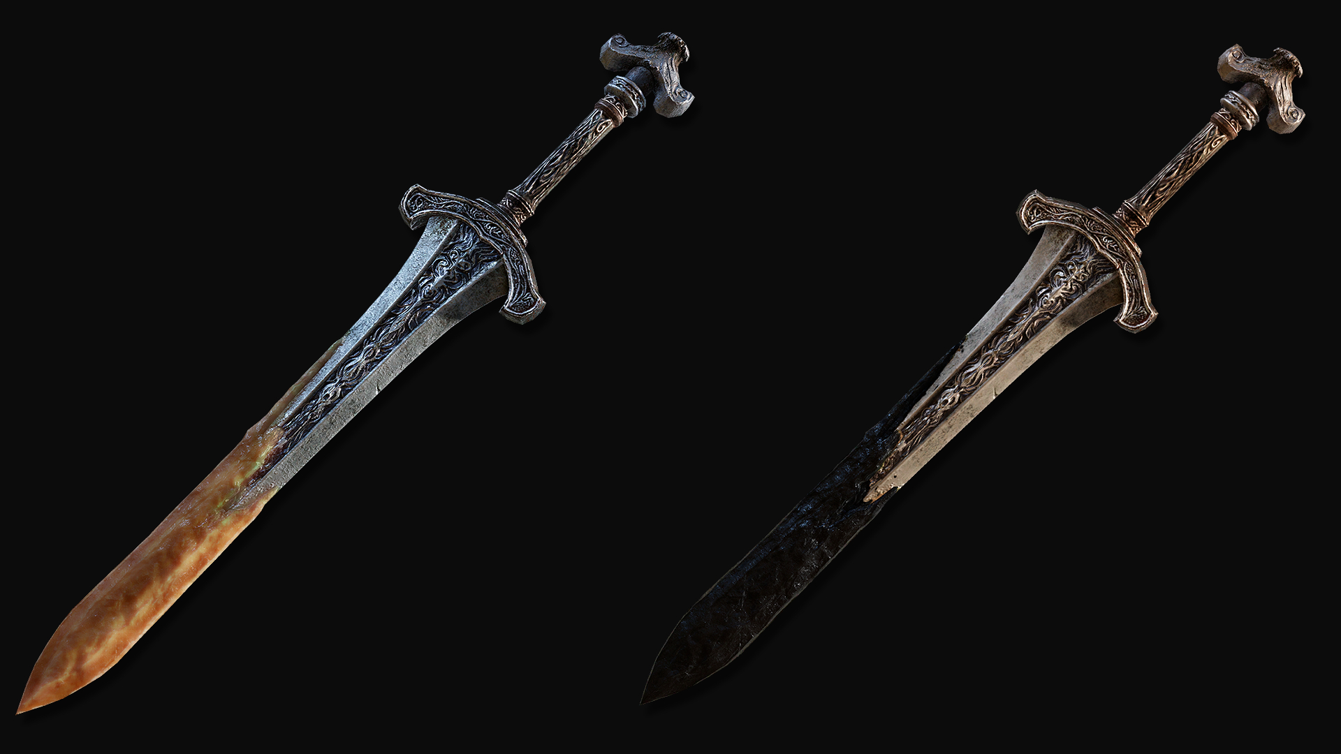 Bronze greatsword possessed by a Hero Gargoyle. Black one supplemented with corpse wax. Possesses attack power of the holy attribute.