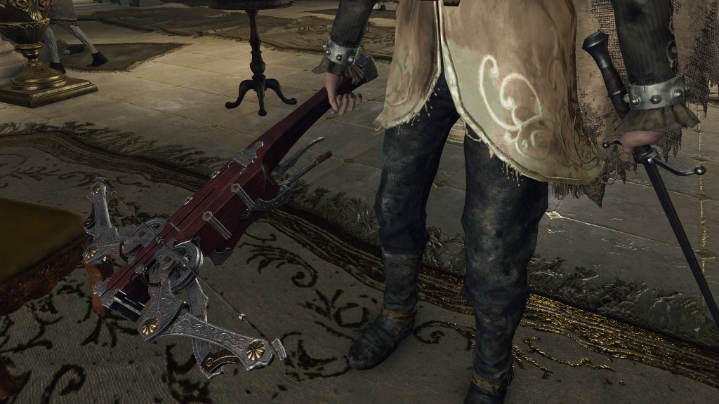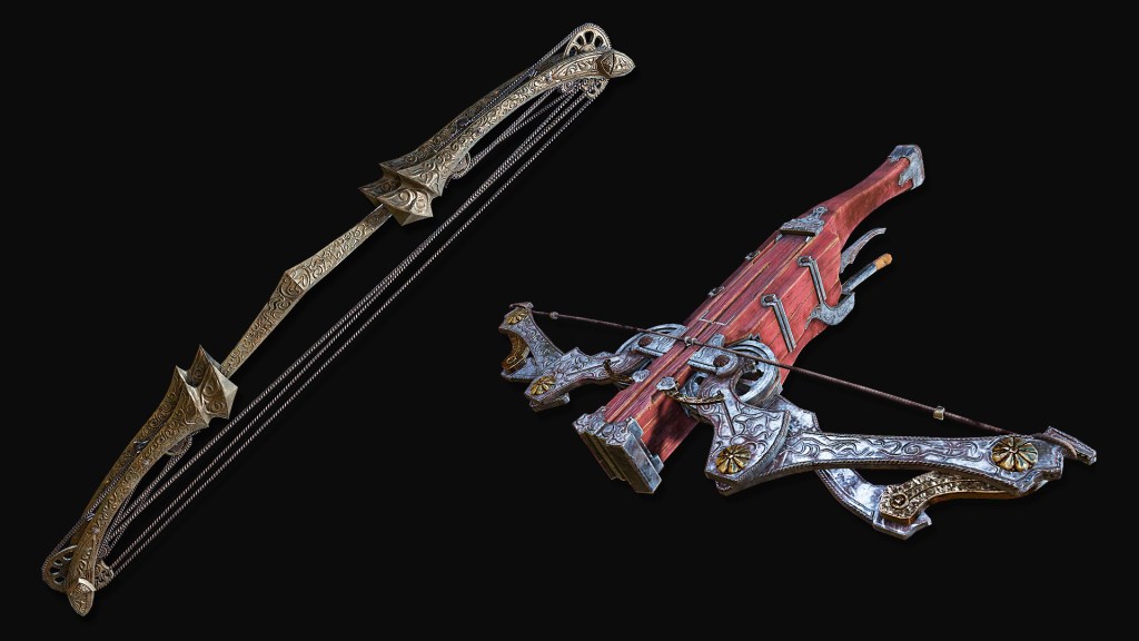 Golden Order fundamentalists supported the military in other ways. A certain genius and student of Fundamentalism applied advanced mechanical and mathematical knowledge to range weaponry. The complex pulley and springs this craftsman implemented made a bow shoot both farther and more precise and enabled a crossbow to fire a string of bolts in a single pull of the trigger. The latter became especially prized by the high-ranking nobility, their pages all replacing their Red Branch Shortbows with the Pulley Crossbow. Phasing out the bow may have begun as far back as the Crucible’s decline, since we see pages to even low-rank nobles using basic crossbows instead. But this would be because of their ammunition, every page shooting explosive Perfumer’s Bolts. Fire should have remained prohibited to the Erdtree’s servants until the Shattering — but leave it to the rich and powerful to make themselves the exception. Now those in the highest echelons of power were wholeheartedly embracing the latest trend from the king to stay relevant, upgrading their guard’s crossbows in kind.