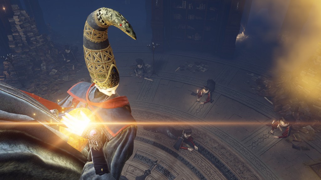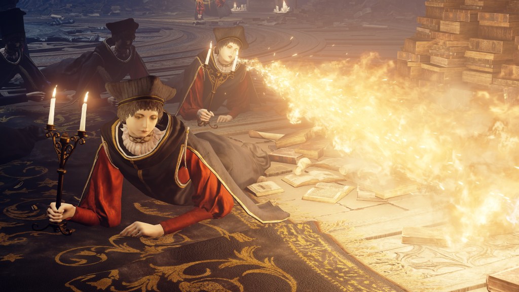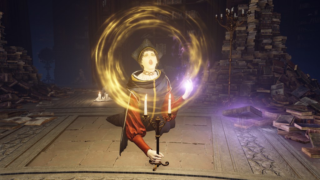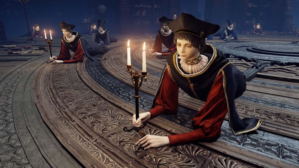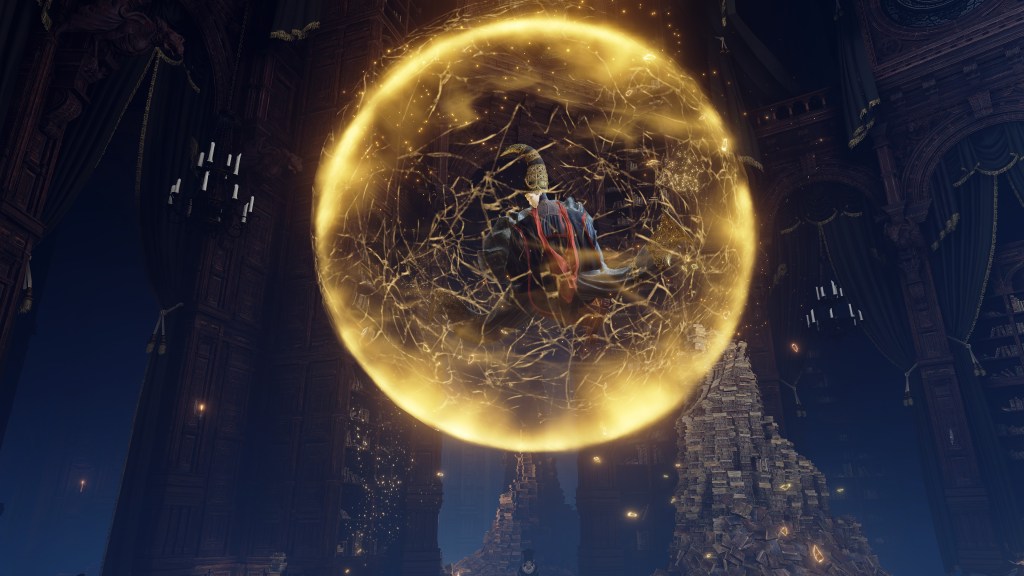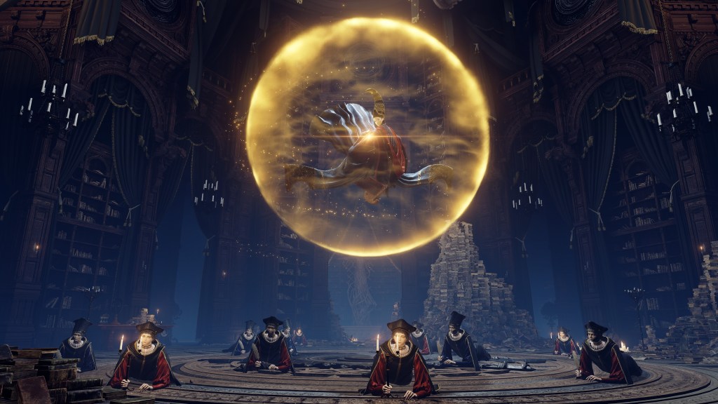 Granted, to be reduced to an ignorant slave dependent on the creator is horrifying in its own way. For example, throughout the initial fight, Rennala floats around protected by a golden barrier. The magic shell is powered by the egg in her hands but maintained by her children’s singing. Killing the chorus causes the barrier to shatter, disrupting her concentration long enough to leave her collapsed on the ground and briefly vulnerable. Once she recollects herself, she uses the egg to unleash a shock wave as she reforms the barrier and returns to mid-air. Meanwhile, her seemingly endless children blow streams of flame from candlesticks or telekinetically hurl books and fixtures at us. These once self-respecting sorcerers are now, for all intents and purposes, eager students, with quills in hand, dead-set on protecting their queen — all because they know her to be their mother and nothing else.