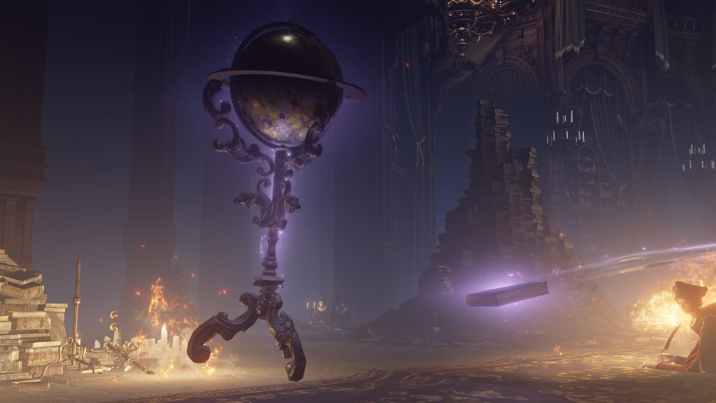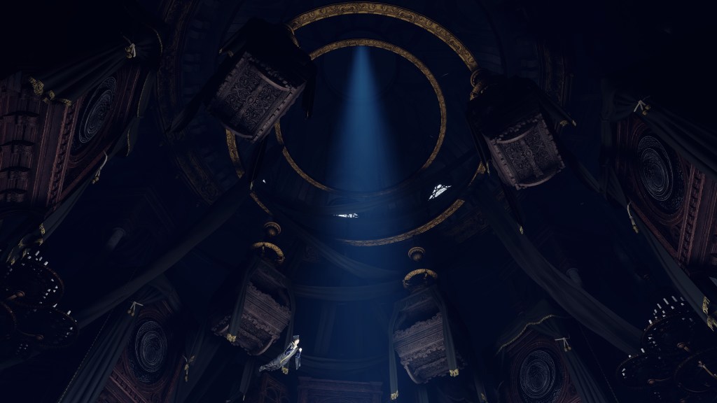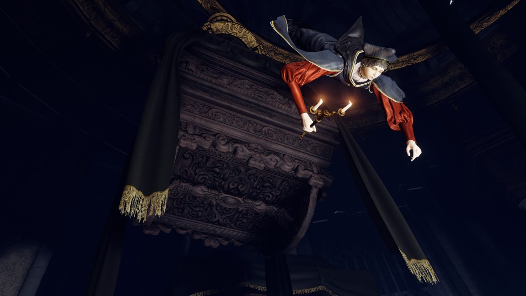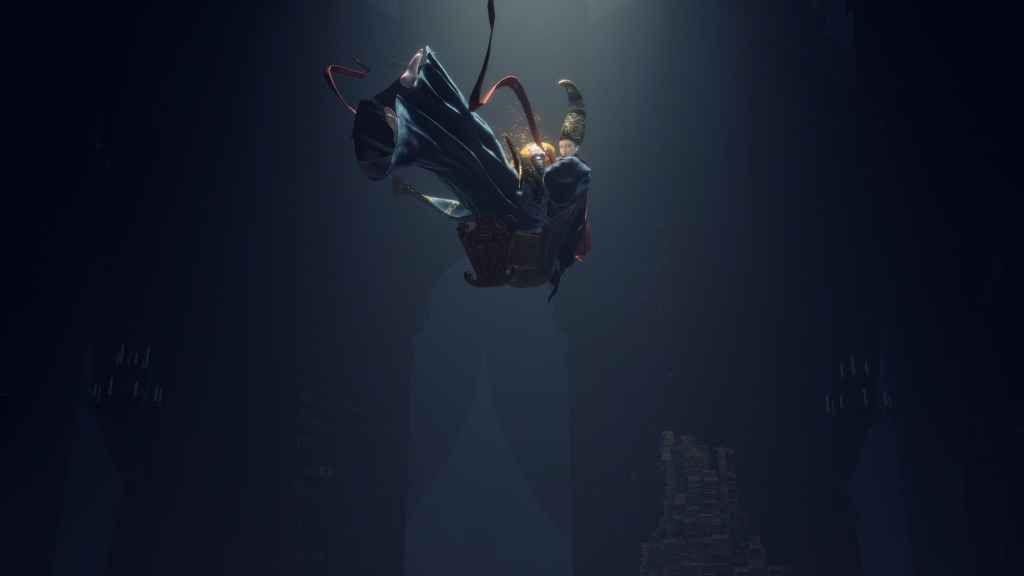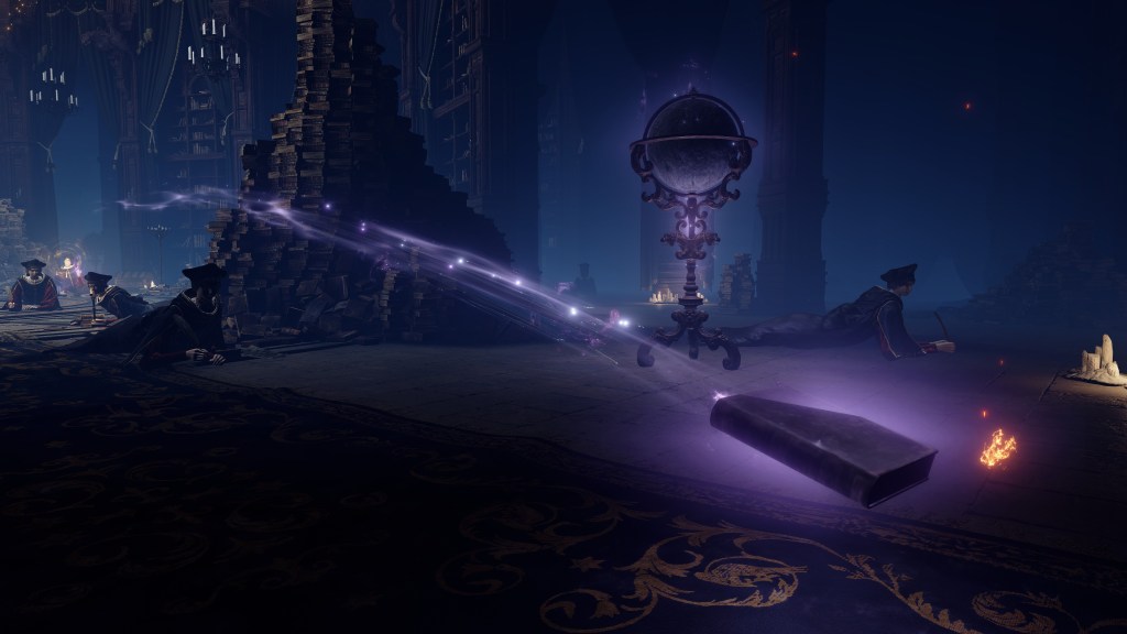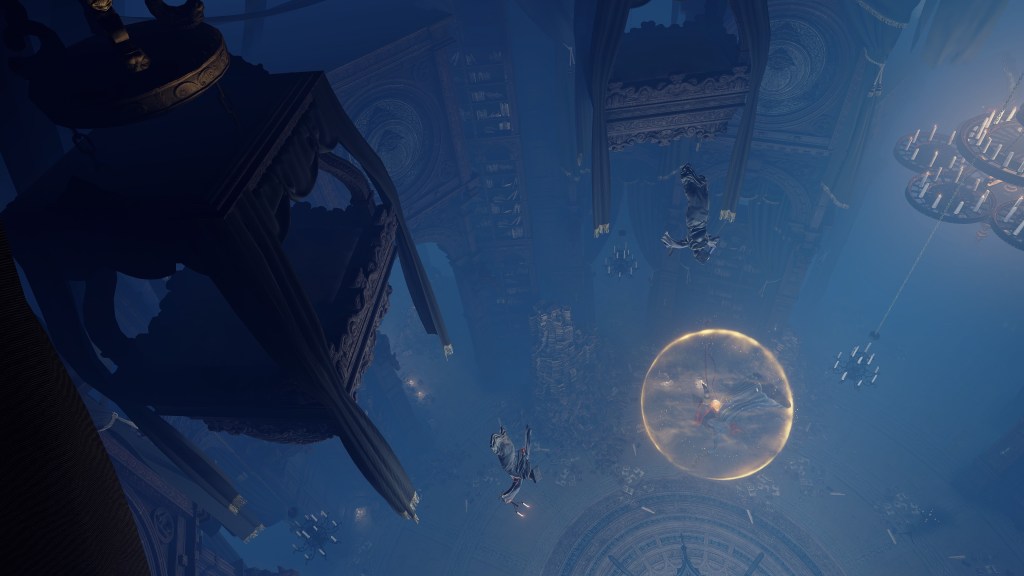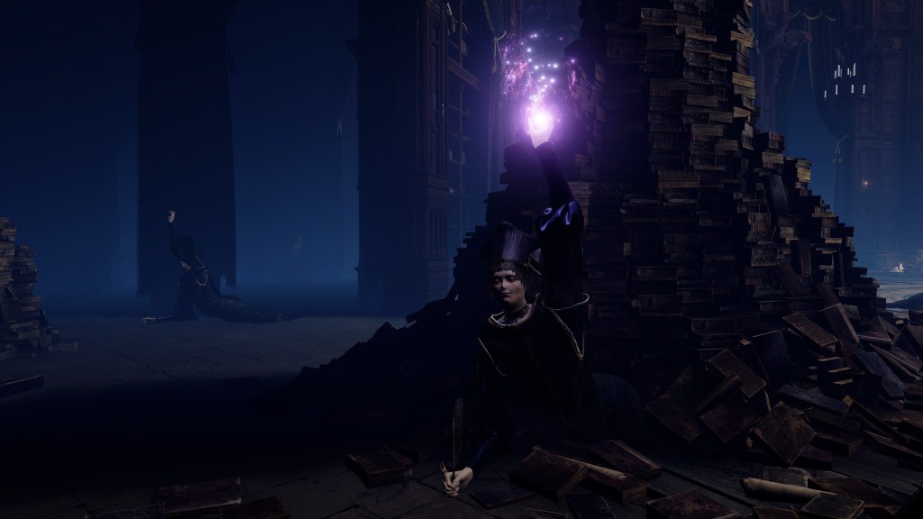 Granted, to be reduced to an ignorant slave dependent on the creator is horrifying in its own way. For example, throughout the initial fight, Rennala floats around protected by a golden barrier. The magic shell is powered by the egg in her hands but maintained by her children’s singing. Killing the chorus causes the barrier to shatter, disrupting her concentration long enough to leave her collapsed on the ground and briefly vulnerable. Once she recollects herself, she uses the egg to unleash a shock wave as she reforms the barrier and returns to mid-air. Meanwhile, her seemingly endless children blow streams of flame from candlesticks or telekinetically hurl books and fixtures at us. These once self-respecting sorcerers are now, for all intents and purposes, eager students, with quills in hand, dead-set on protecting their queen — all because they know her to be their mother and nothing else.